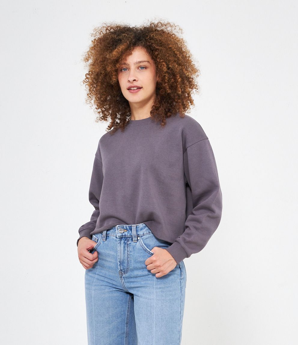 Felpa modello over con fondo a taglio vivo. Girocollo e polsi a costine.