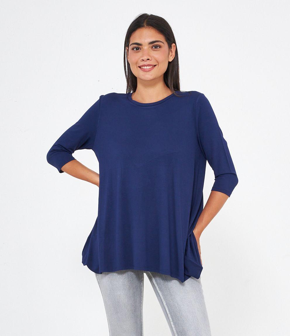 Maglia modello over in viscosa con scollo tondo e maniche a tre quarti.