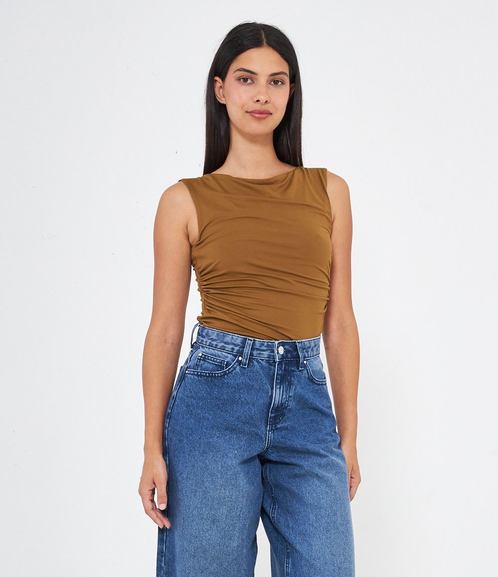 Body in tessuto elastico con arriccio laterale, scollo a barca.