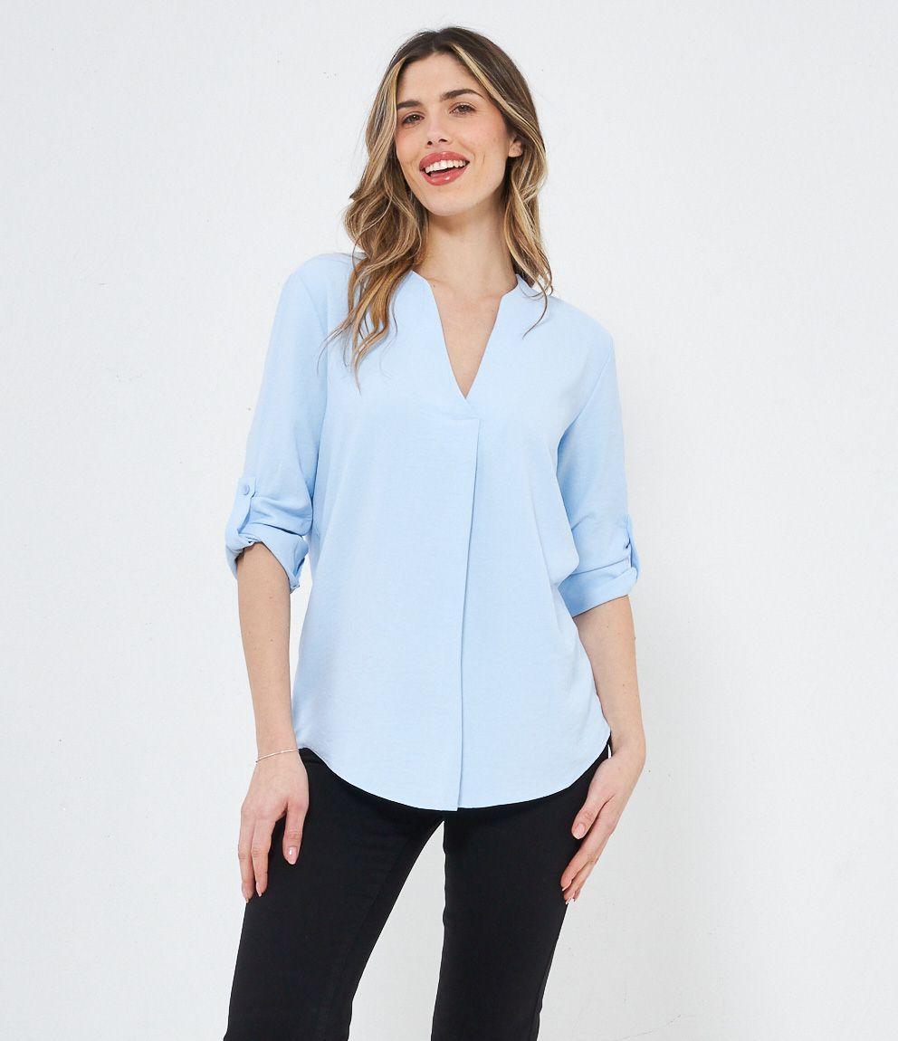 Casacca modello regular fit con scollo a V, maniche a tre quarti con risvolti e passante.
