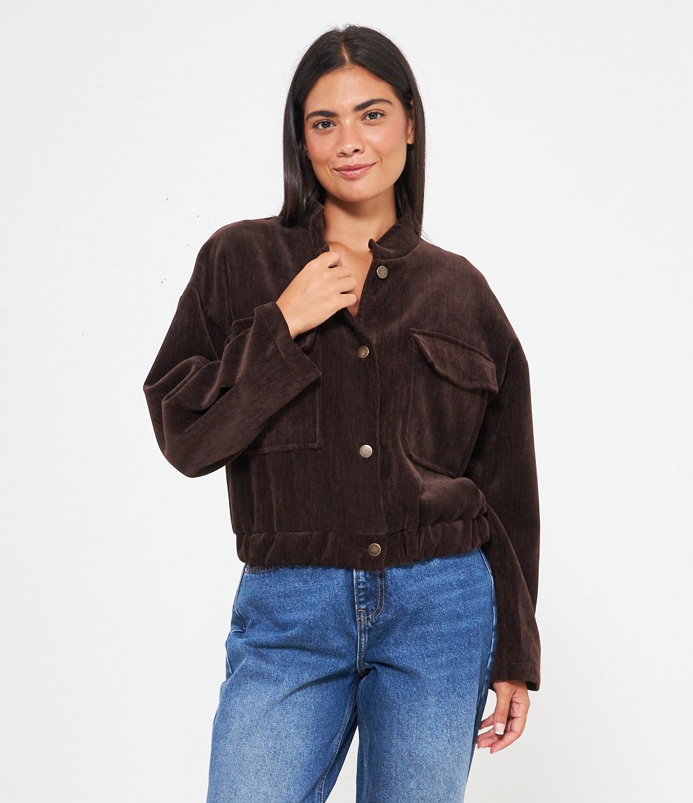 Giubbino effetto camoscio con tasche frontali e fondo elasticizzato. Chiusura con bottoni a scatto.
