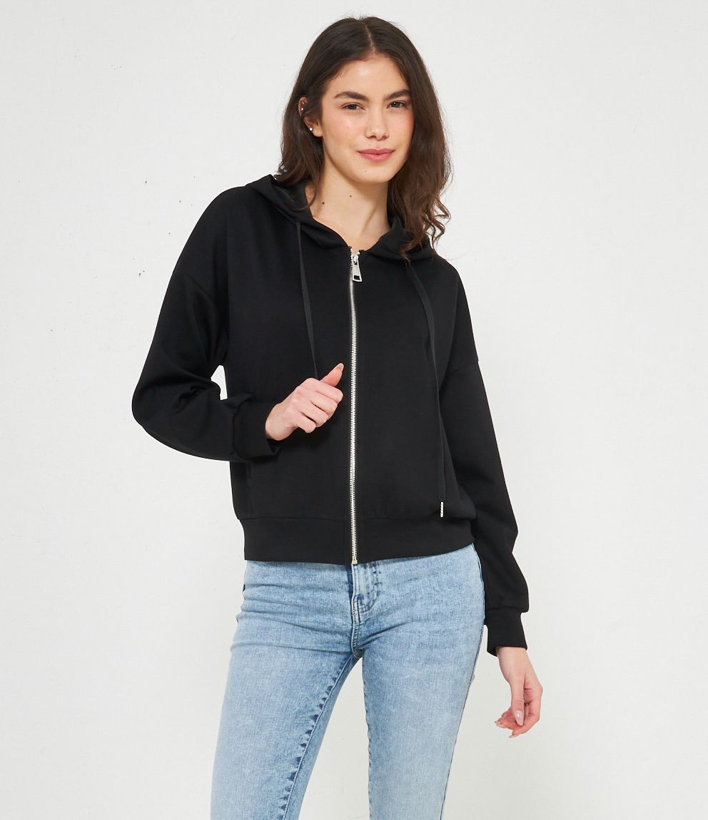 Felpa modello comfy con cappuccio e chiusura con zip.