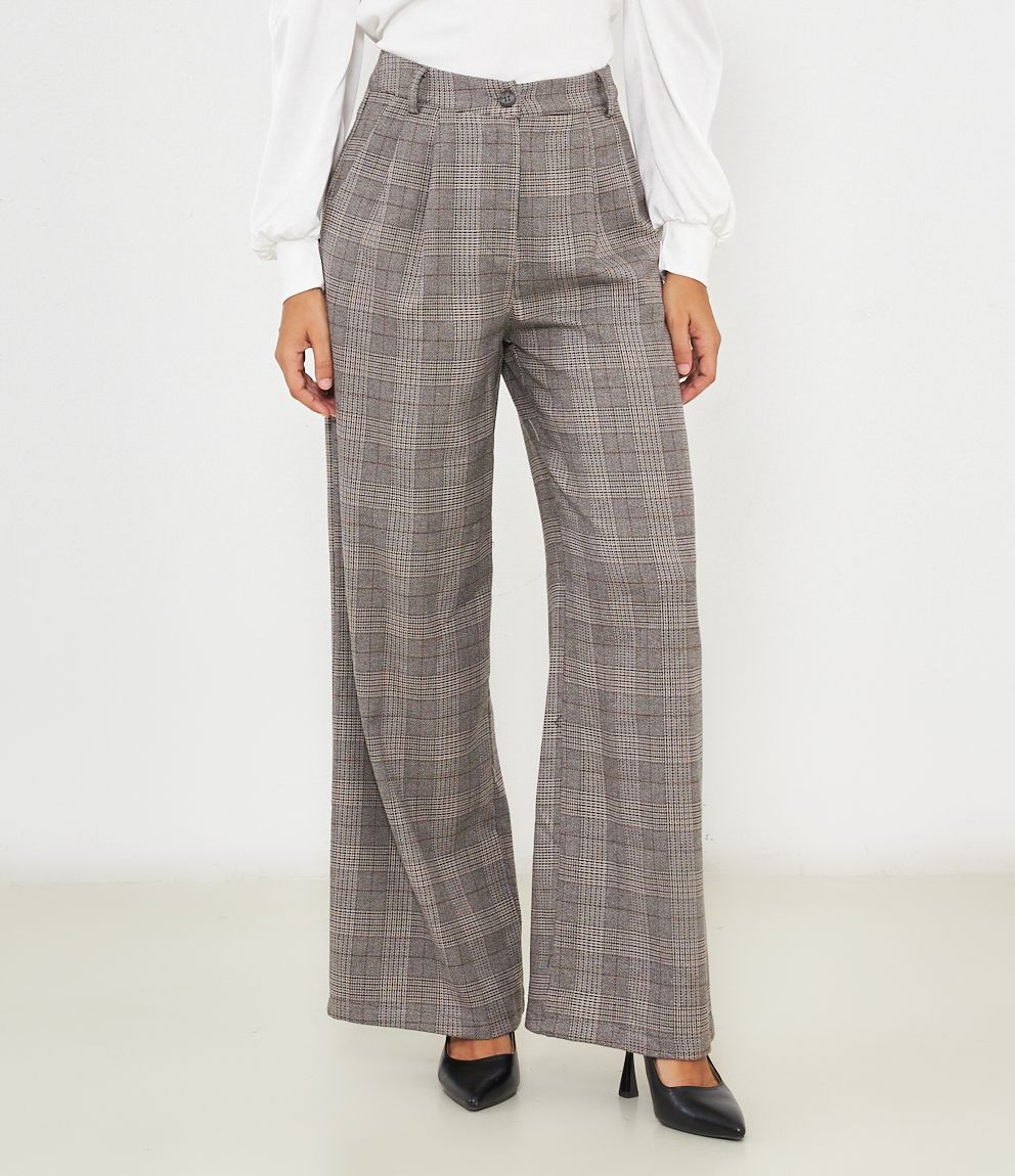 Pantaloni modello palazzo con fantasia a quadri, tasche laterali e chiusura con zip e bottone.