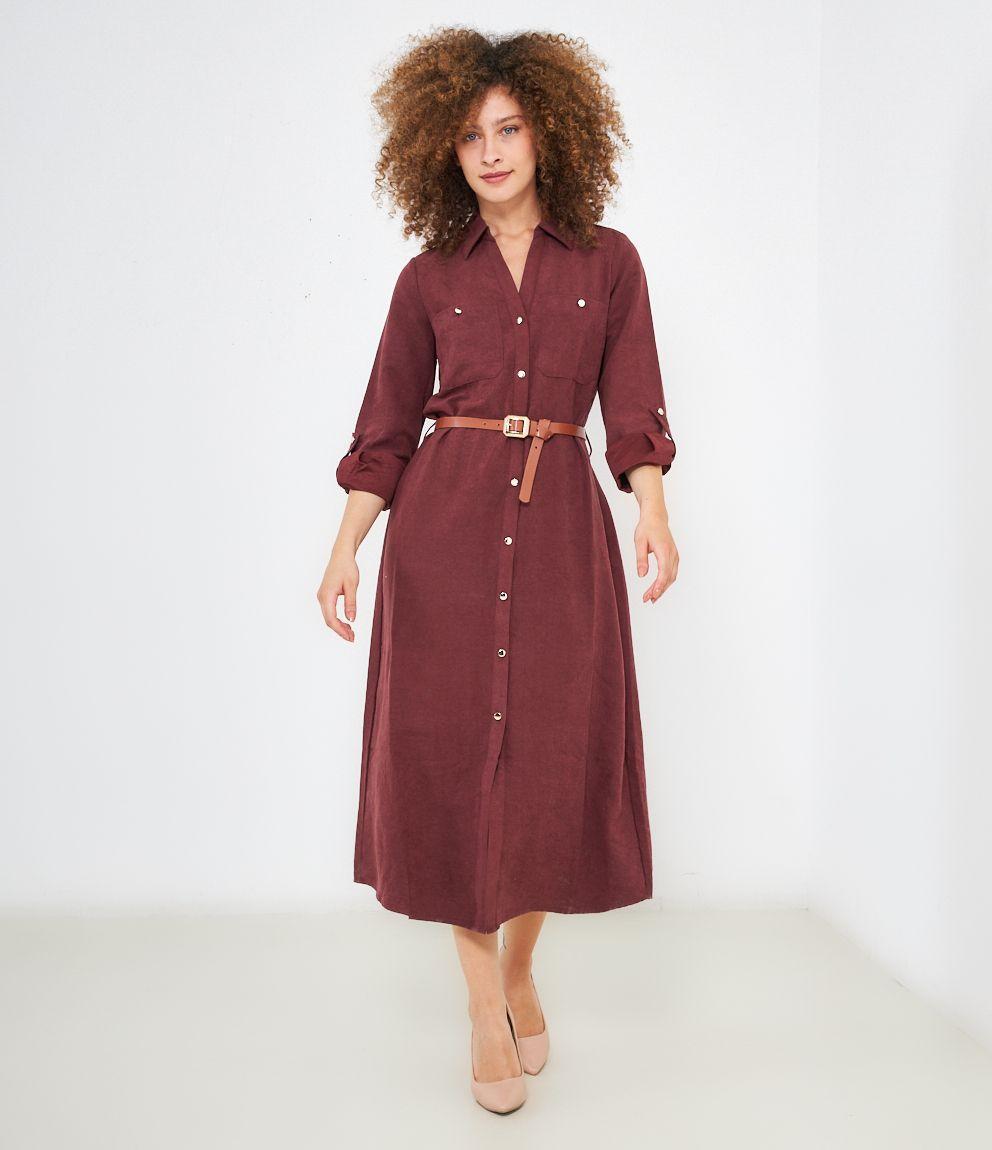 Abito modello chemisier midi, cintura in vita e maniche con risvolti e passante.