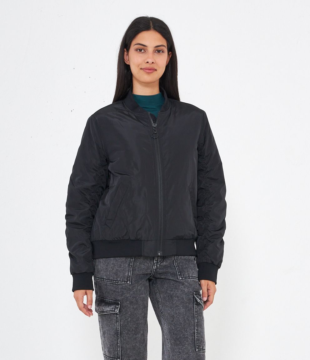 Giubbino modello bomber con zip frontale, tasche e bordi elastici a costine.