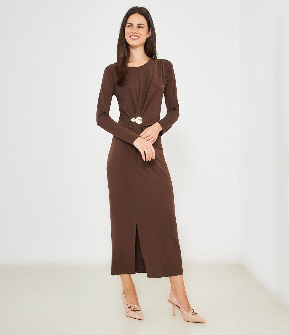 Abito modello maxi con dettaglio metallico laterale, scollo tondo e spacco.