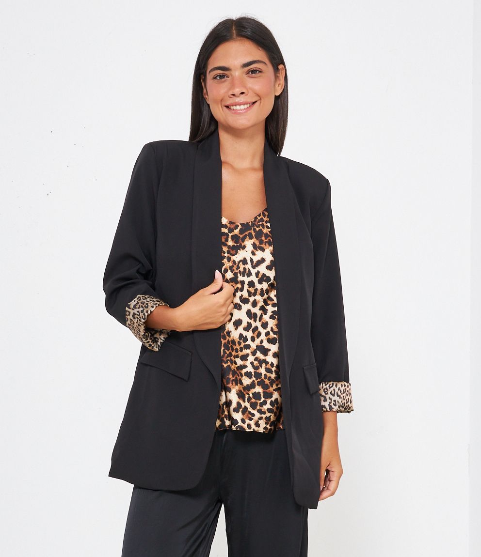 Blazer con spalline imbottite, senza chiusura e collo revers. Dettaglio di risvolti animalier