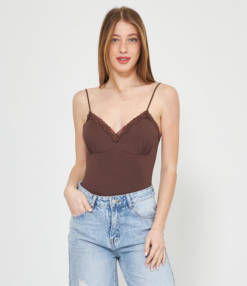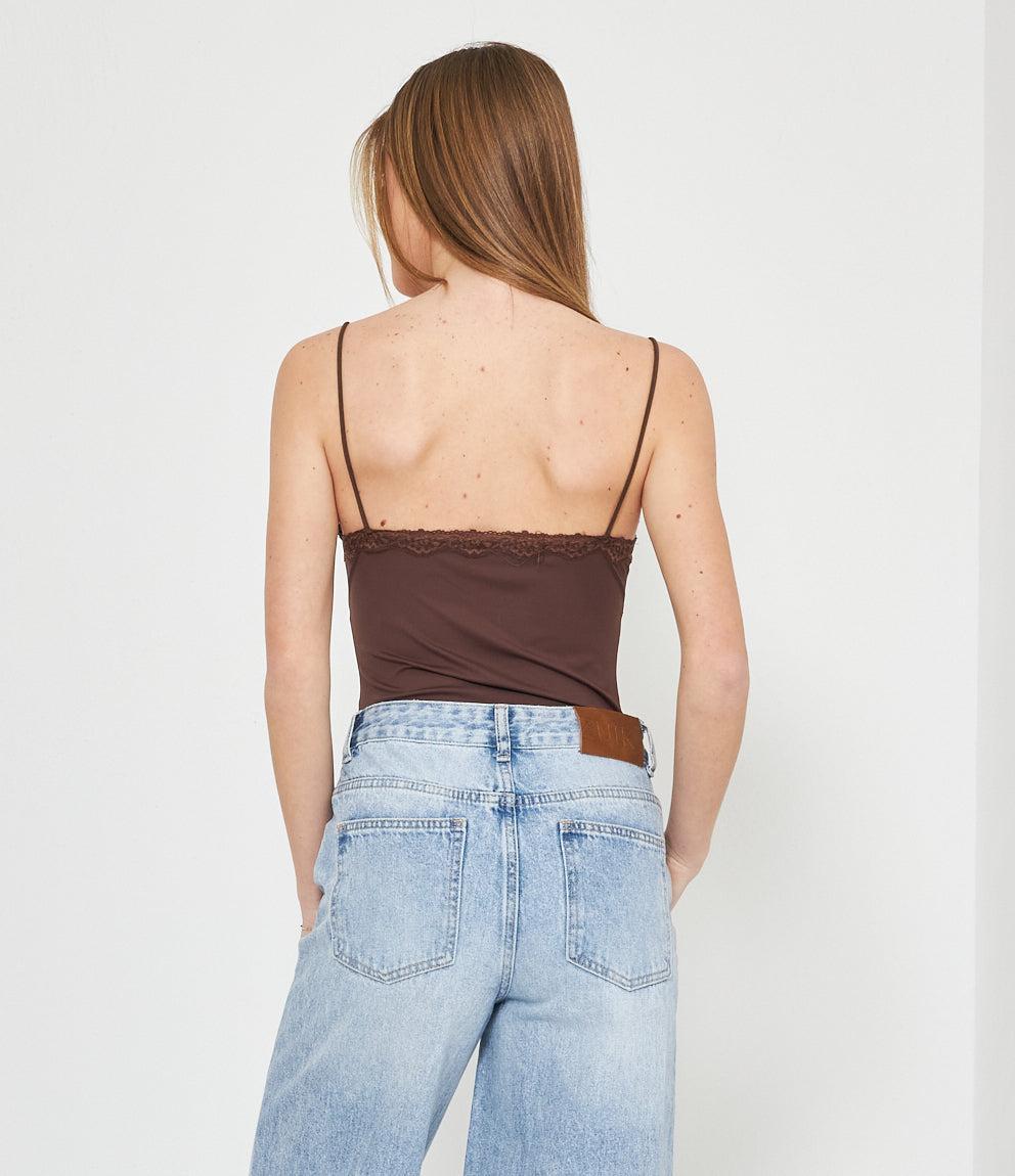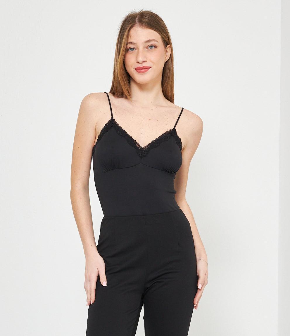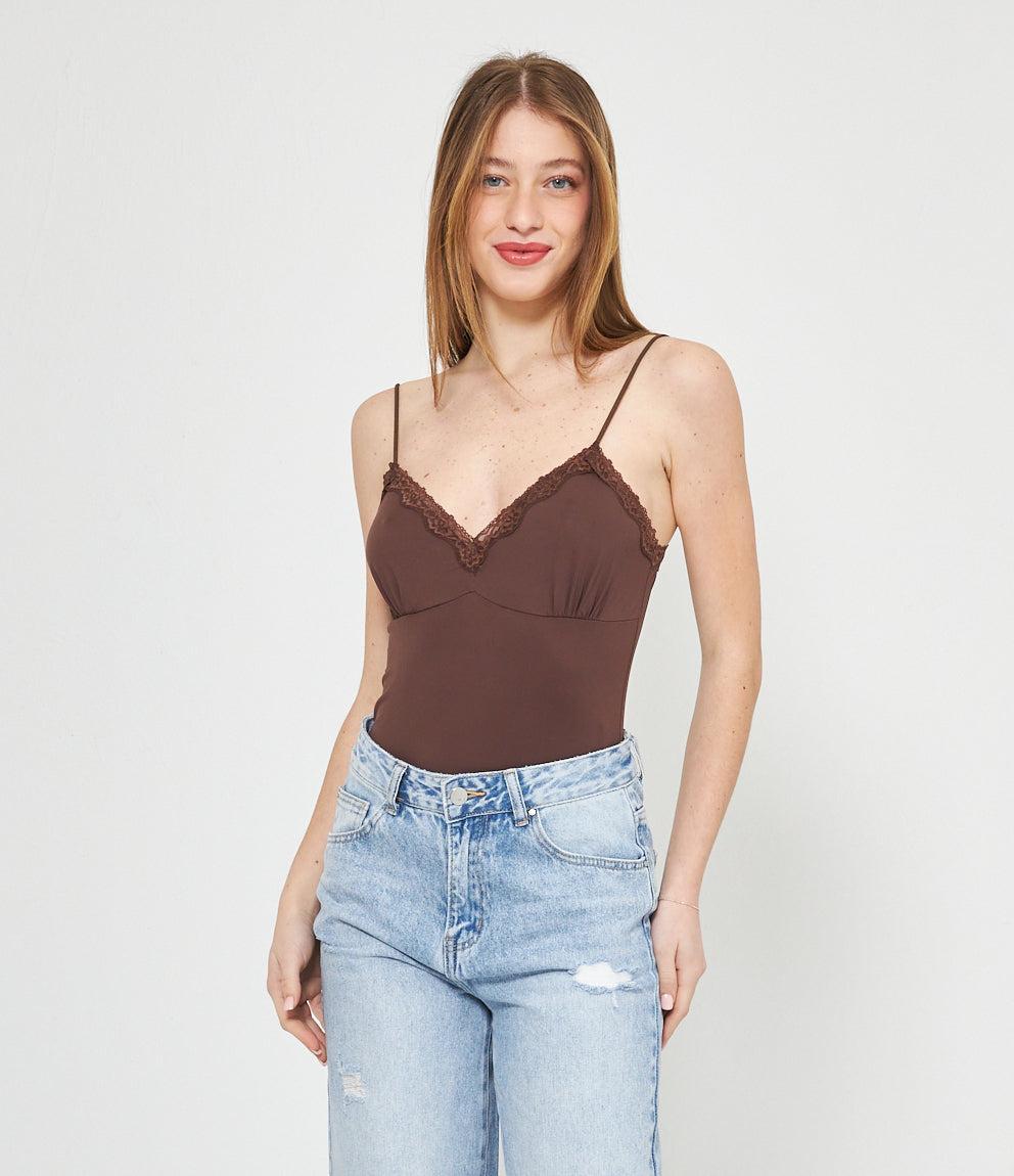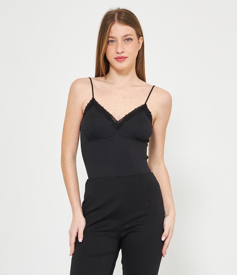 Body con spalline sottili, scollo profondo con bordi in pizzo e chiusura con gancetti.