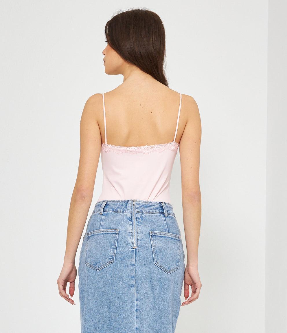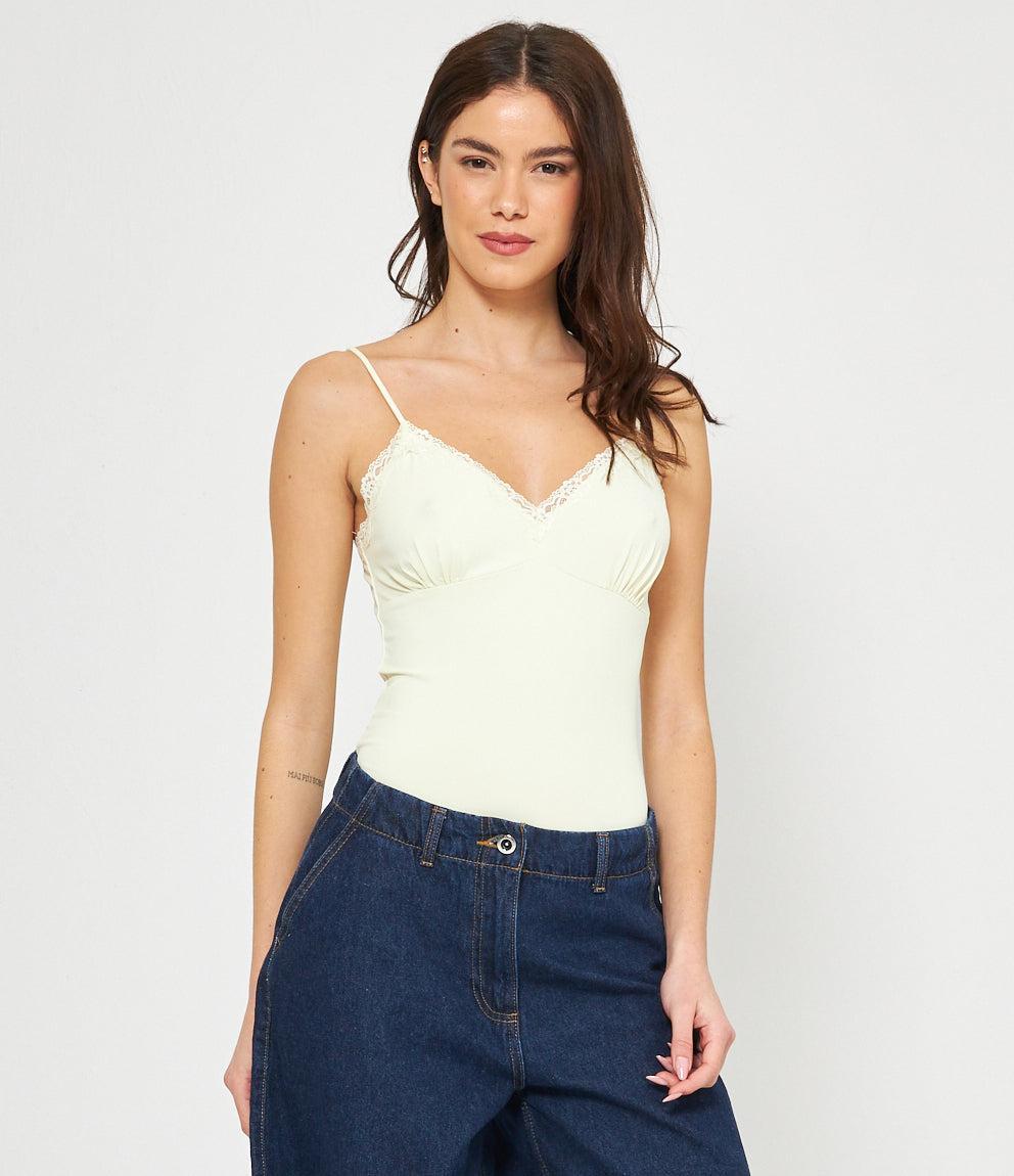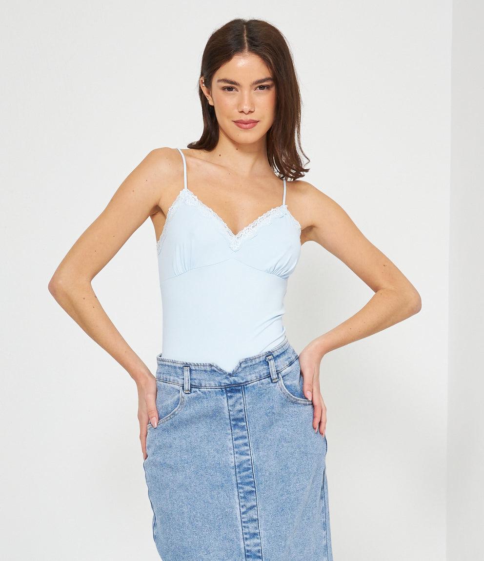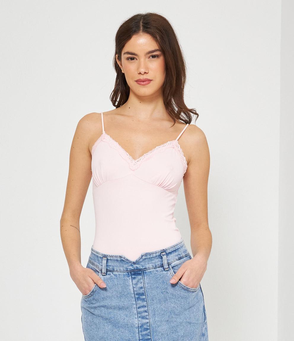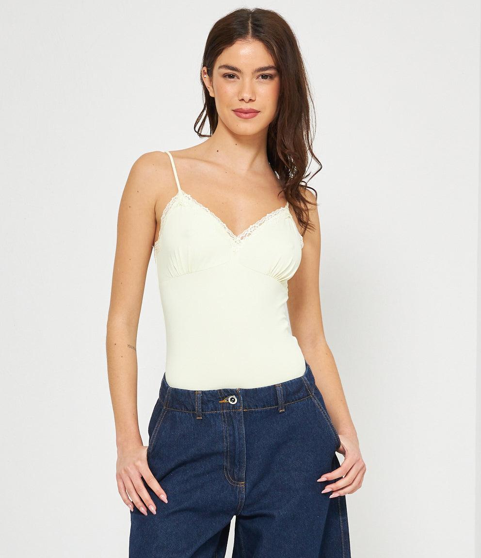 Body con spalline sottili, scollo profondo con bordi in pizzo e chiusura con gancetti.