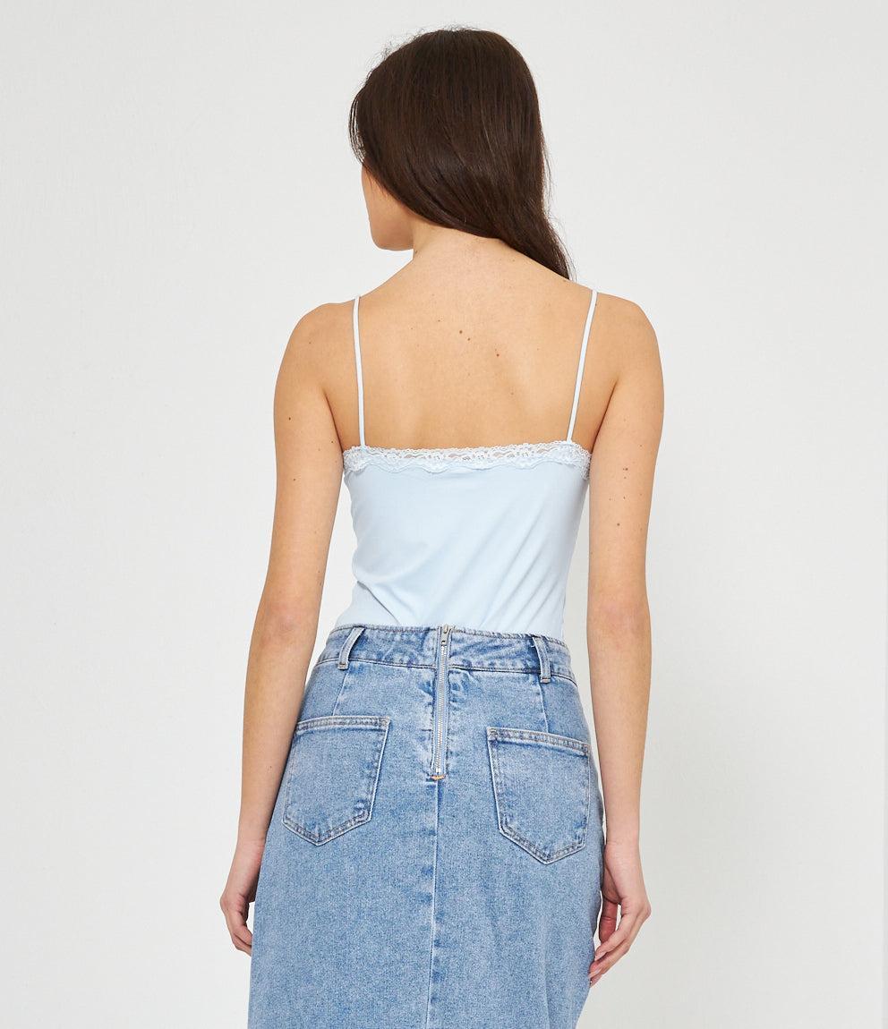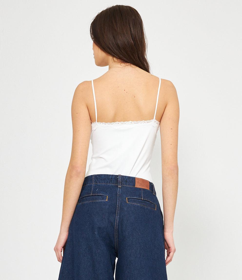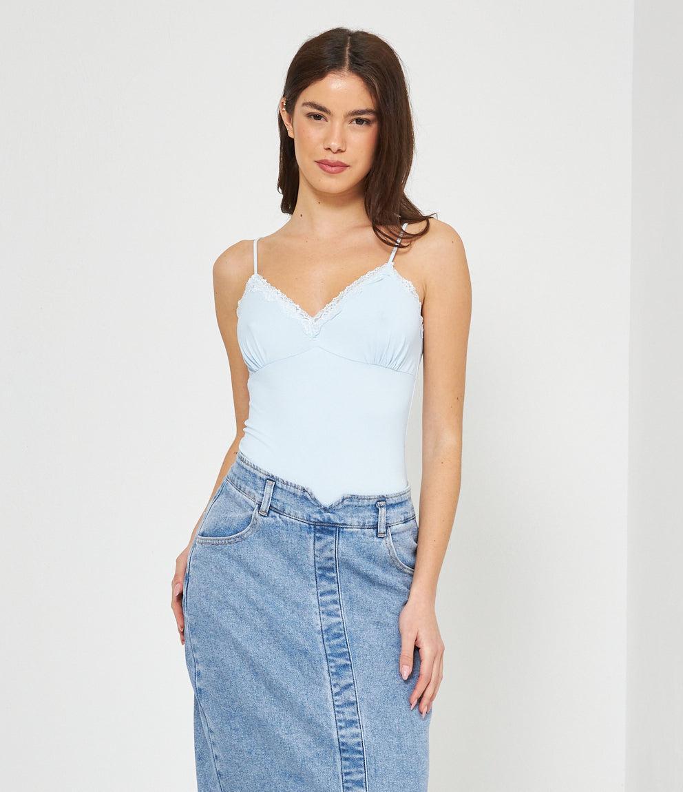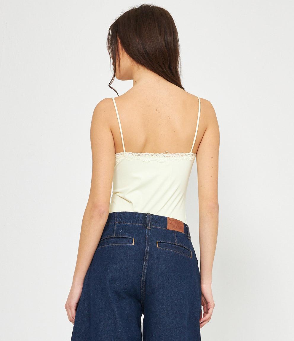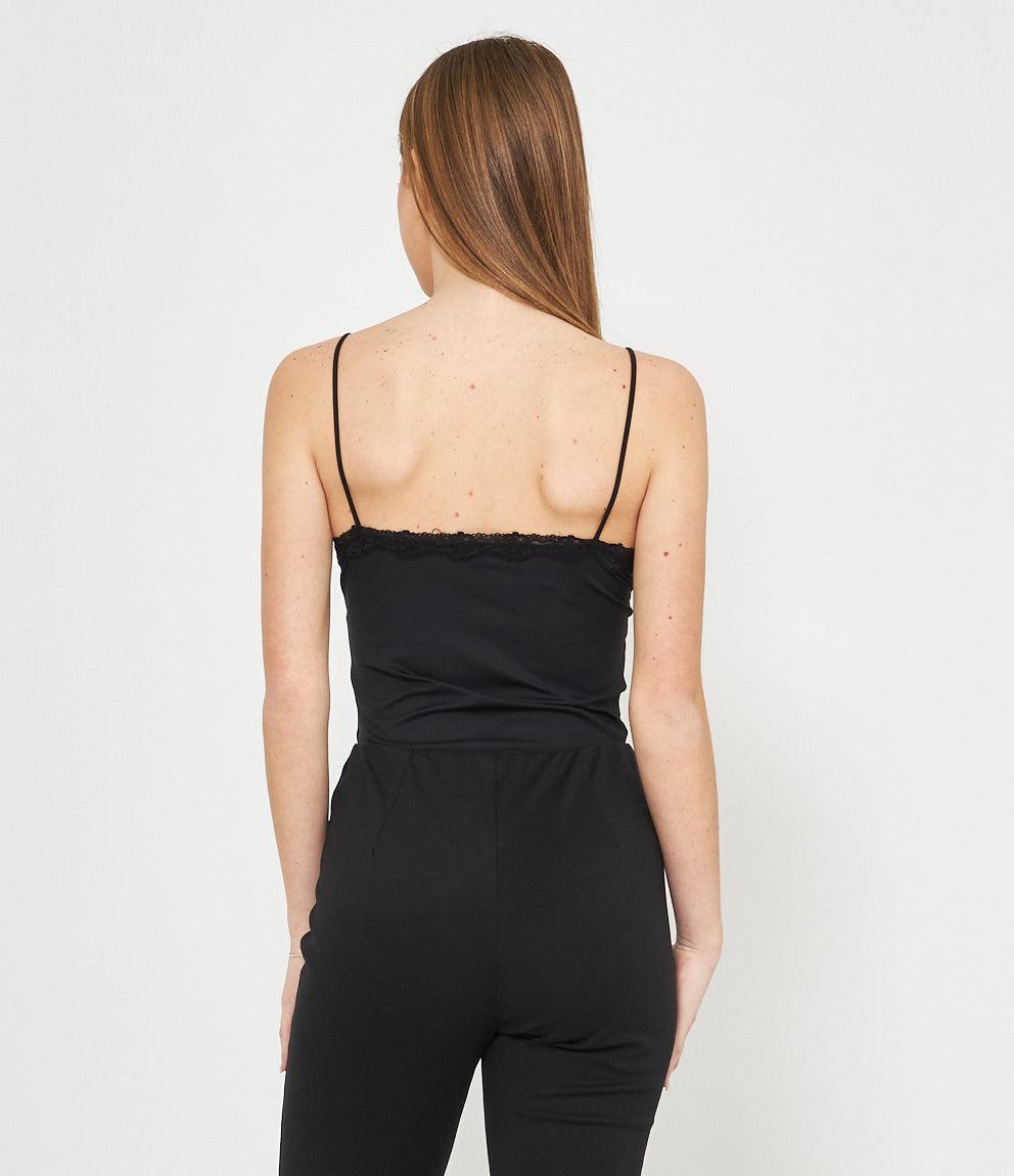 Body con spalline sottili, scollo profondo con bordi in pizzo e chiusura con gancetti.
