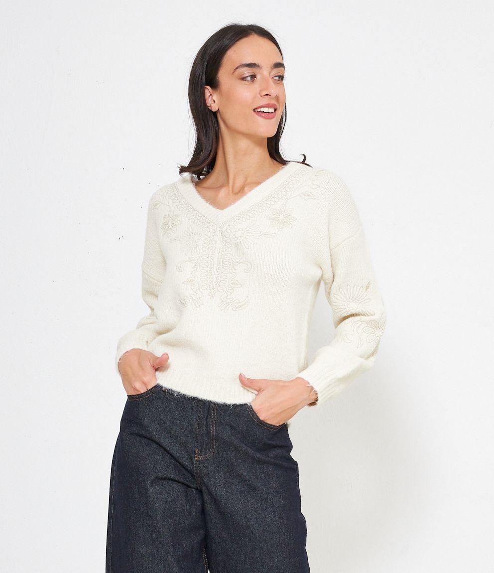 Maglia in viscosa effetto peluche modello over con scollo a v e ricami.