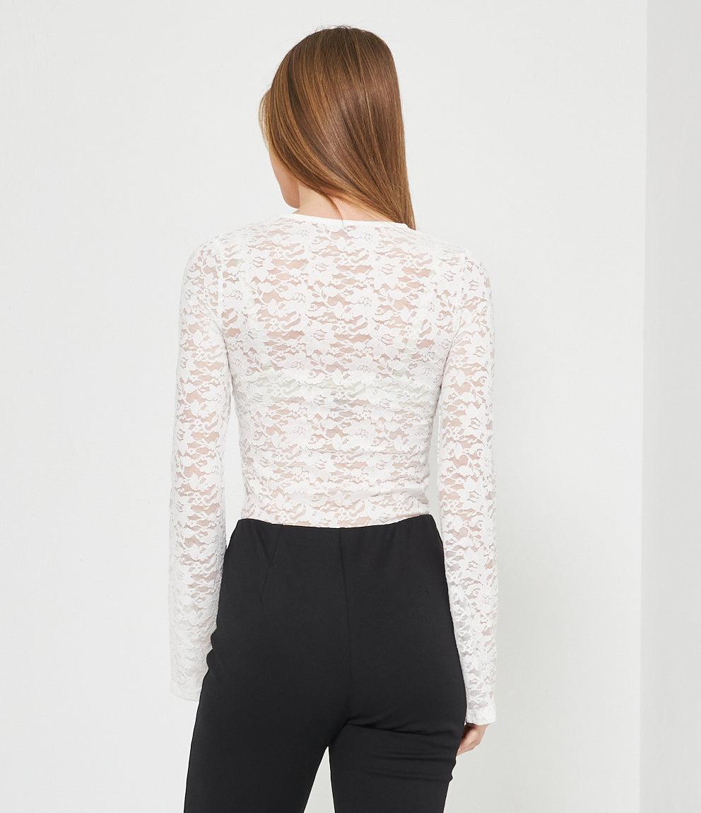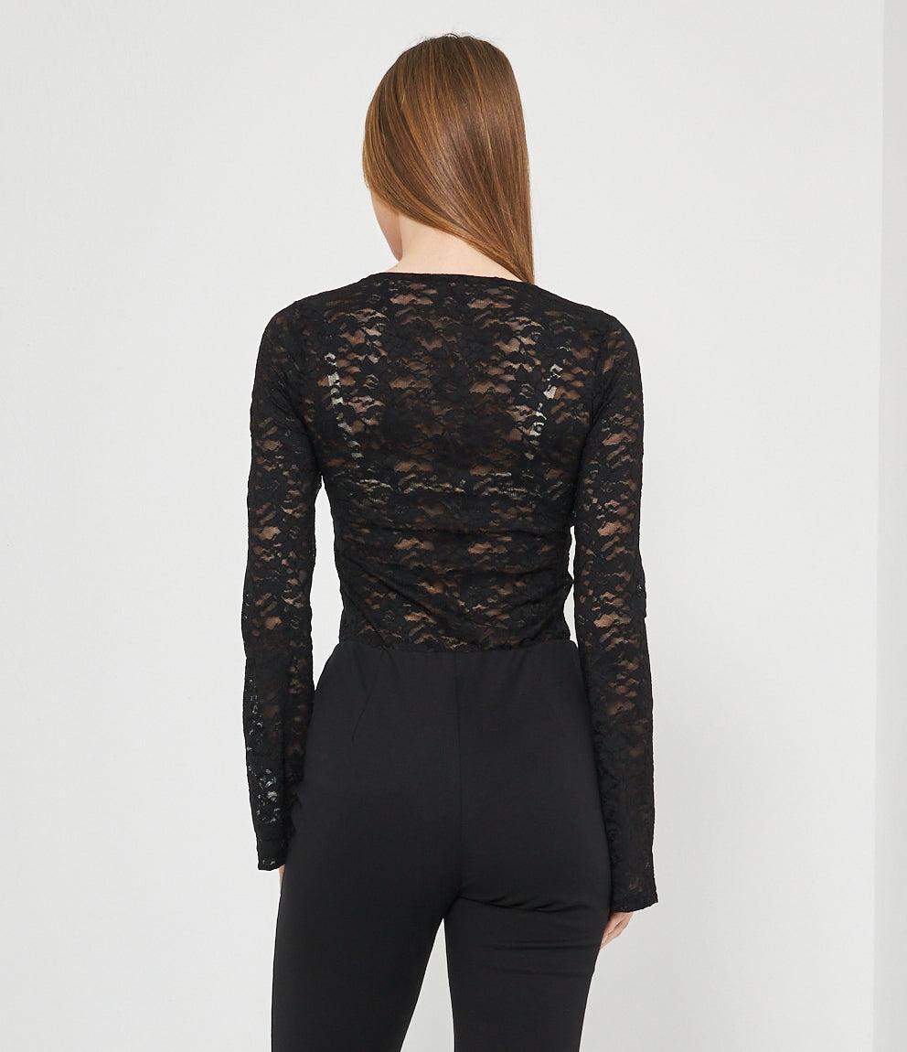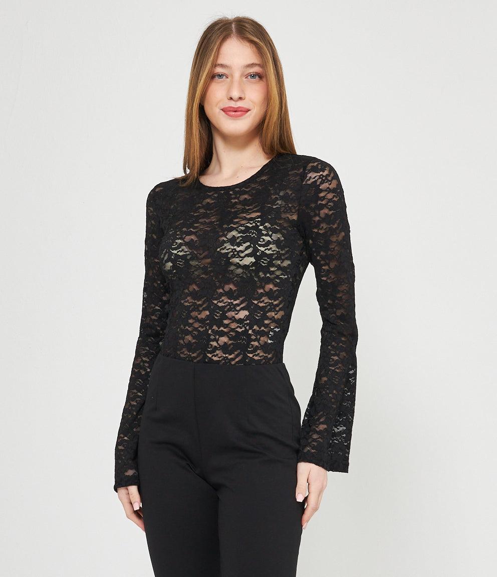 Body realizzato completamente in pizzo floreale traforato con effetto semi-trasparente. Presenta scollo tondo, maniche lunghe e vestibilità aderente che segue le linee del corpo. Disponibile in due varianti colore.
