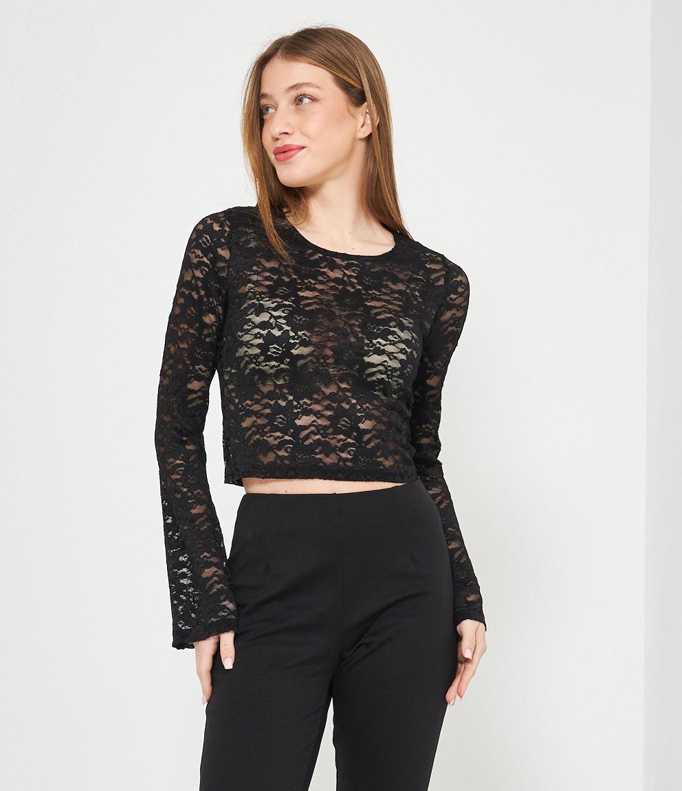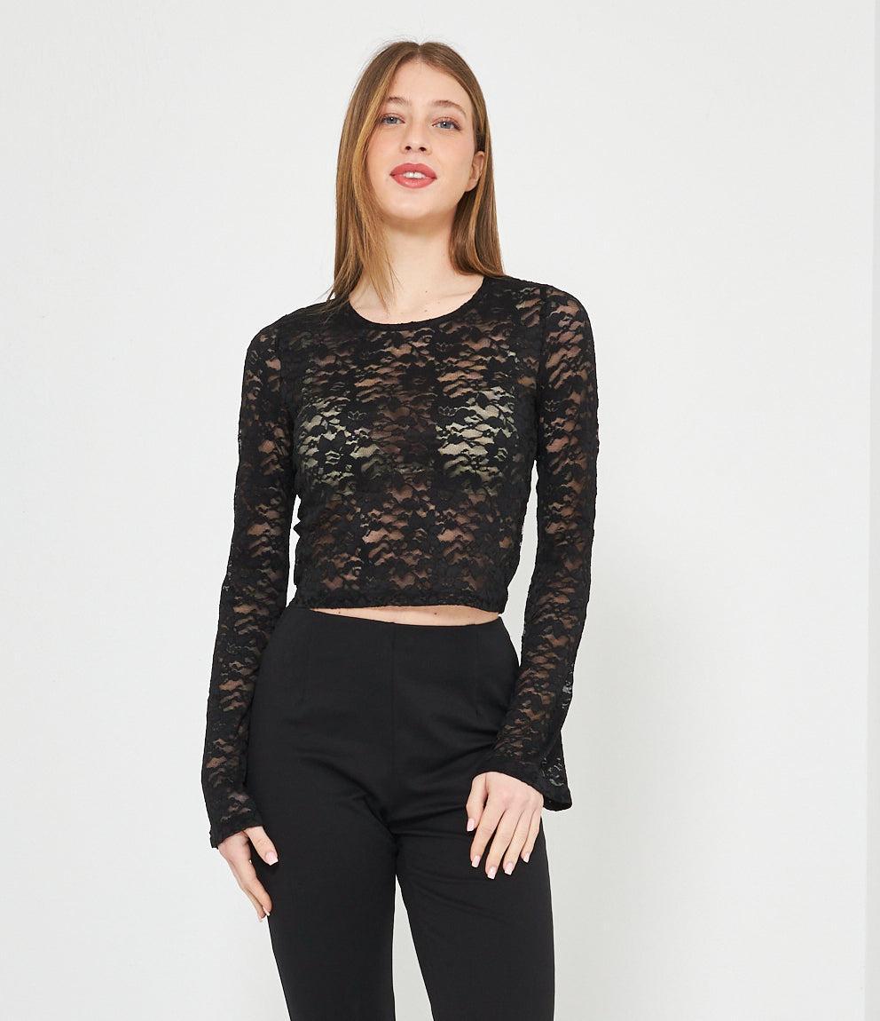 Maglia corta in pizzo trasparente con maniche lunghe e girocollo. Vestibilità aderente che termina sopra la vita, creando un look crop. Tessuto completamente traforato con motivo floreale in pizzo.