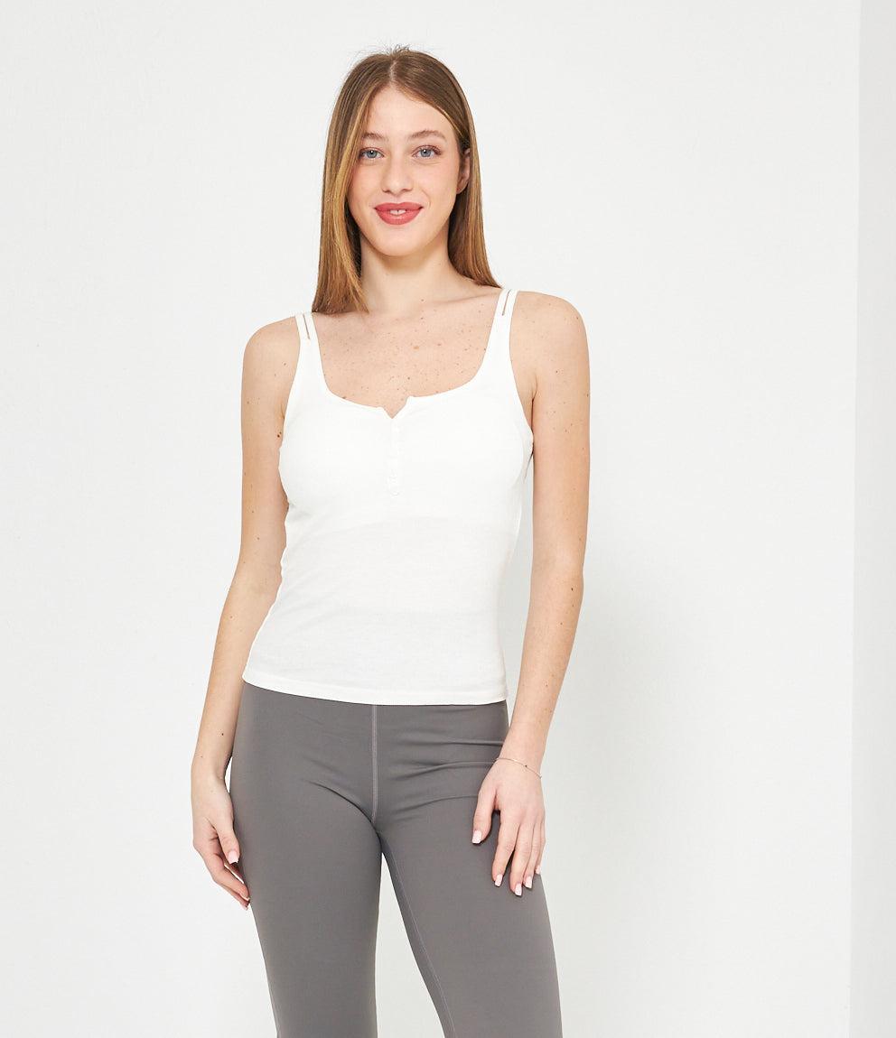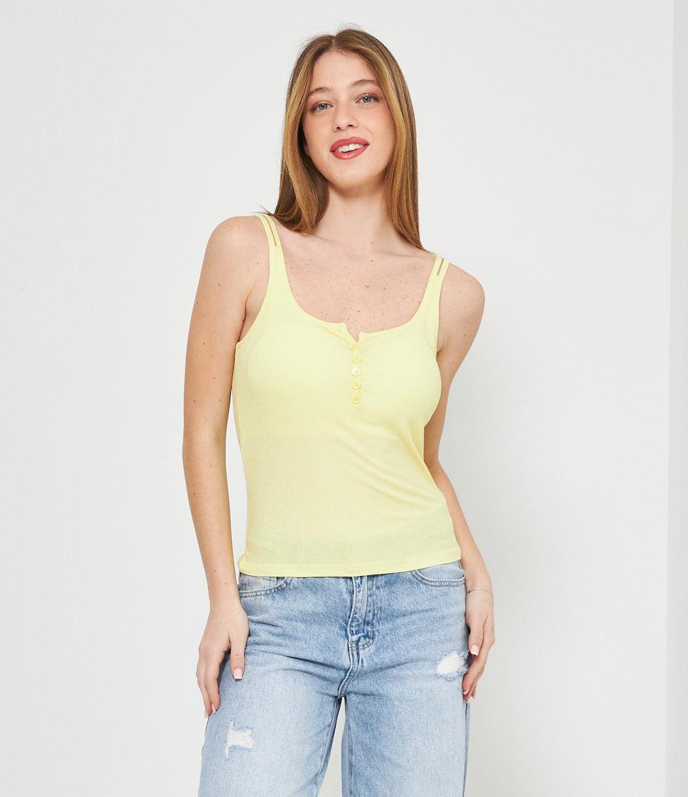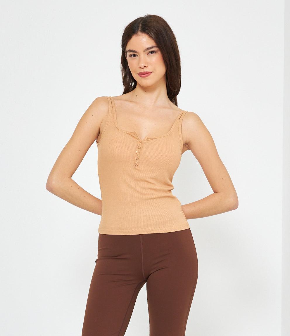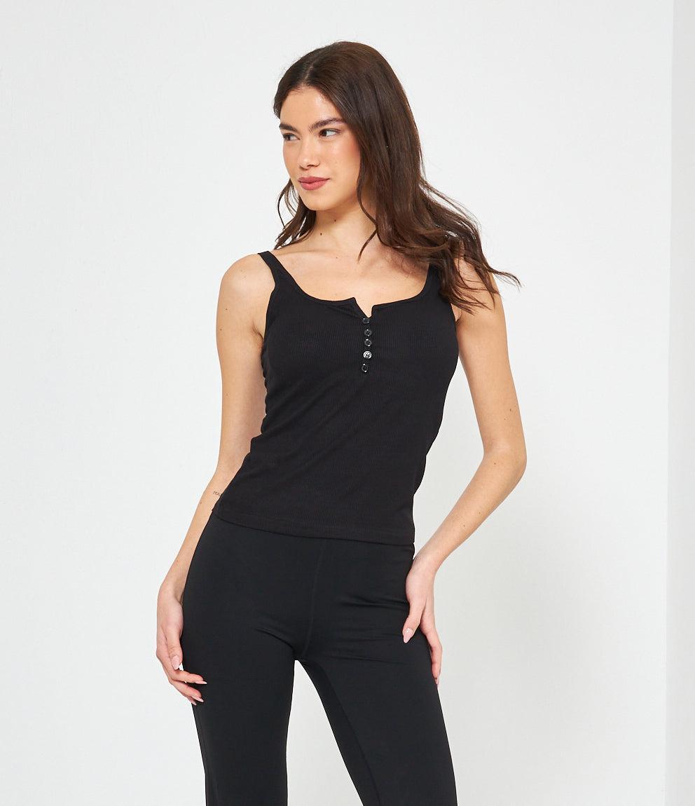 Canotta in tessuto a coste con scollo a cuore e chiusura frontale con piccoli bottoni decorativi. Presenta spalline sottili e vestibilità aderente che segue le forme del corpo. Orlo dritto a vita bassa per un look casual e femminile.