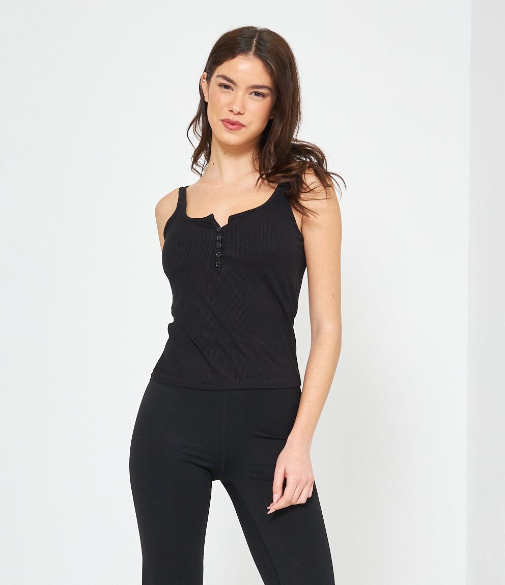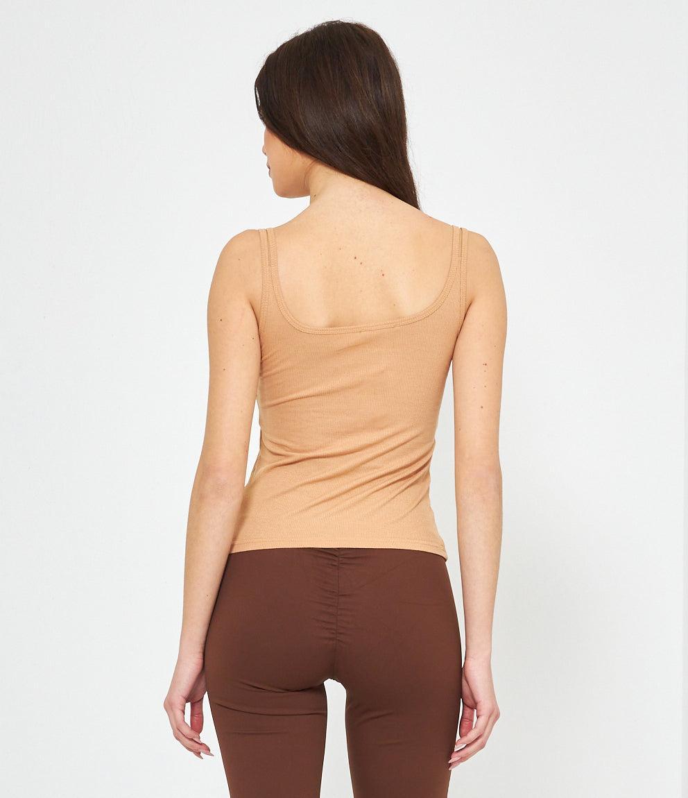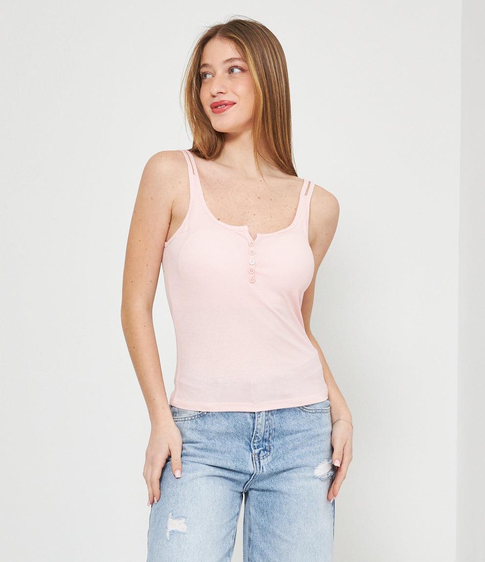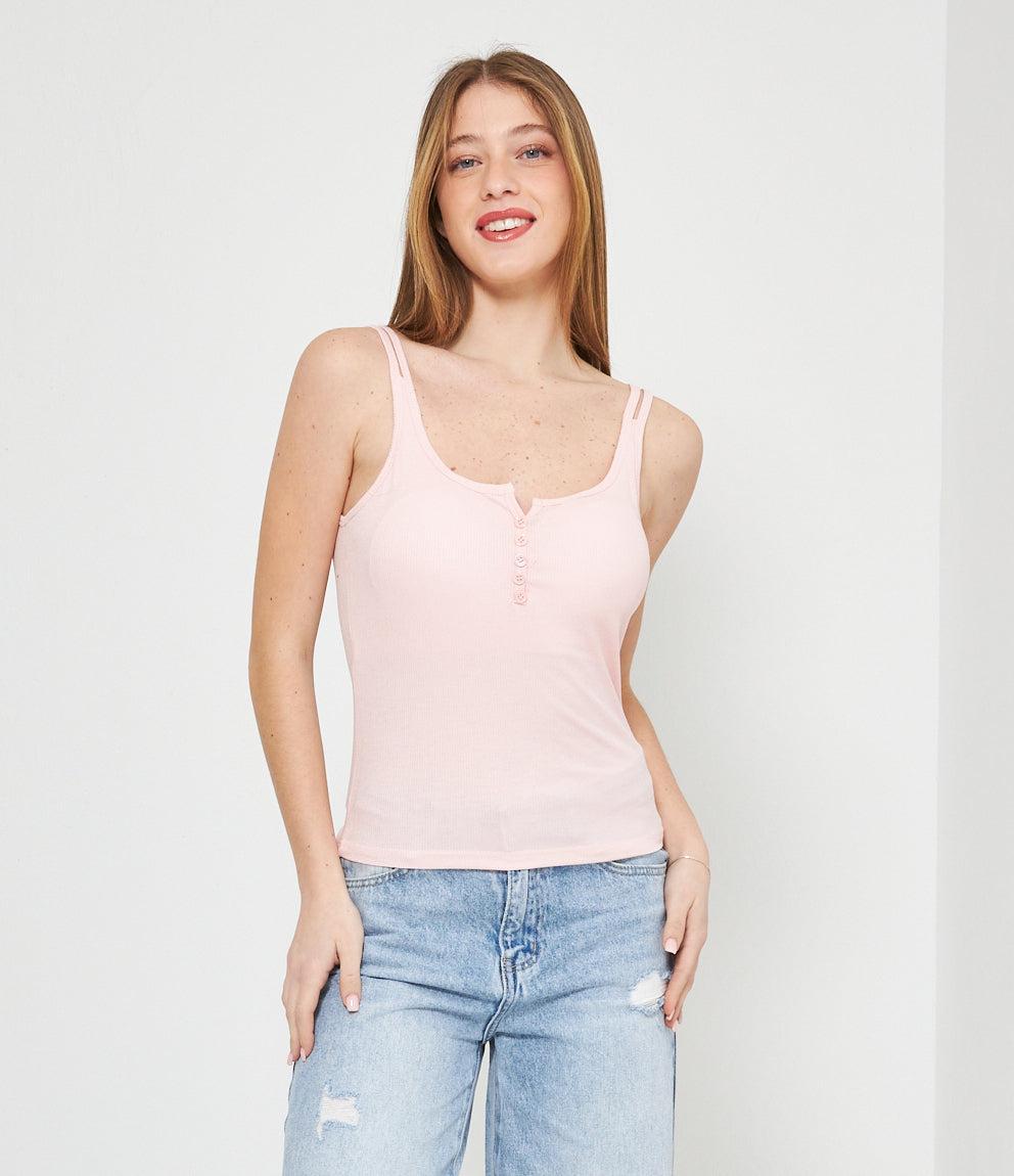 Canotta in tessuto a coste con scollo a cuore e chiusura frontale con piccoli bottoni decorativi. Presenta spalline sottili e vestibilità aderente che segue le forme del corpo. Orlo dritto a vita bassa per un look casual e femminile.