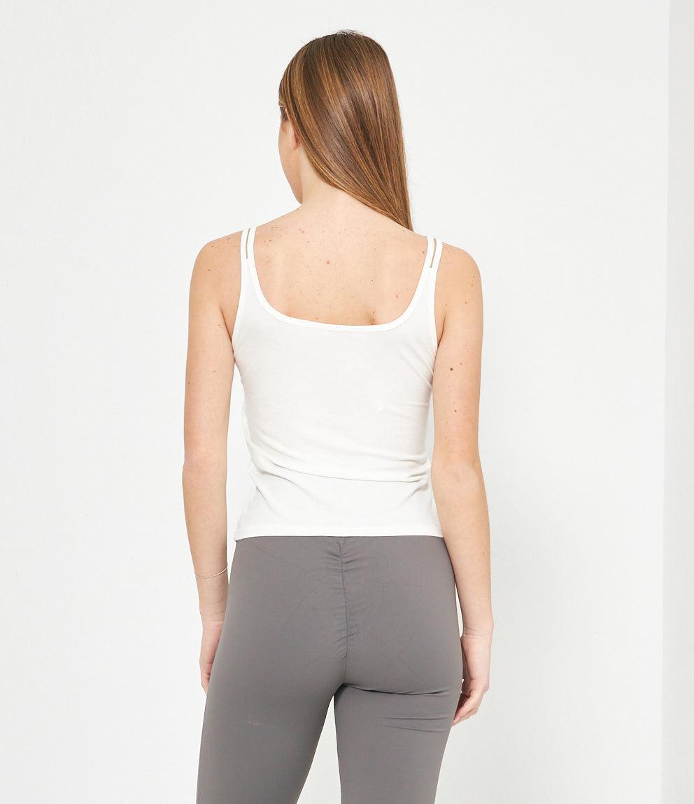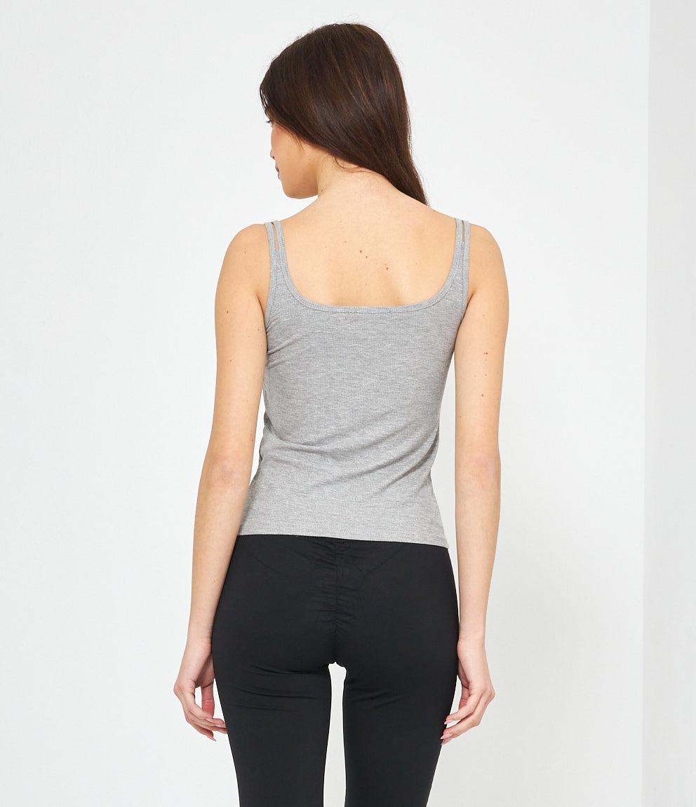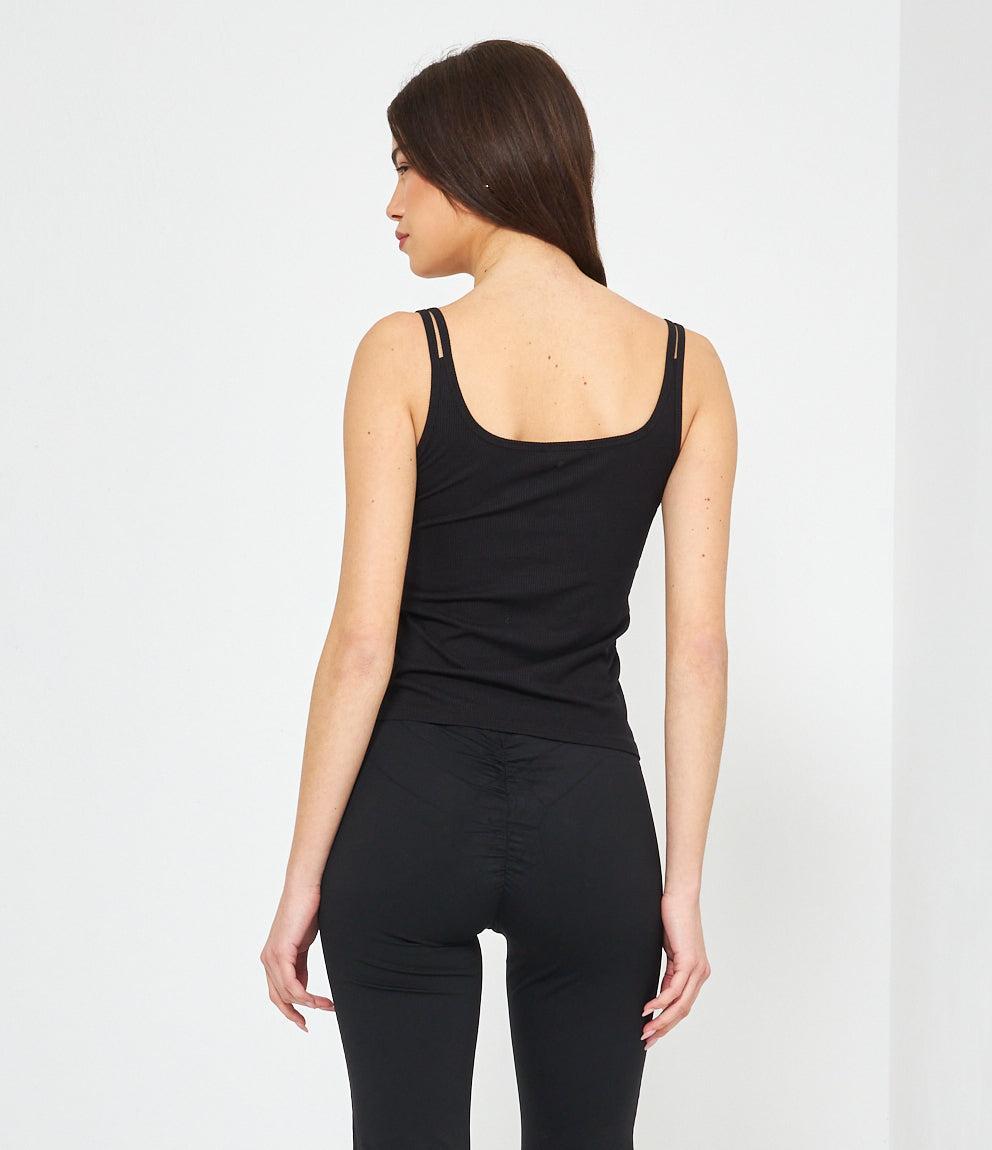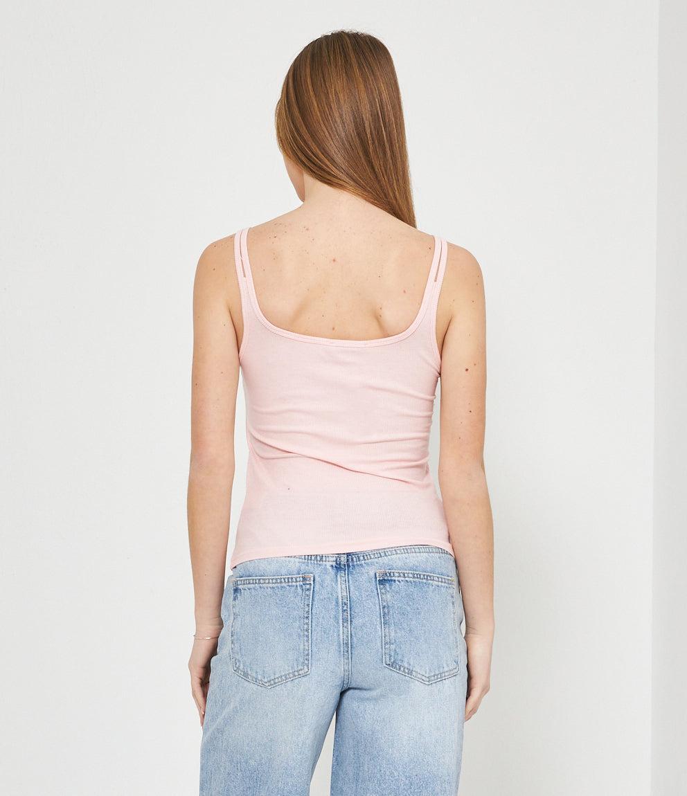 Canotta in tessuto a coste con scollo a cuore e chiusura frontale con piccoli bottoni decorativi. Presenta spalline sottili e vestibilità aderente che segue le forme del corpo. Orlo dritto a vita bassa per un look casual e femminile.