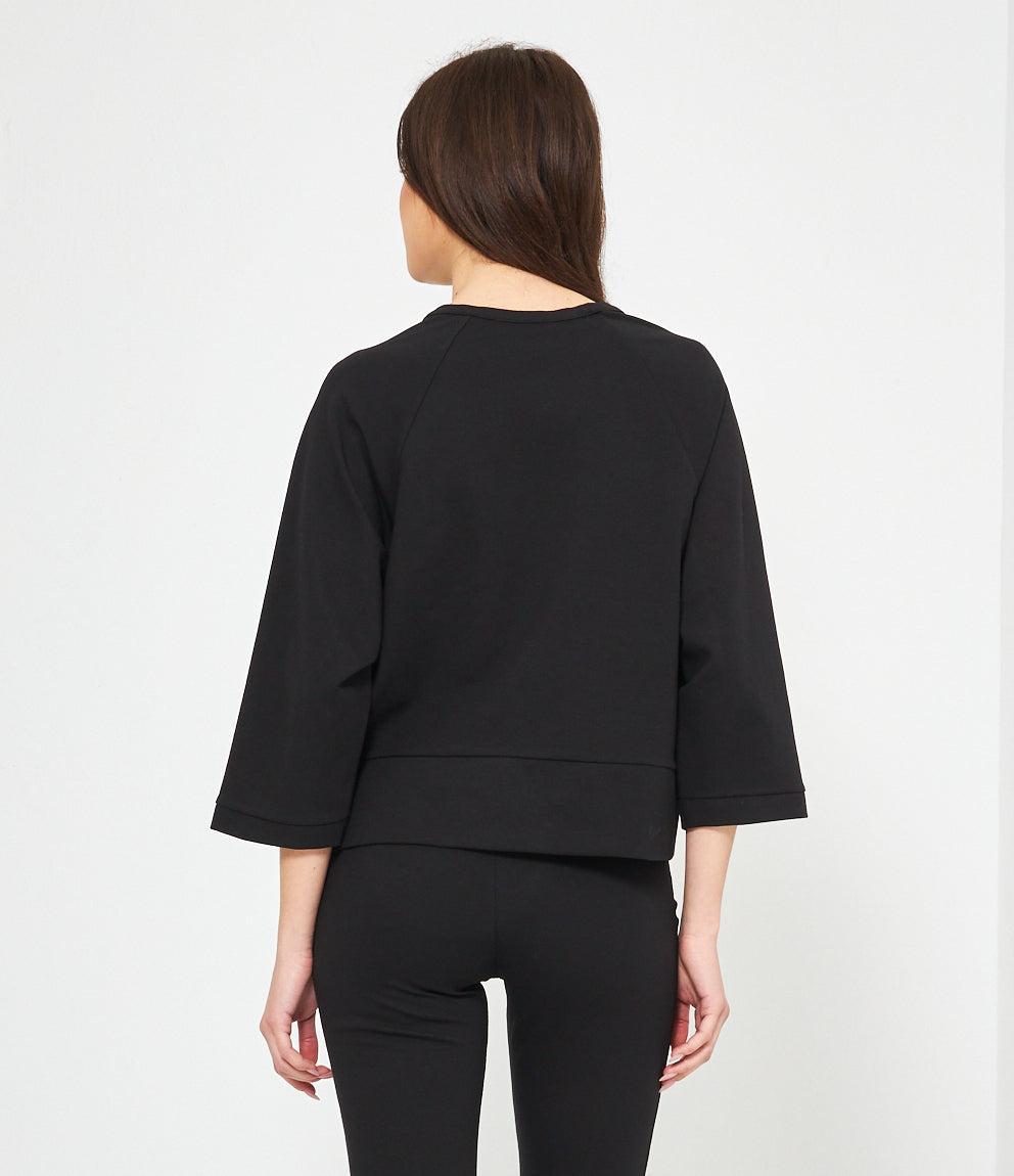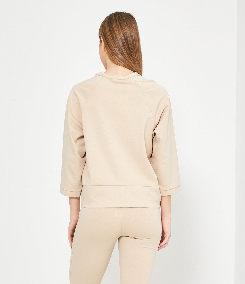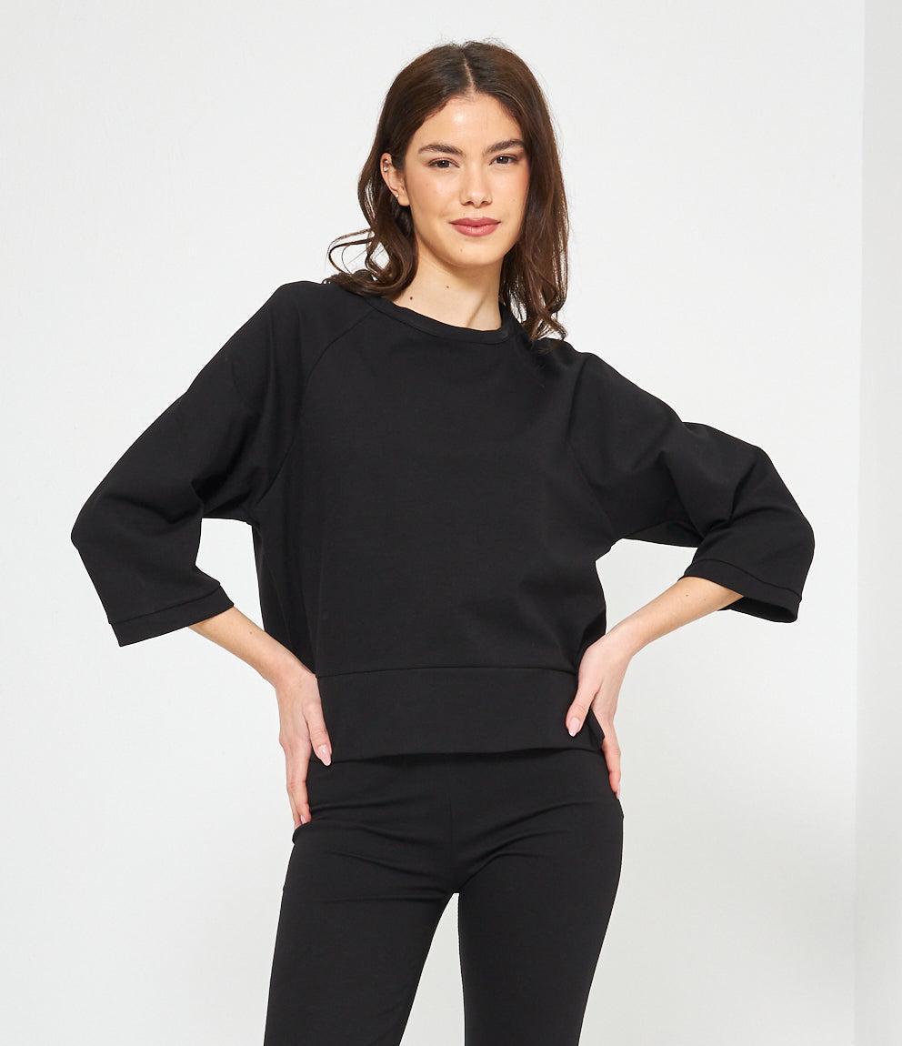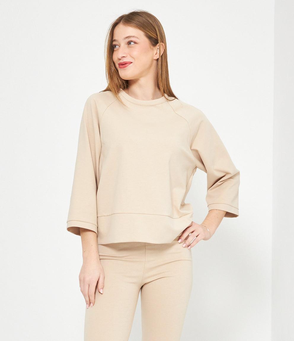 Le maniche a tre quarti con polsini aggiungono un tocco di raffinatezza, mentre le cuciture raglan che si estendono dalle spalle alle maniche conferiscono quel look sportivo-chic tanto ricercato nelle tendenze moda attuali. L'orlo dritto completa il design con linee pulite e moderne, perfette per essere indossate sia dentro che fuori dai pantaloni.