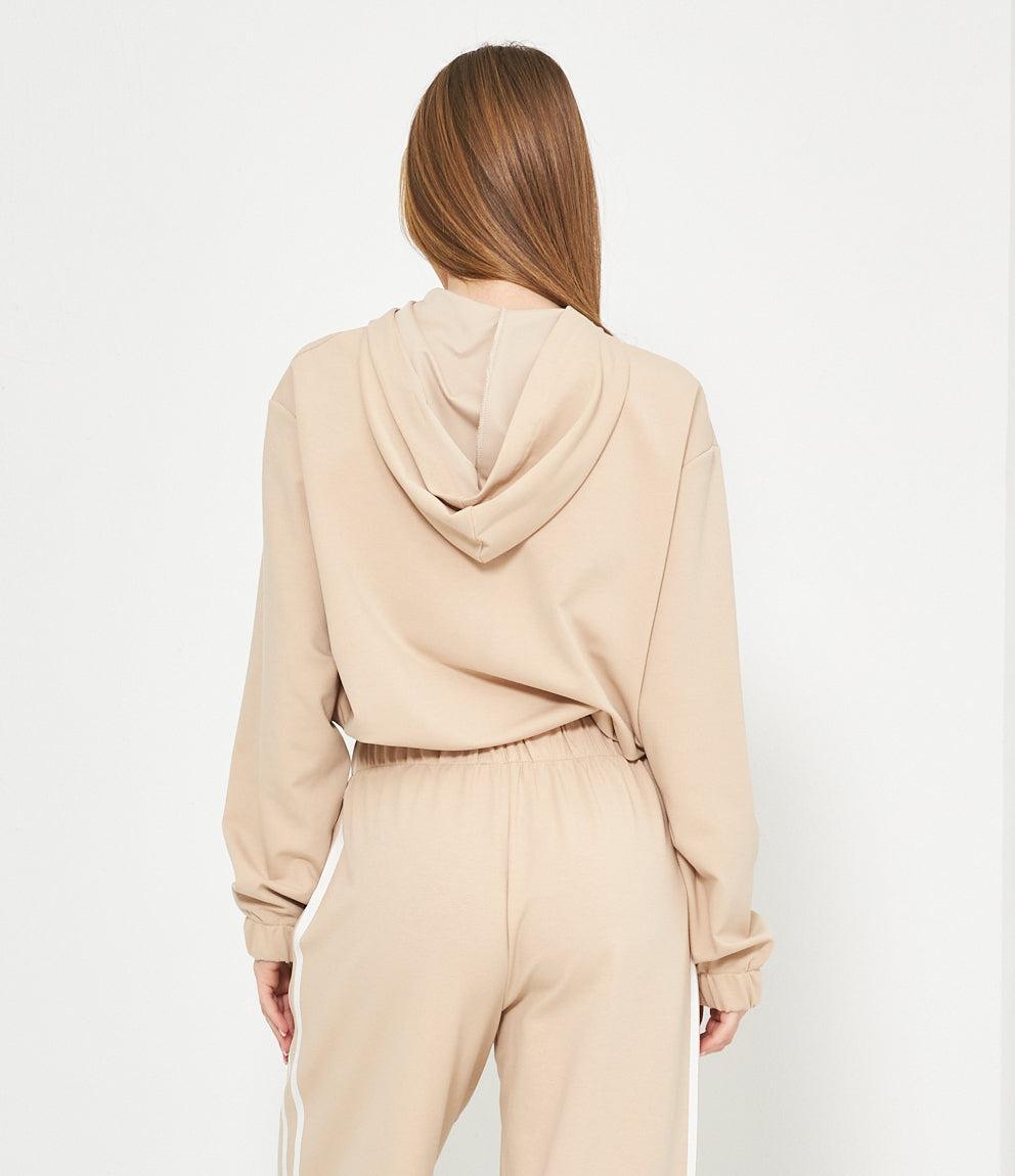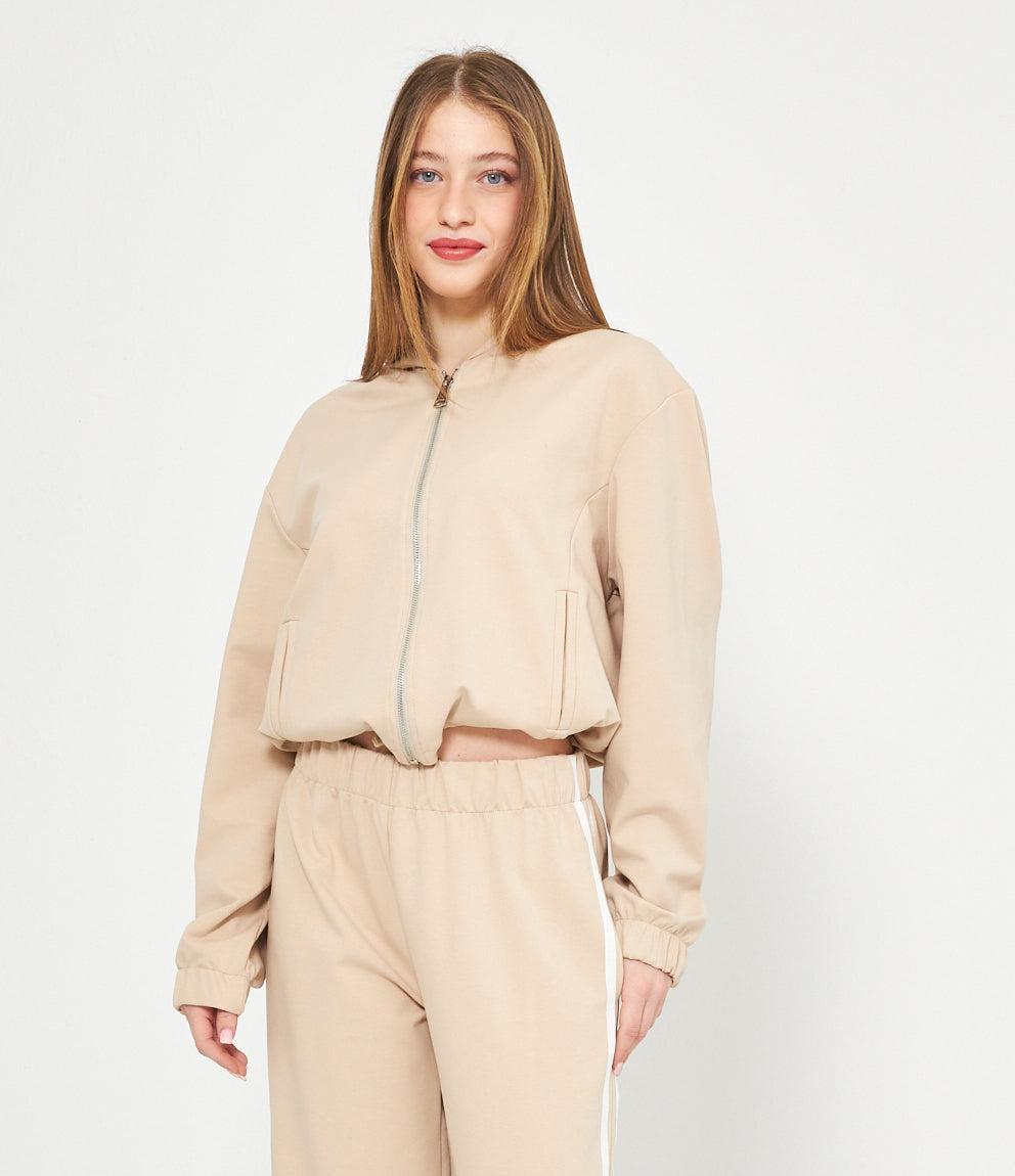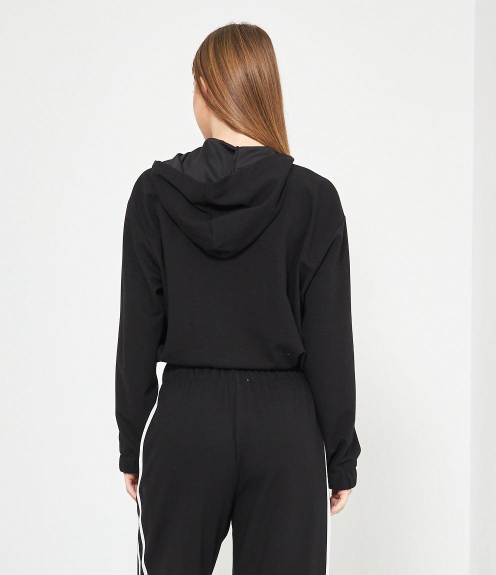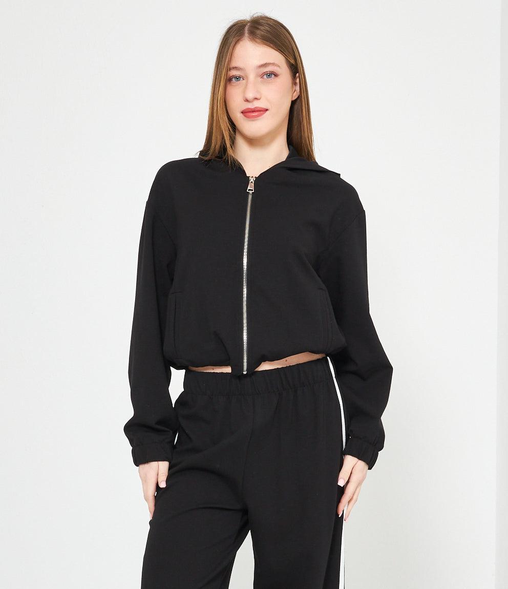 Felpa con cappuccio e chiusura zip frontale. Polsini e orlo elastici per una vestibilità comoda. Disponibile in coordinato con pantaloni con bande laterali a contrasto.