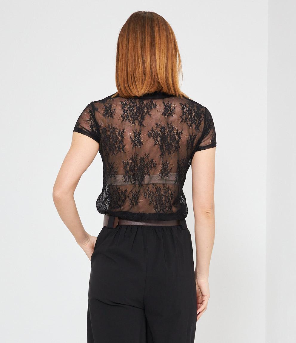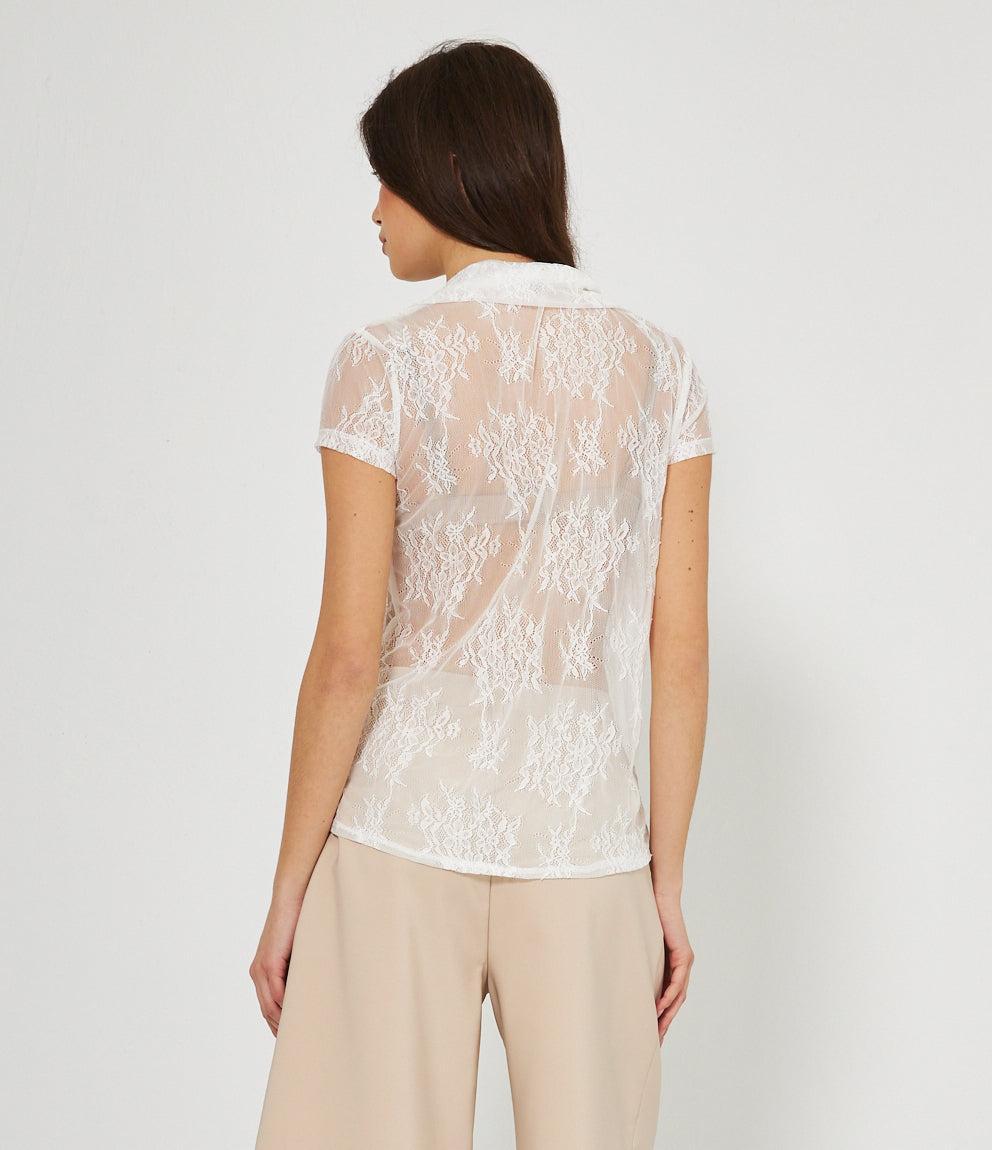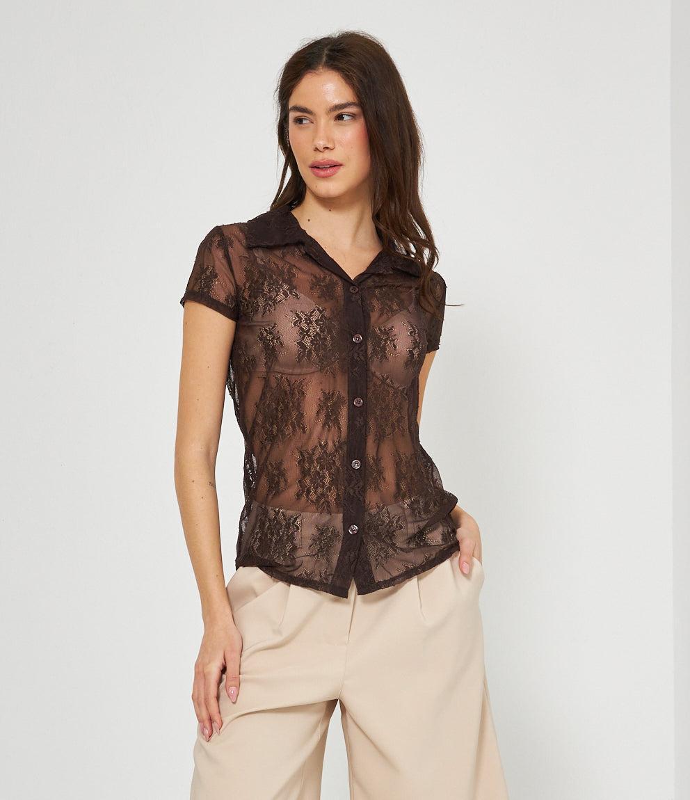 Camicia a maniche corte in pizzo traforato con motivi floreali su base trasparente. Presenta colletto classico, chiusura frontale con bottoni e vestibilità aderente. Il tessuto lavorato crea un effetto semi-trasparente molto elegante.
