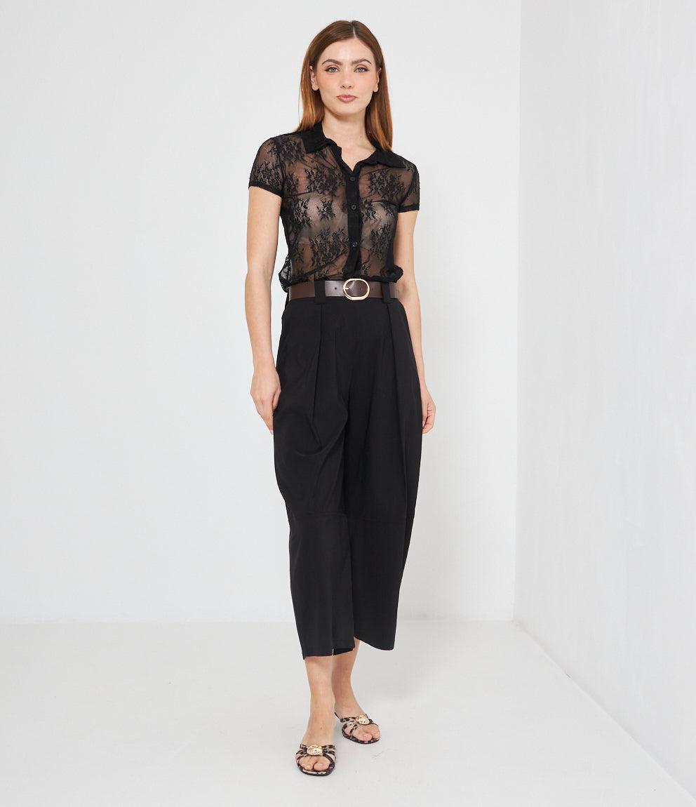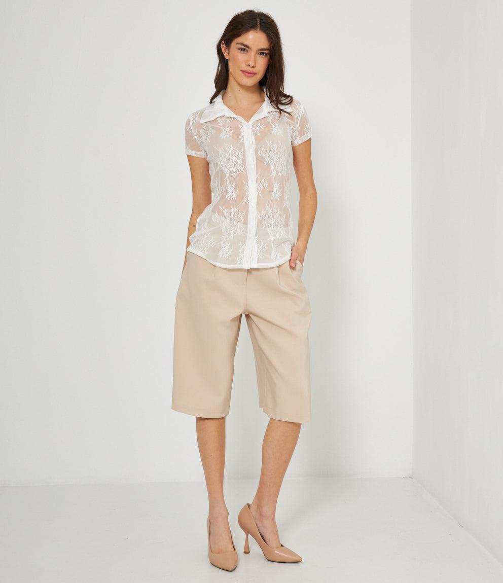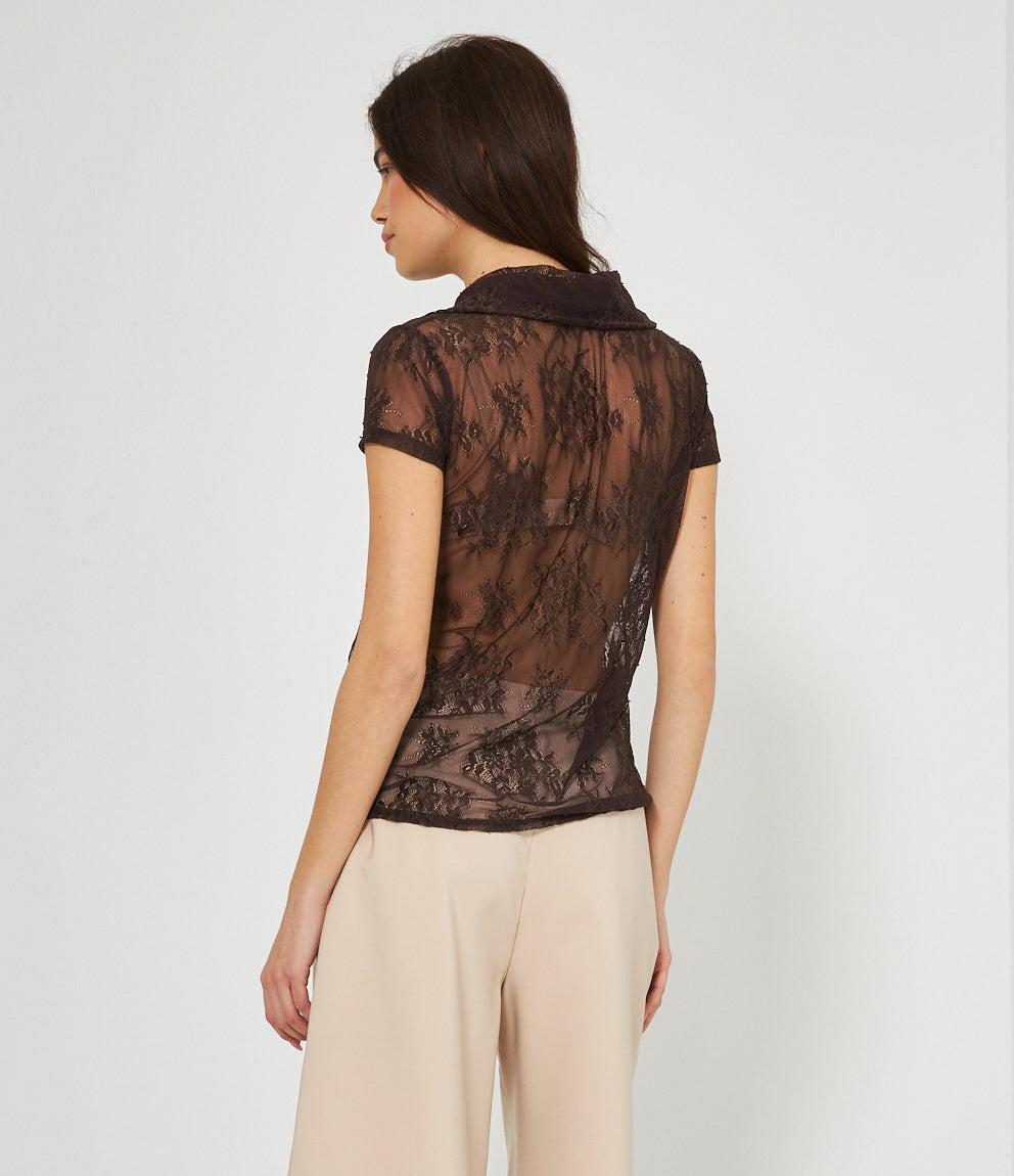 Camicia a maniche corte in pizzo traforato con motivi floreali su base trasparente. Presenta colletto classico, chiusura frontale con bottoni e vestibilità aderente. Il tessuto lavorato crea un effetto semi-trasparente molto elegante.