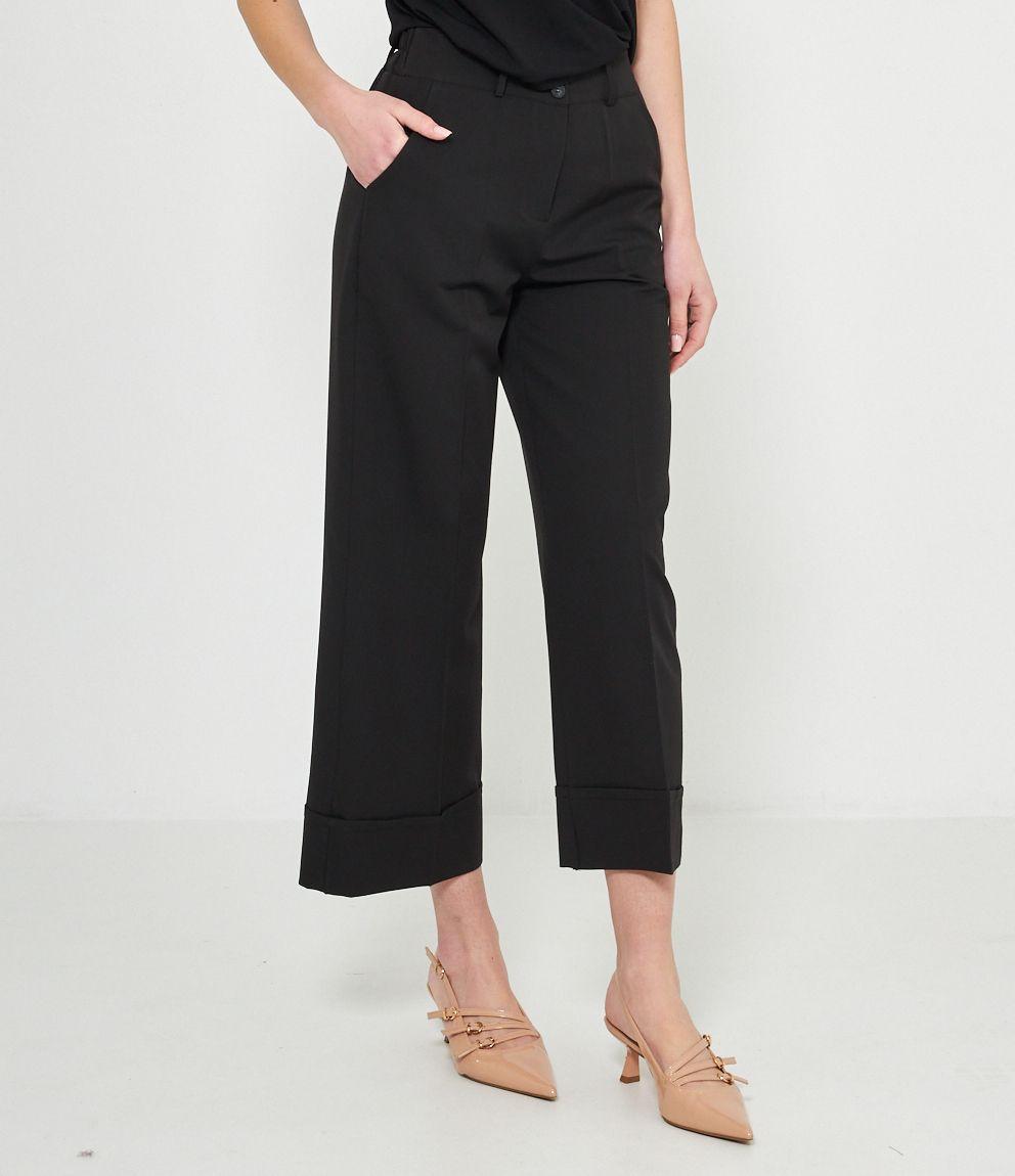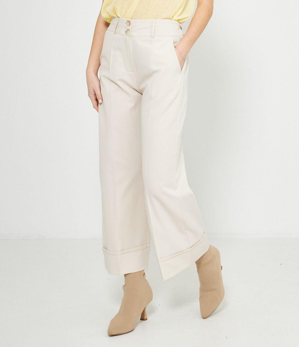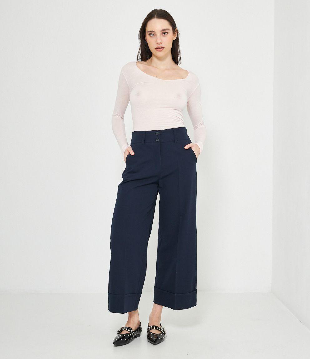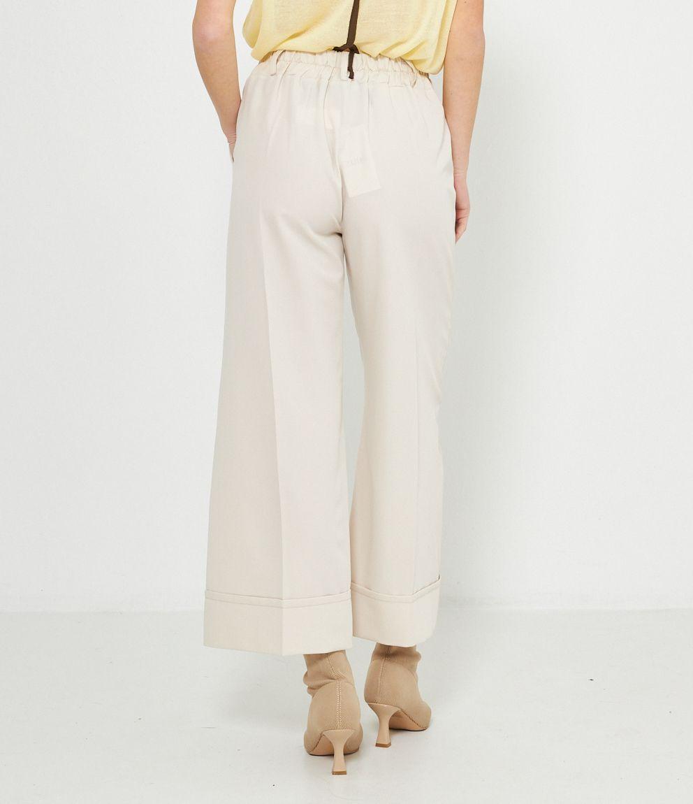 Pantaloni modello palazzo con piega alta sul fondo. Tasche laterali, elastico in vita sul retro e chiusura con zip e doppio bottone.