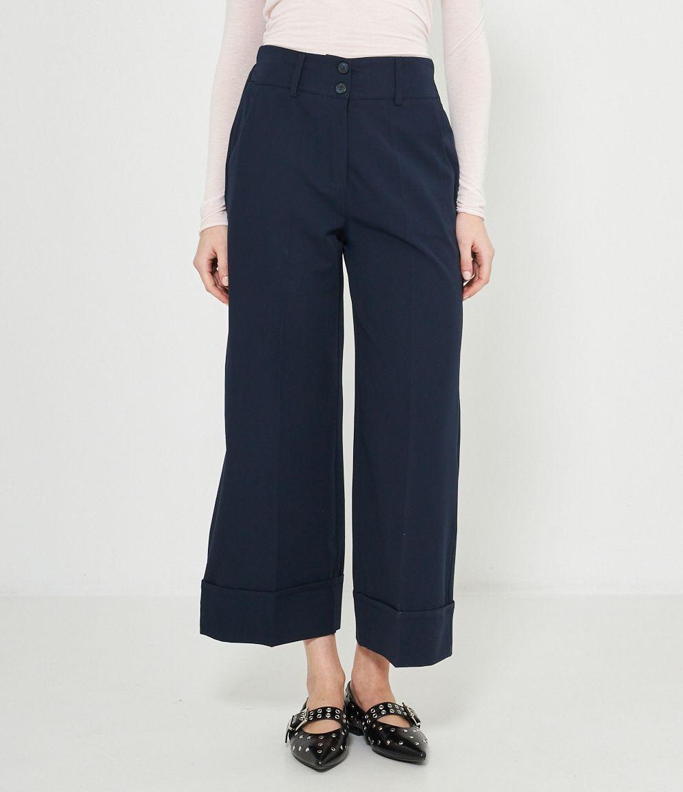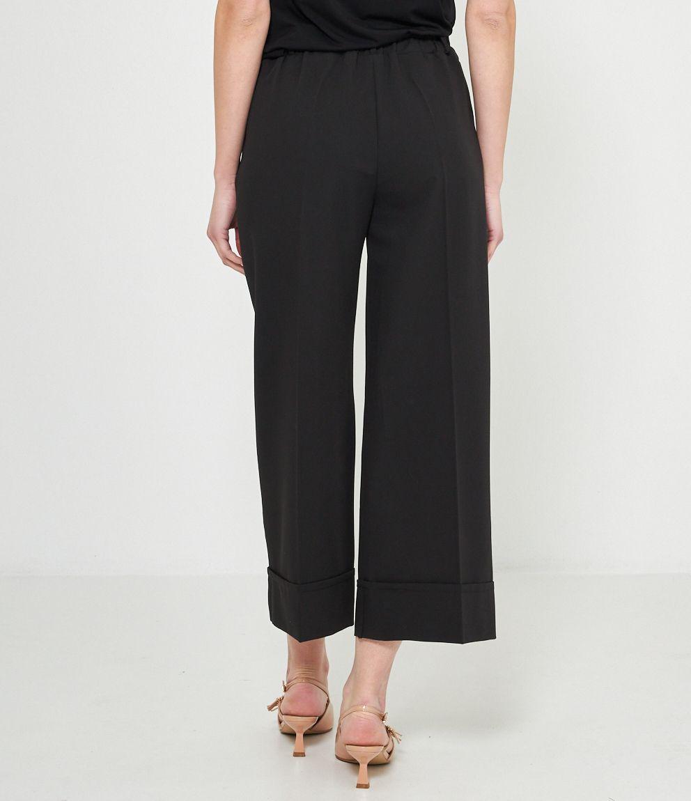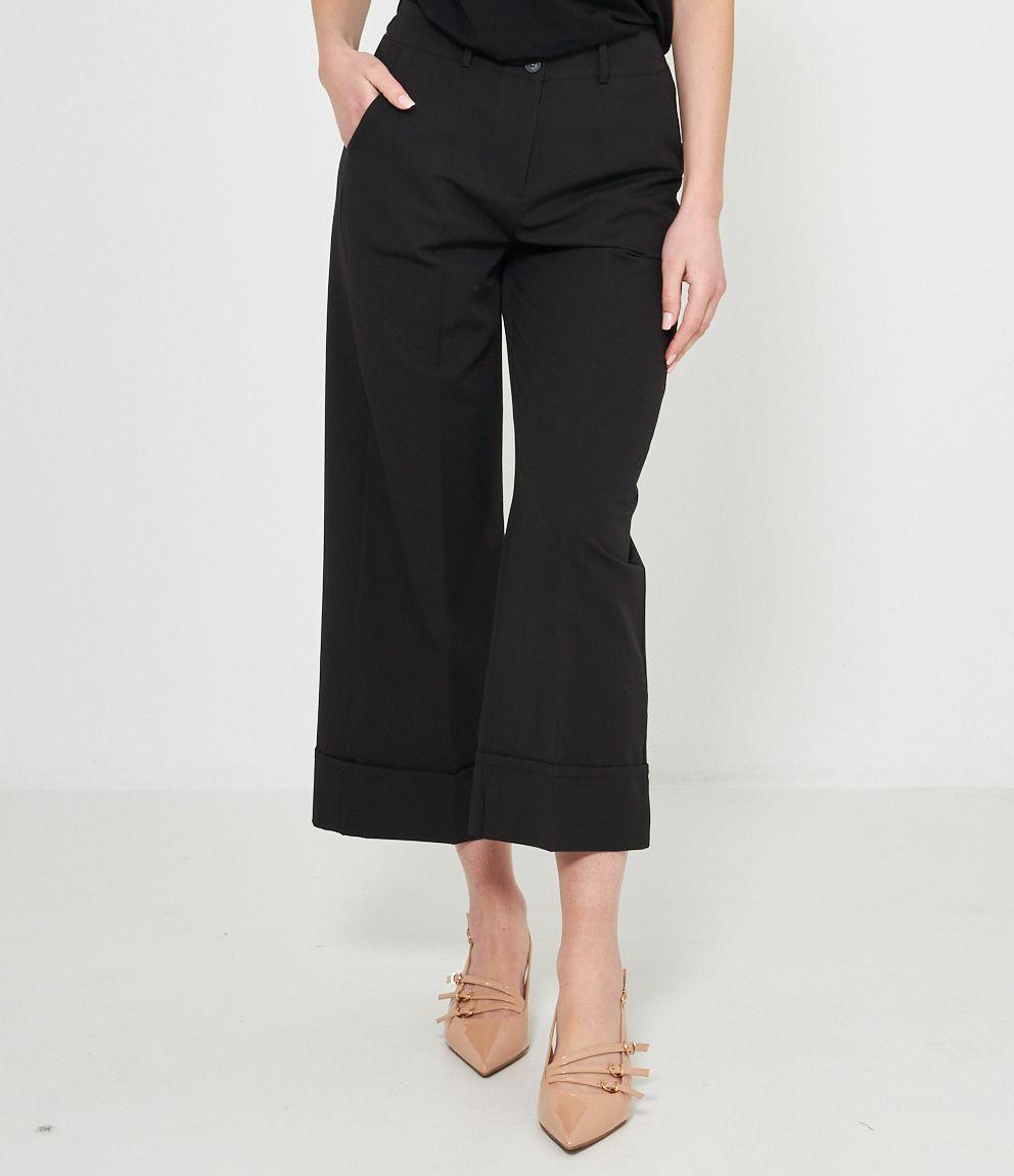 Pantaloni modello palazzo con piega alta sul fondo. Tasche laterali, elastico in vita sul retro e chiusura con zip e doppio bottone.