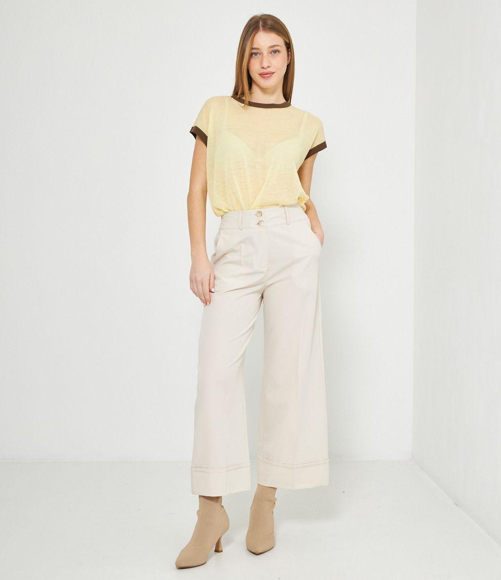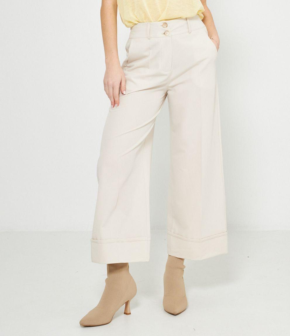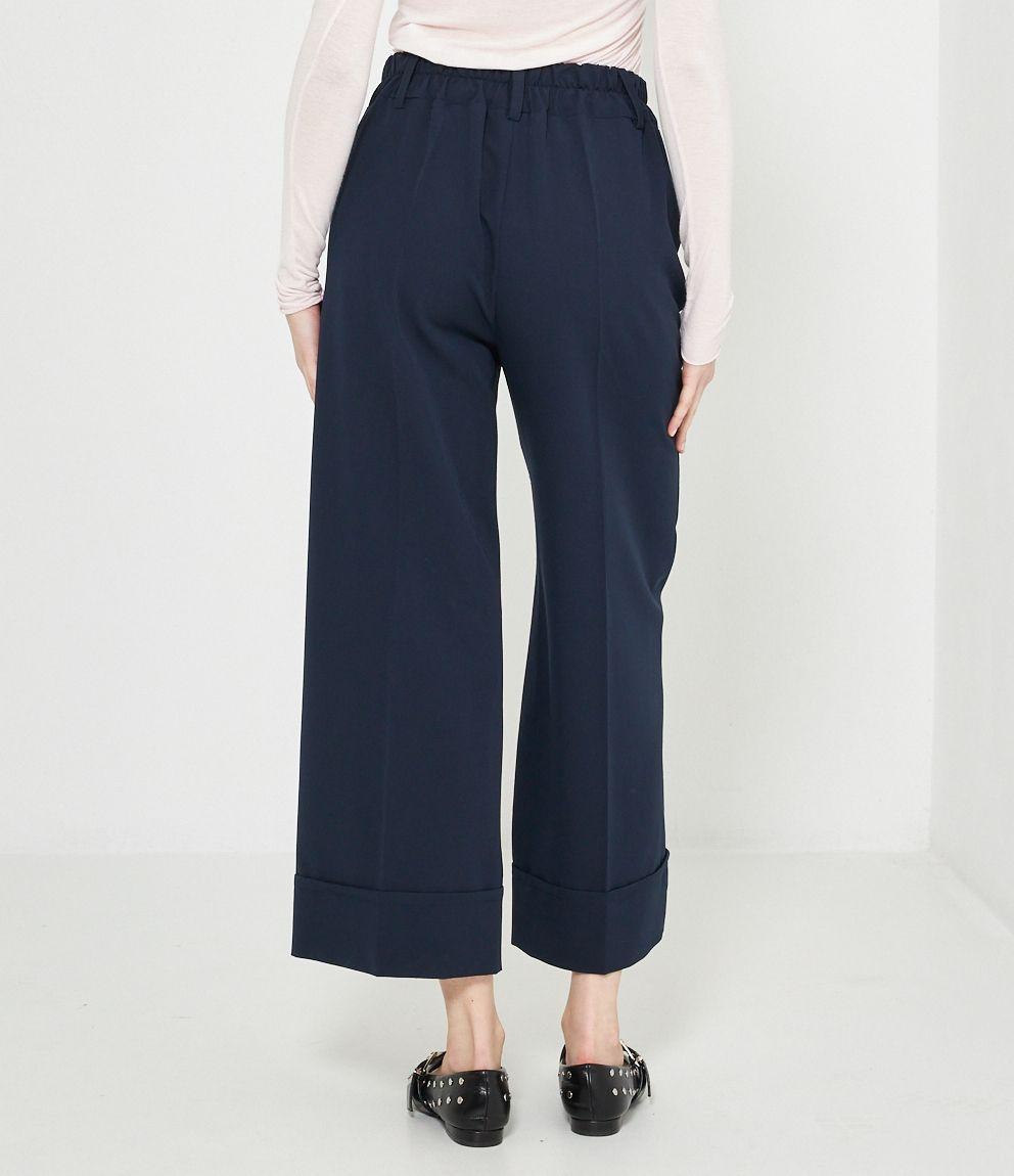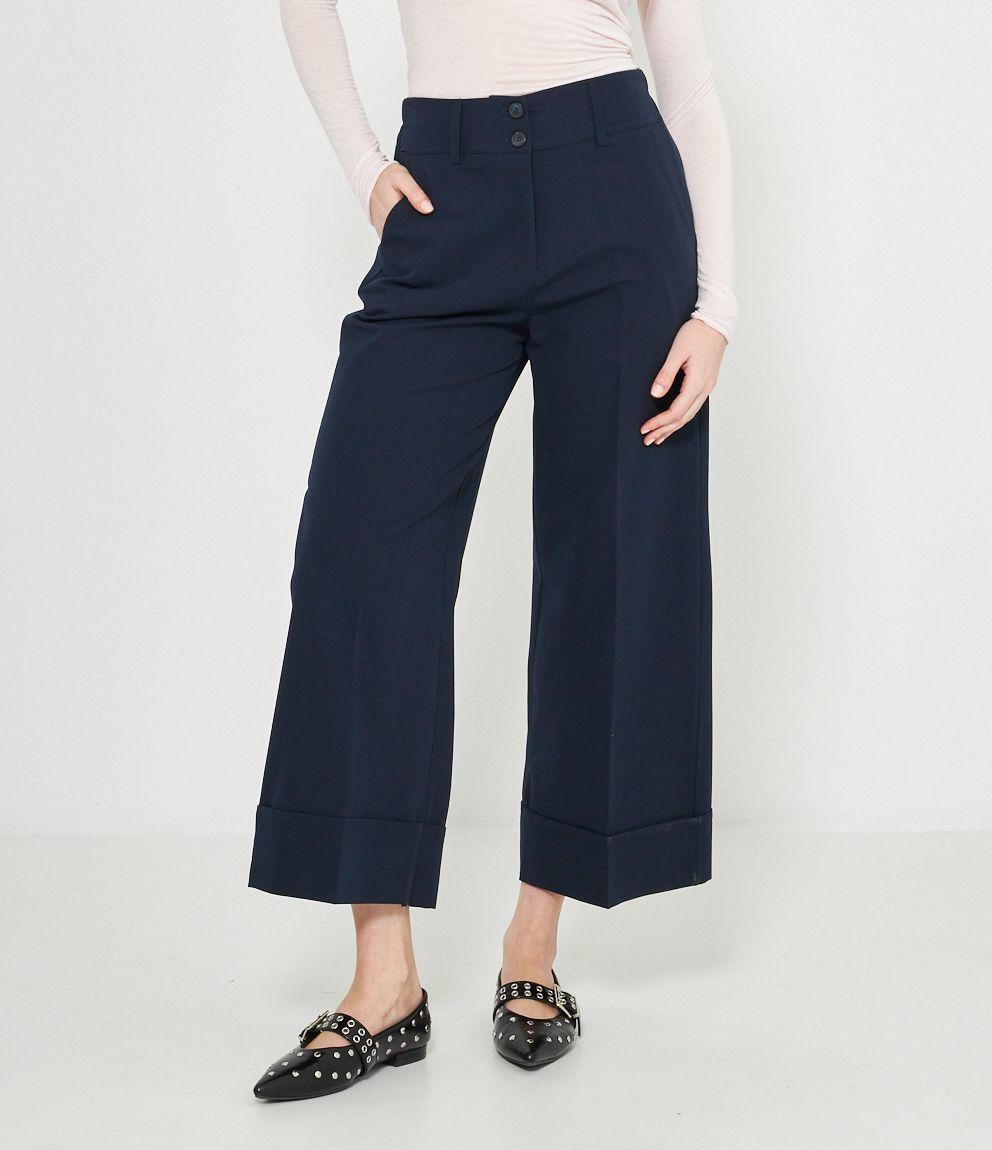 Pantaloni modello palazzo con piega alta sul fondo. Tasche laterali, elastico in vita sul retro e chiusura con zip e doppio bottone.