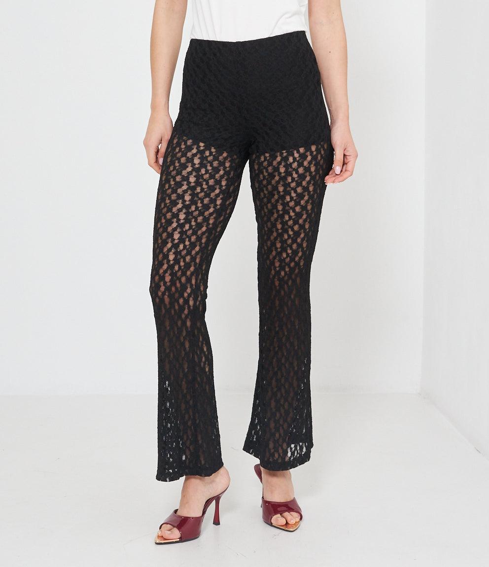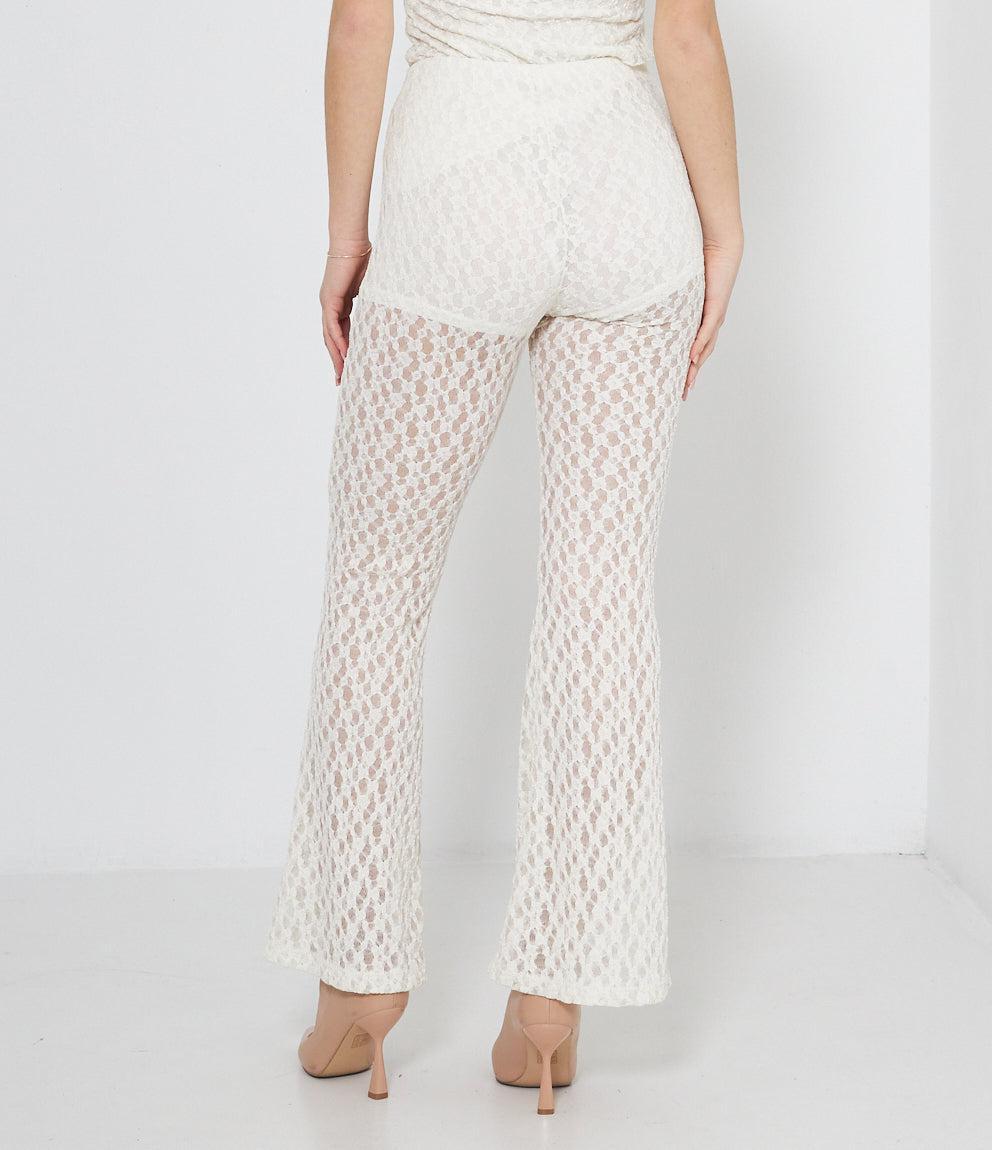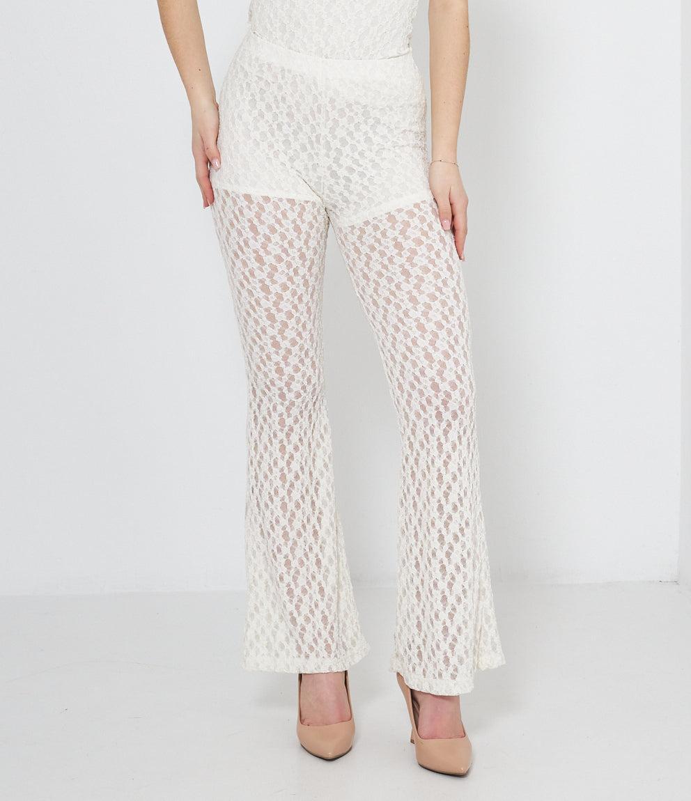 Pantaloni palazzo in pizzo traforato con motivo geometrico a pois. Caratterizzati da vita alta elasticizzata e gamba ampia svasata. La lavorazione traforata crea un effetto semi-trasparente elegante e femminile.