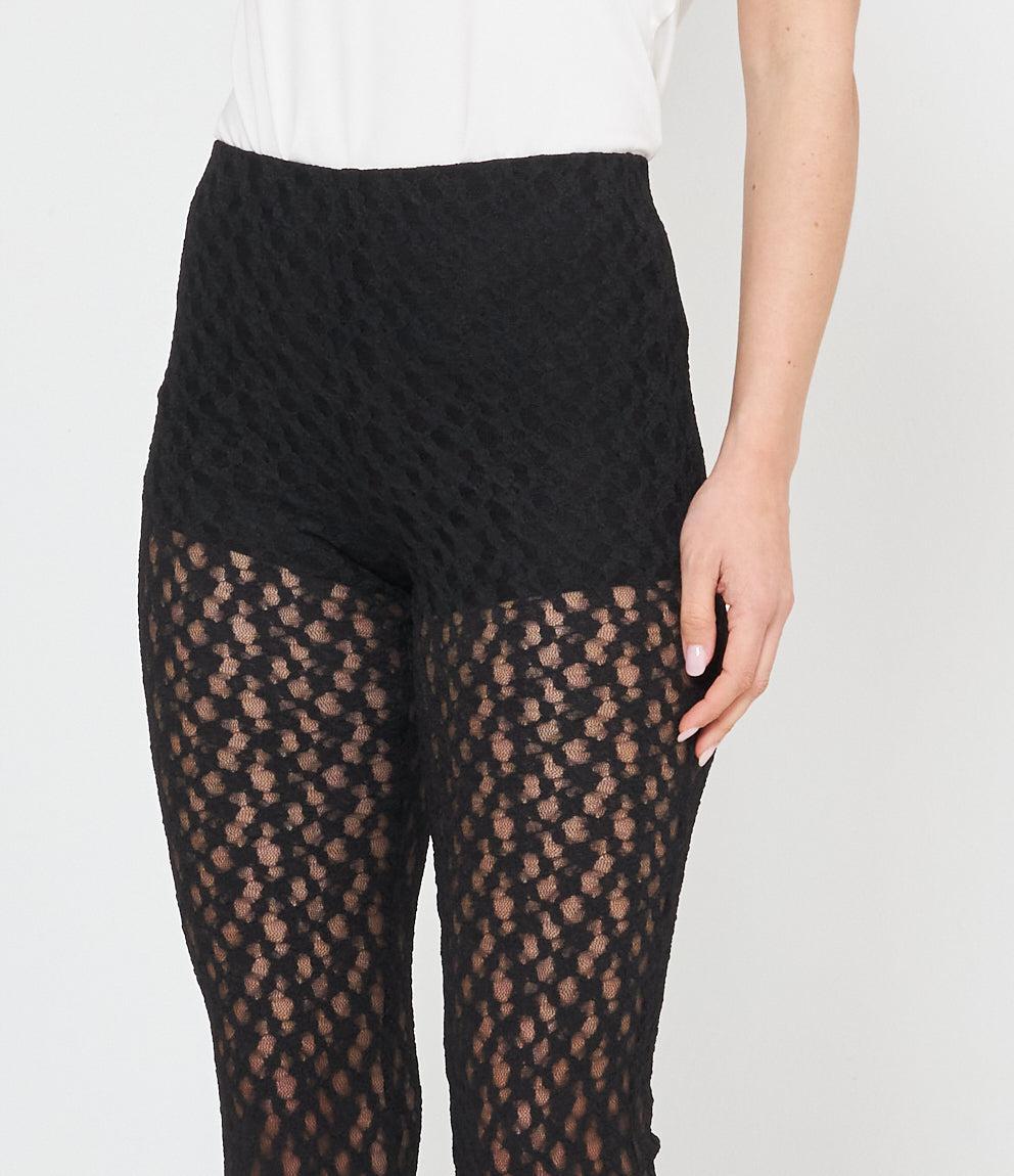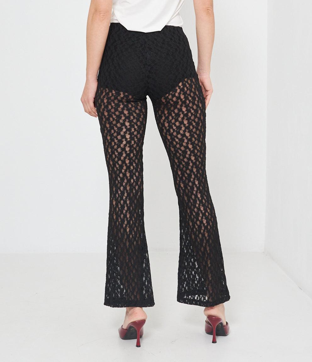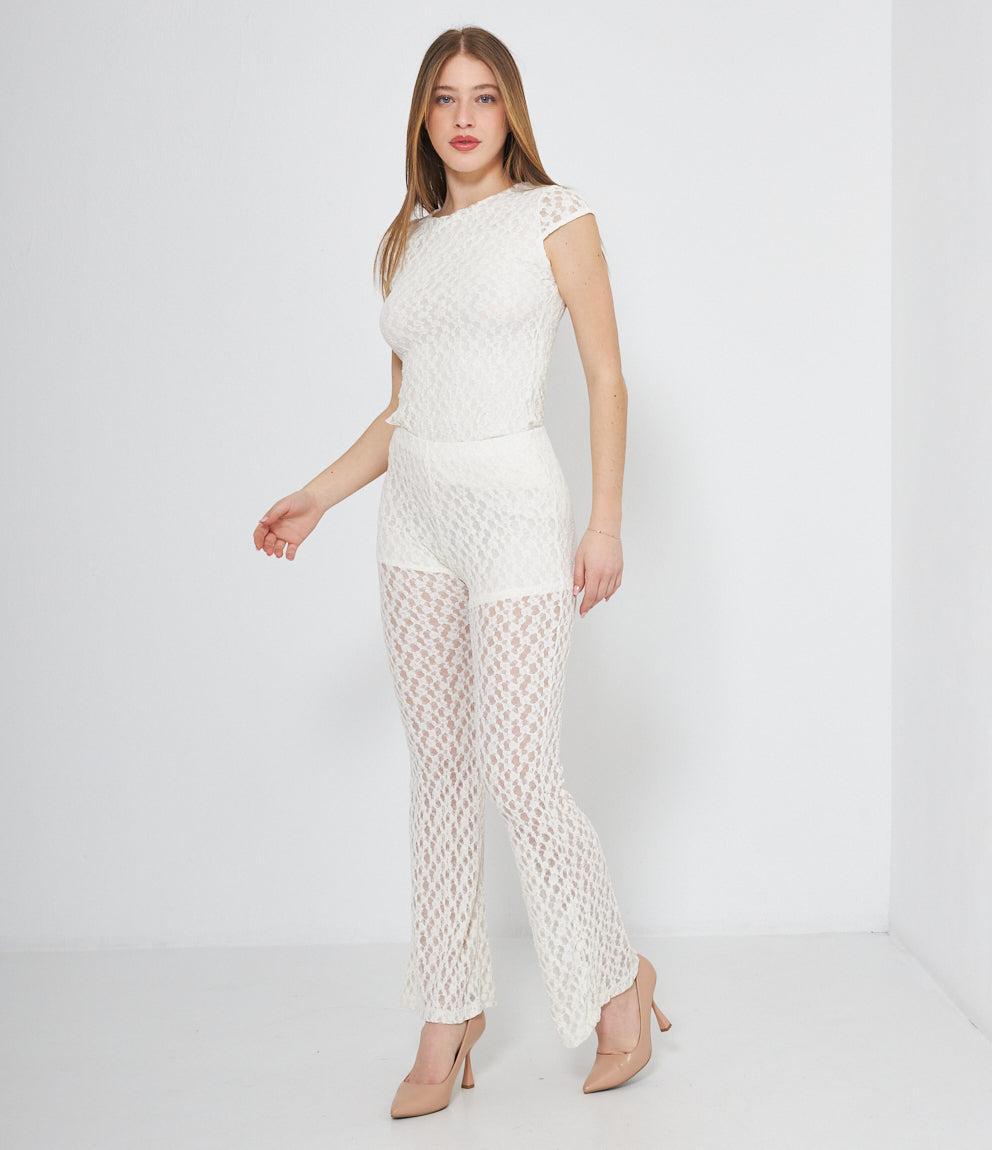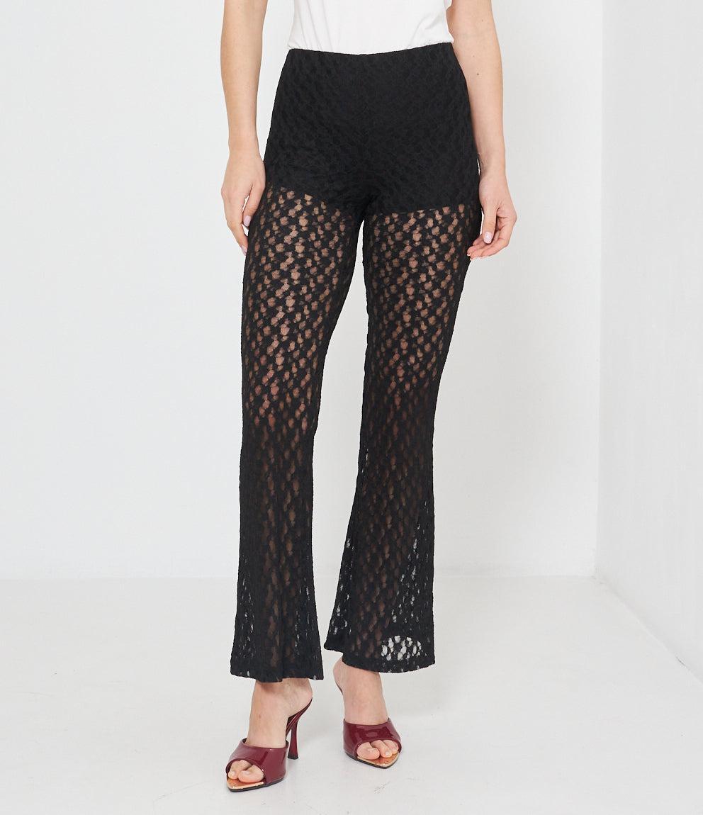 Pantaloni palazzo in pizzo traforato con motivo geometrico a pois. Caratterizzati da vita alta elasticizzata e gamba ampia svasata. La lavorazione traforata crea un effetto semi-trasparente elegante e femminile.