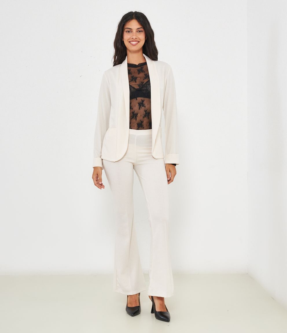 Blazer senza chiusura con collo revers e tasche. Maniche con risvolti.