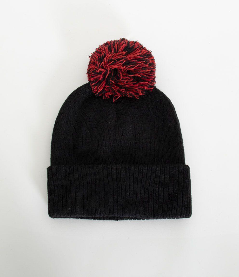 Cappello in maglia con pon pon e risvolto con ricamo.
