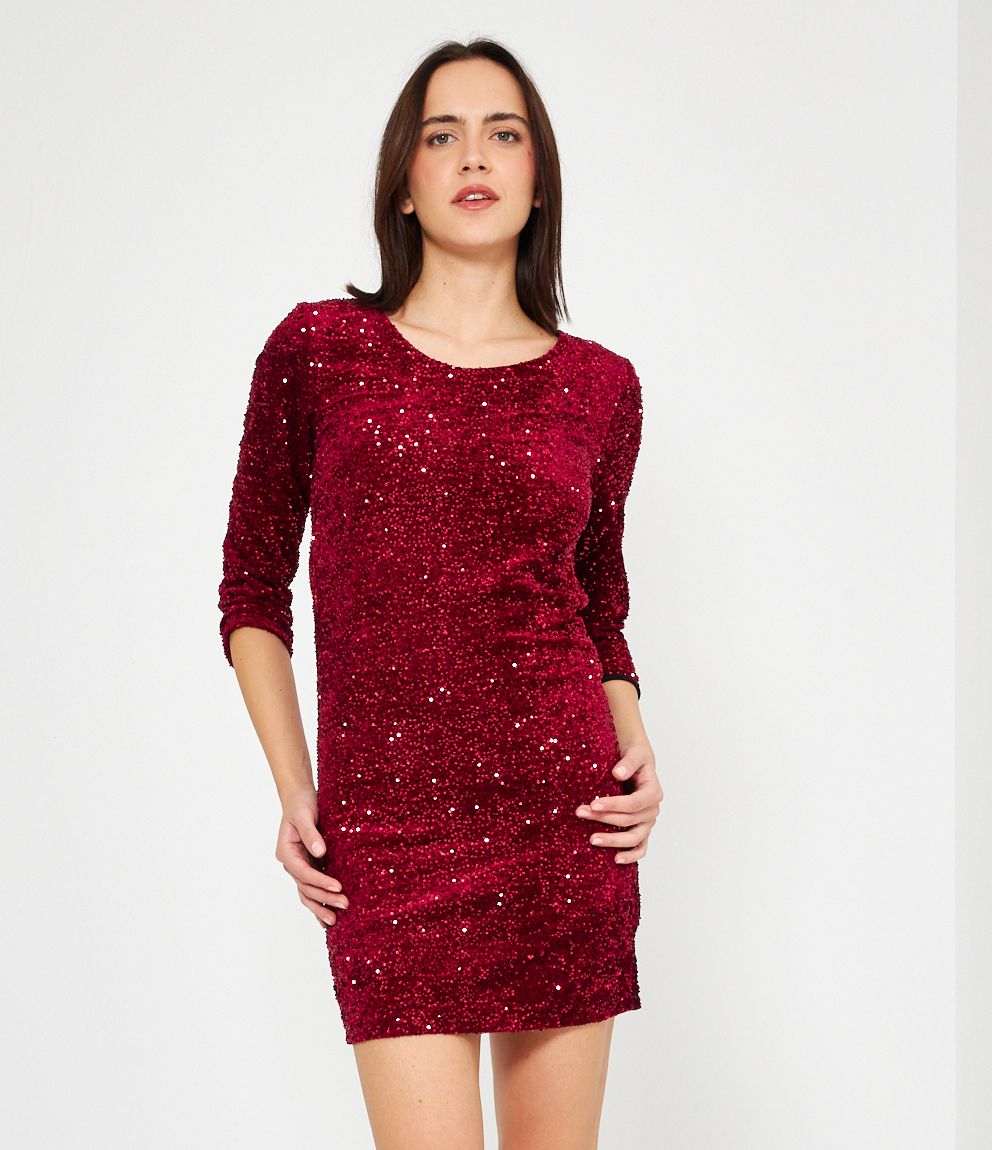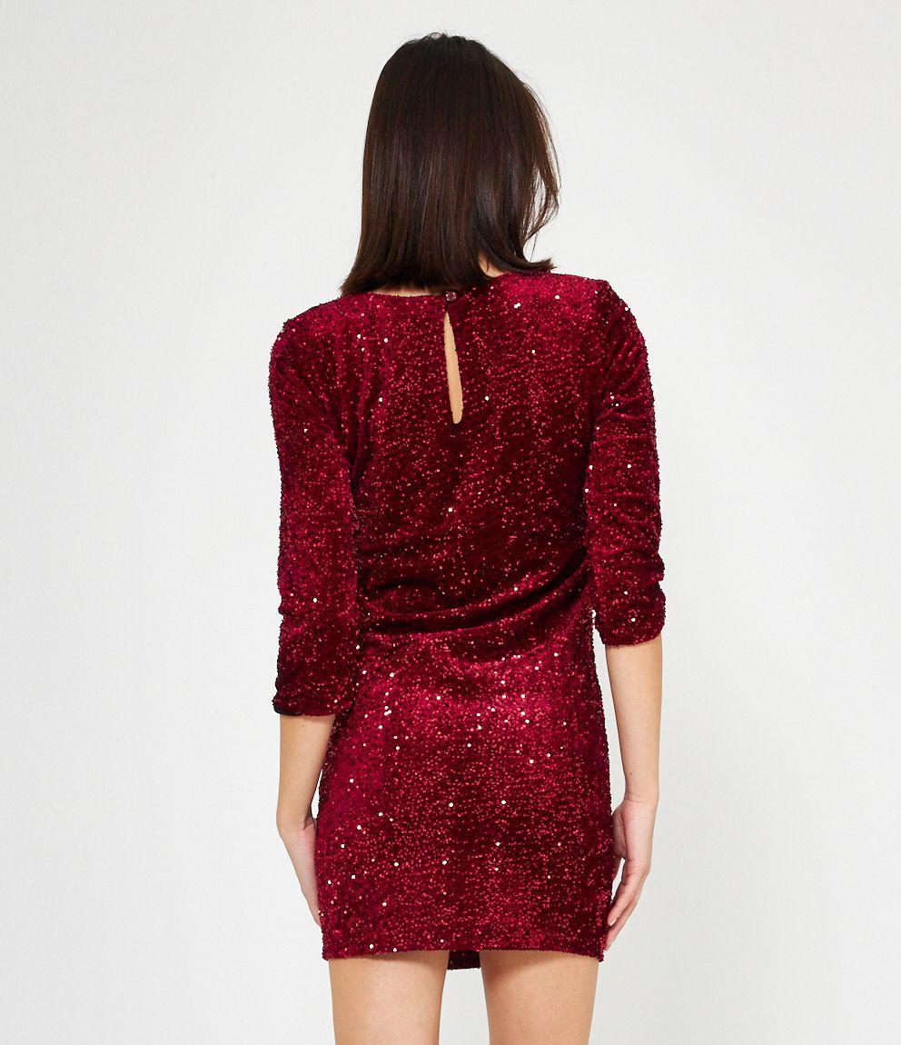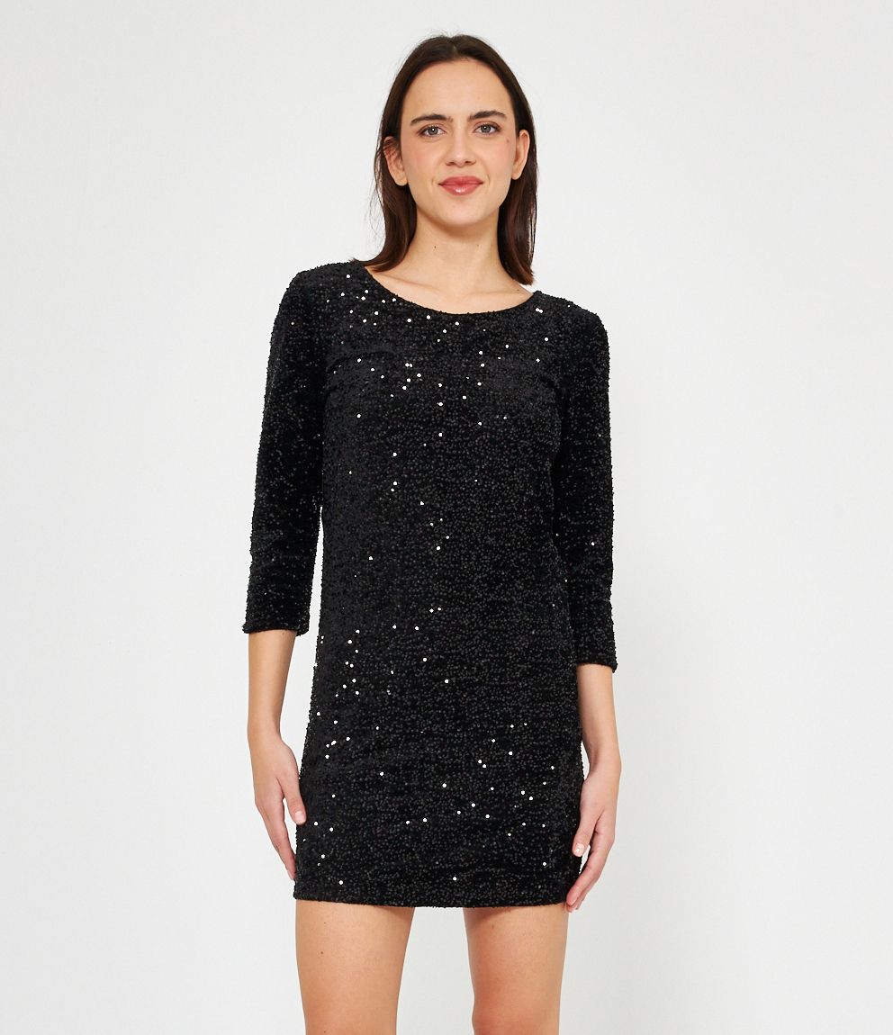 Abito mini in ciniglia a paillettes con scollo tondo e chiusura con bottone sul retro.