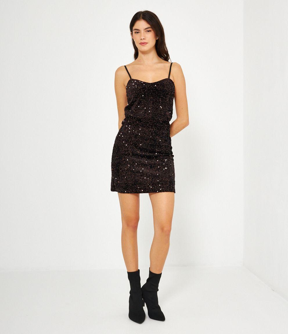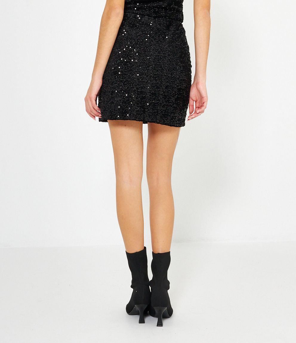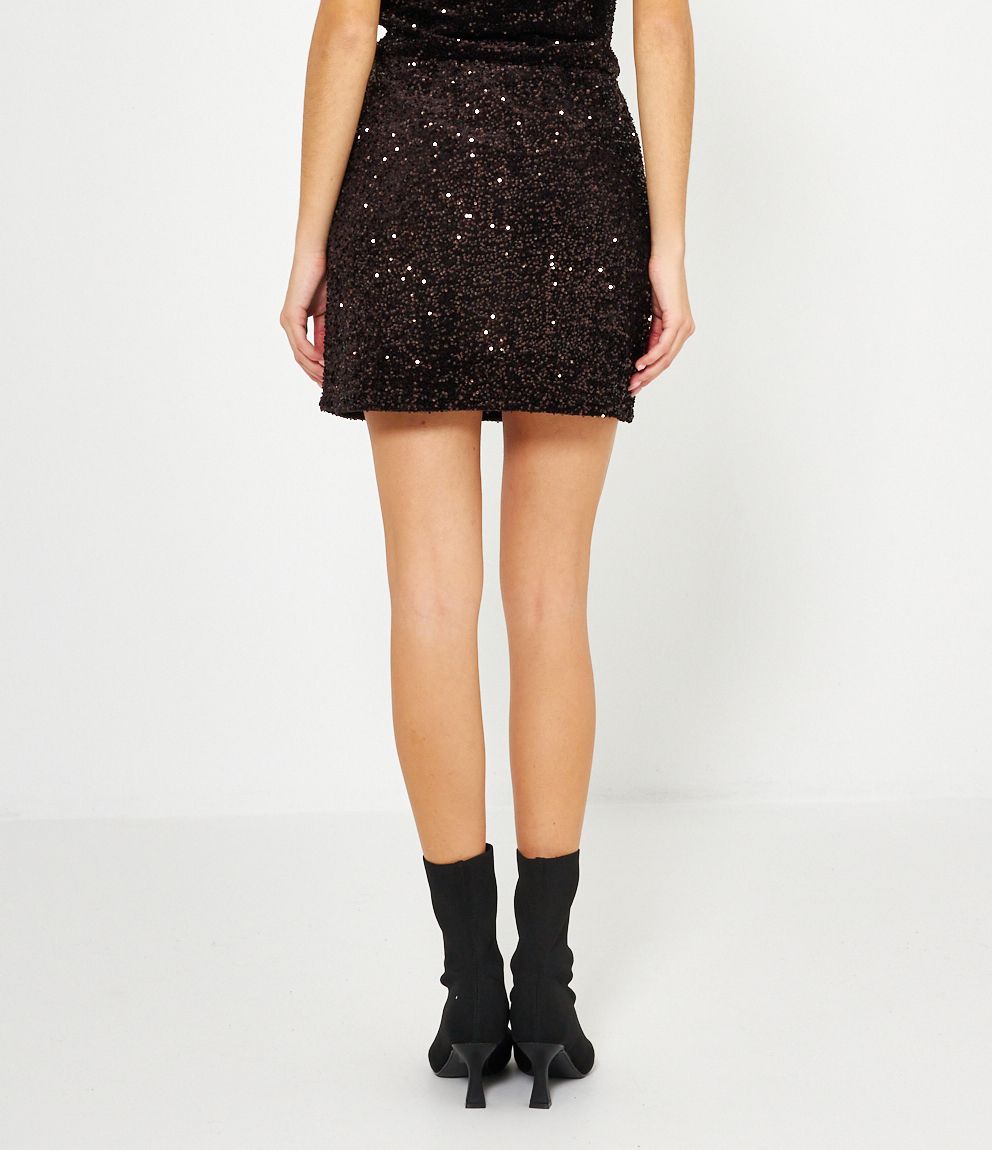 Minigonna in ciniglia a paillettes con vita elasticizzata.