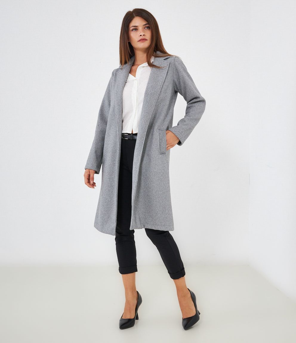 Cappotto modello midi senza chiusura con collo revers con tasche a filetto.