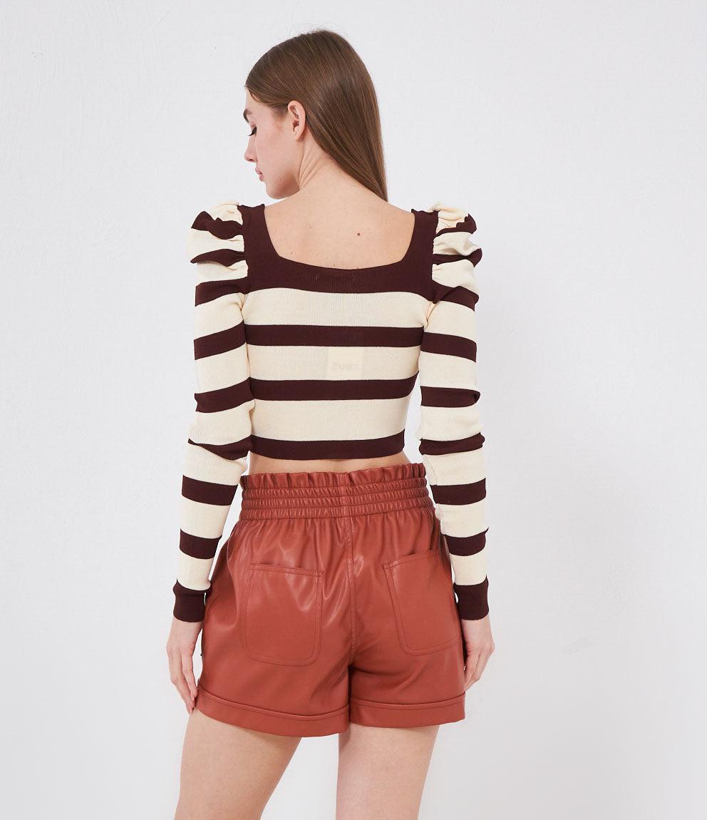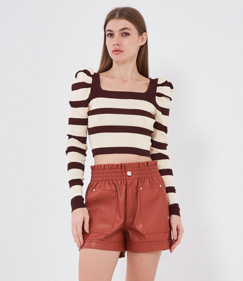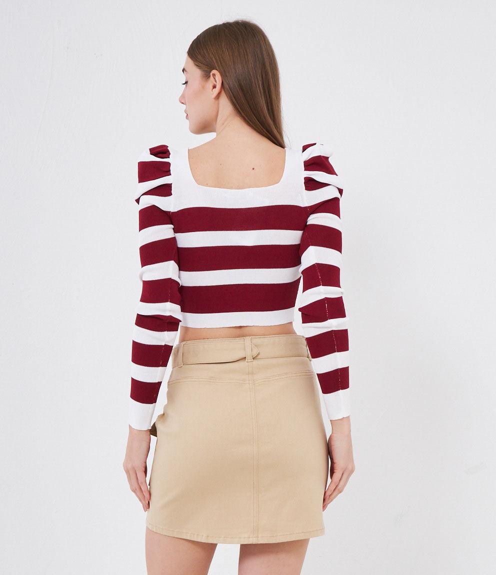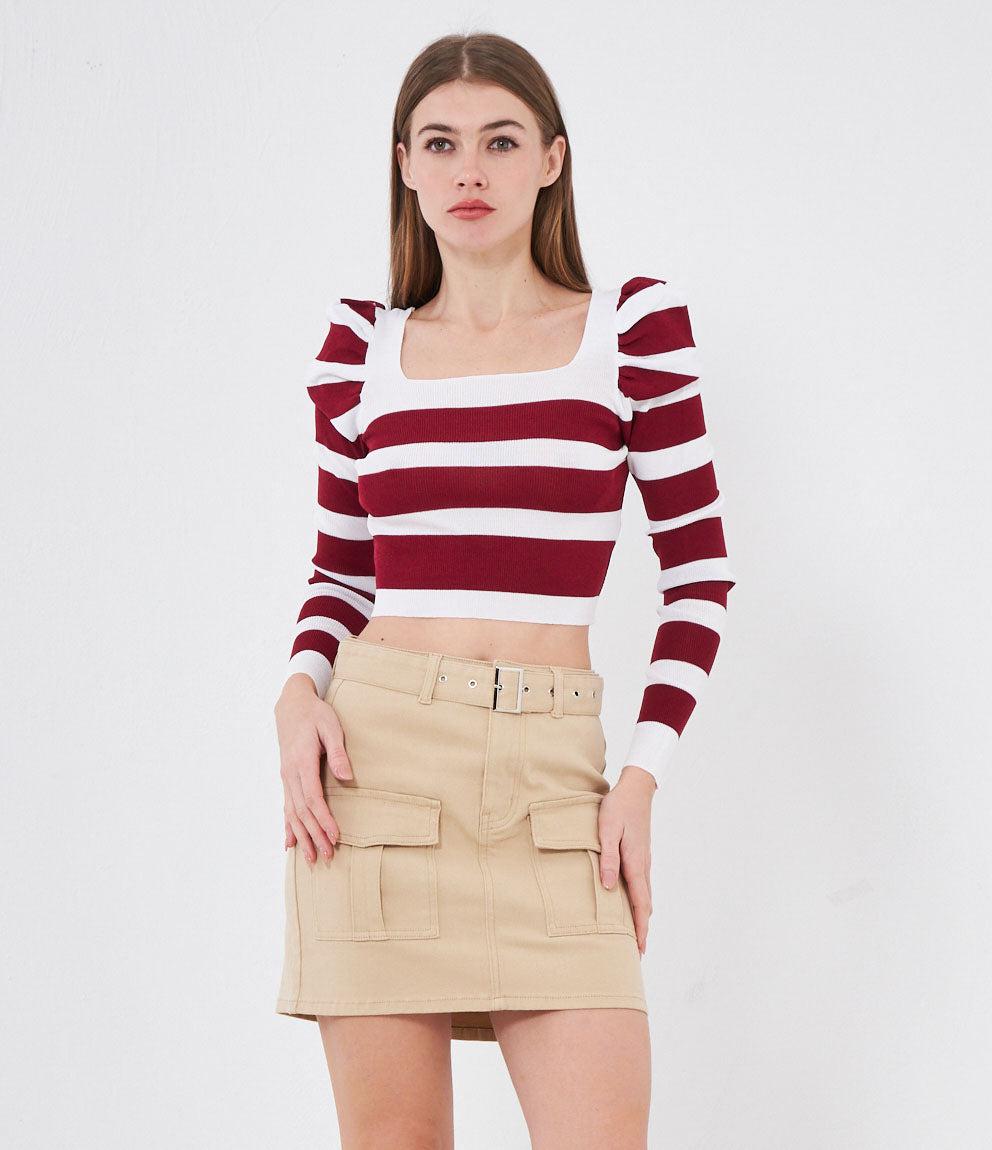 Maglia modello crop a righe con maniche a sbuffo e scollo quadrato.