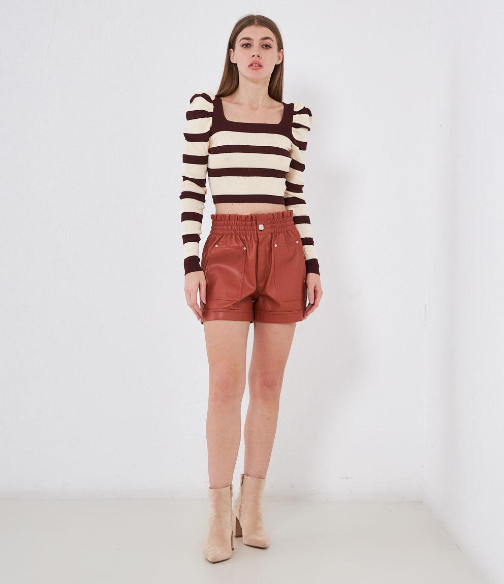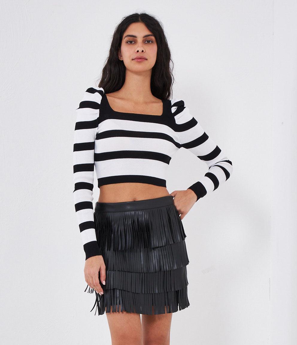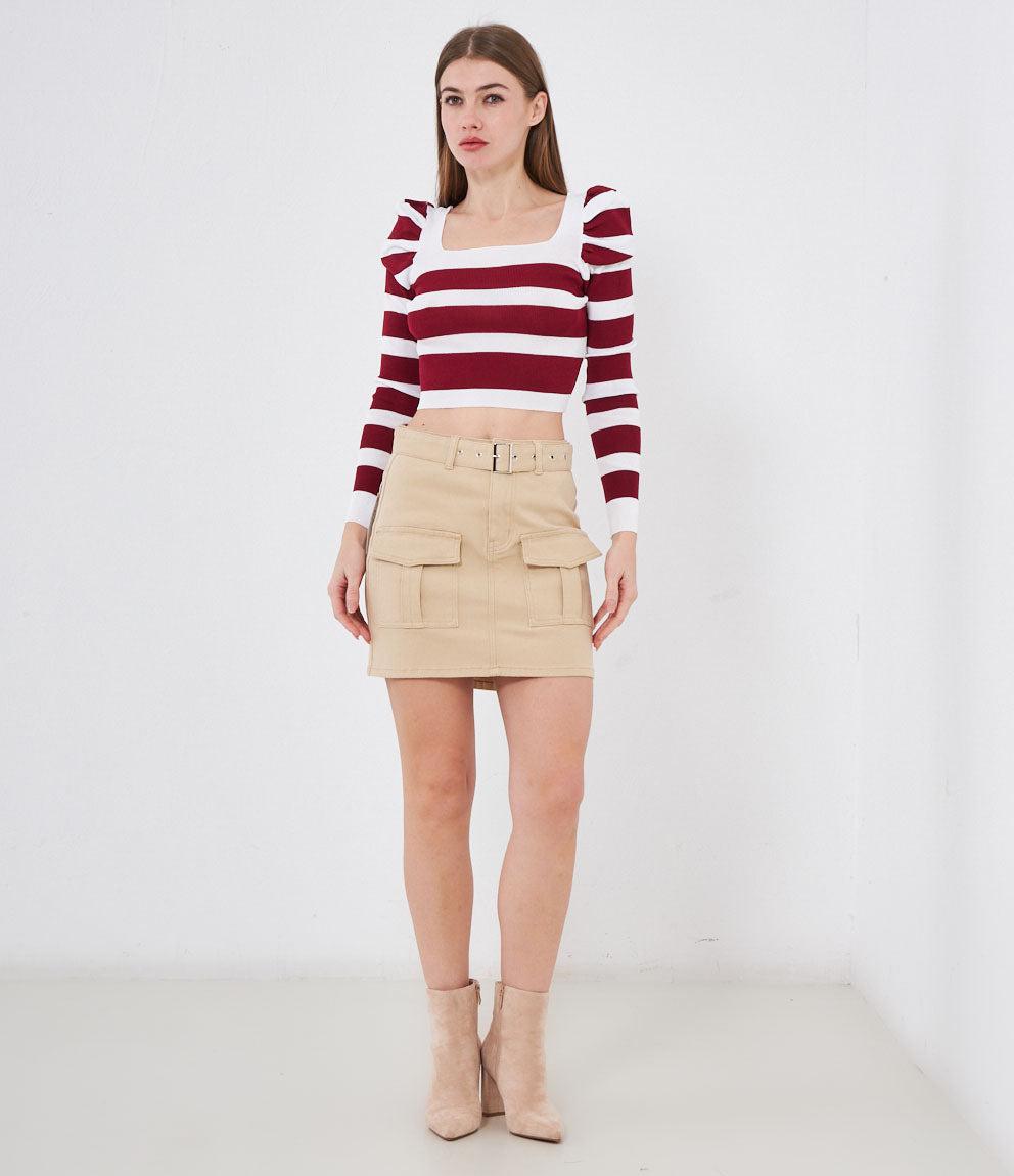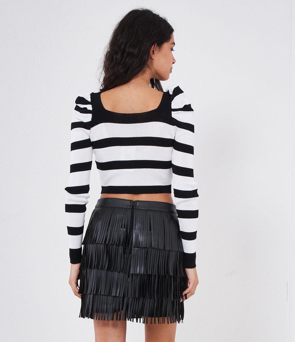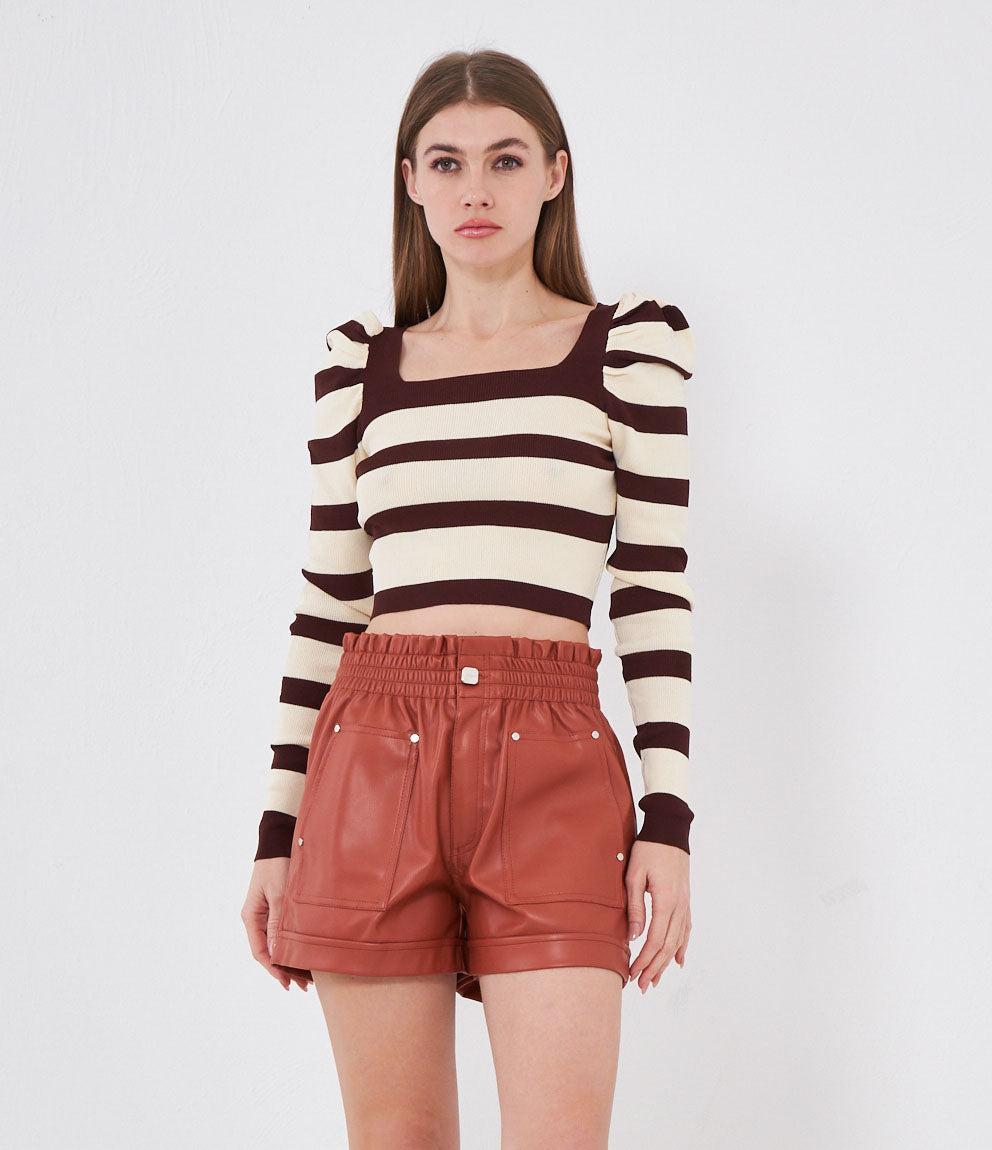 Maglia modello crop a righe con maniche a sbuffo e scollo quadrato.