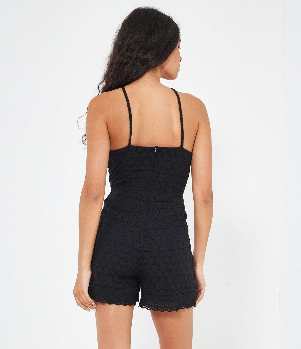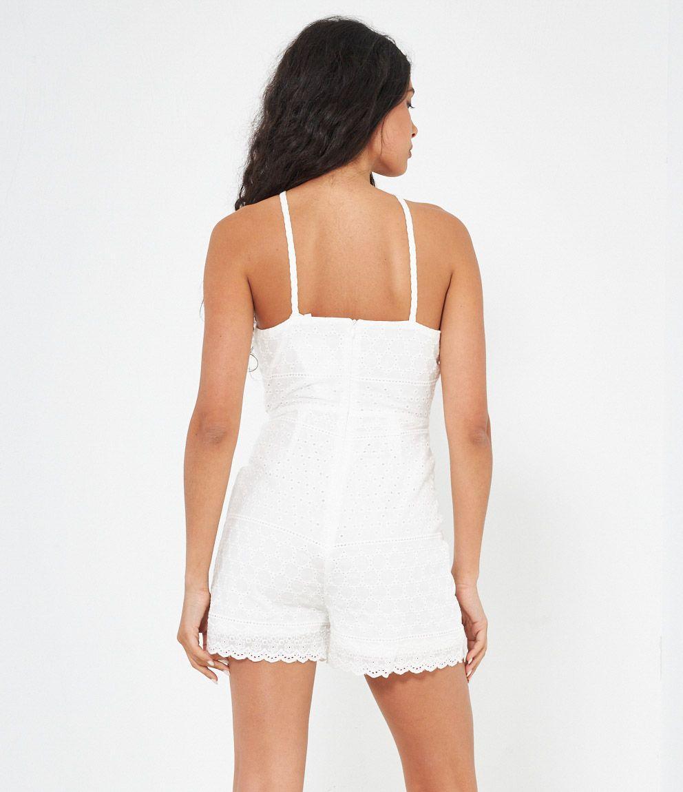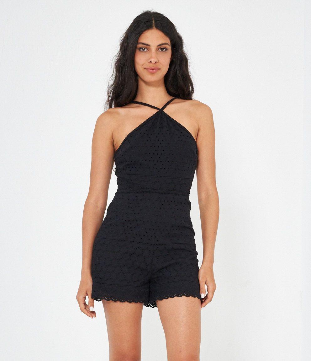Tuta lavorata con shorts a fondo ondulato, scollo con spalline sottili. Chiusura con zip sul retro.