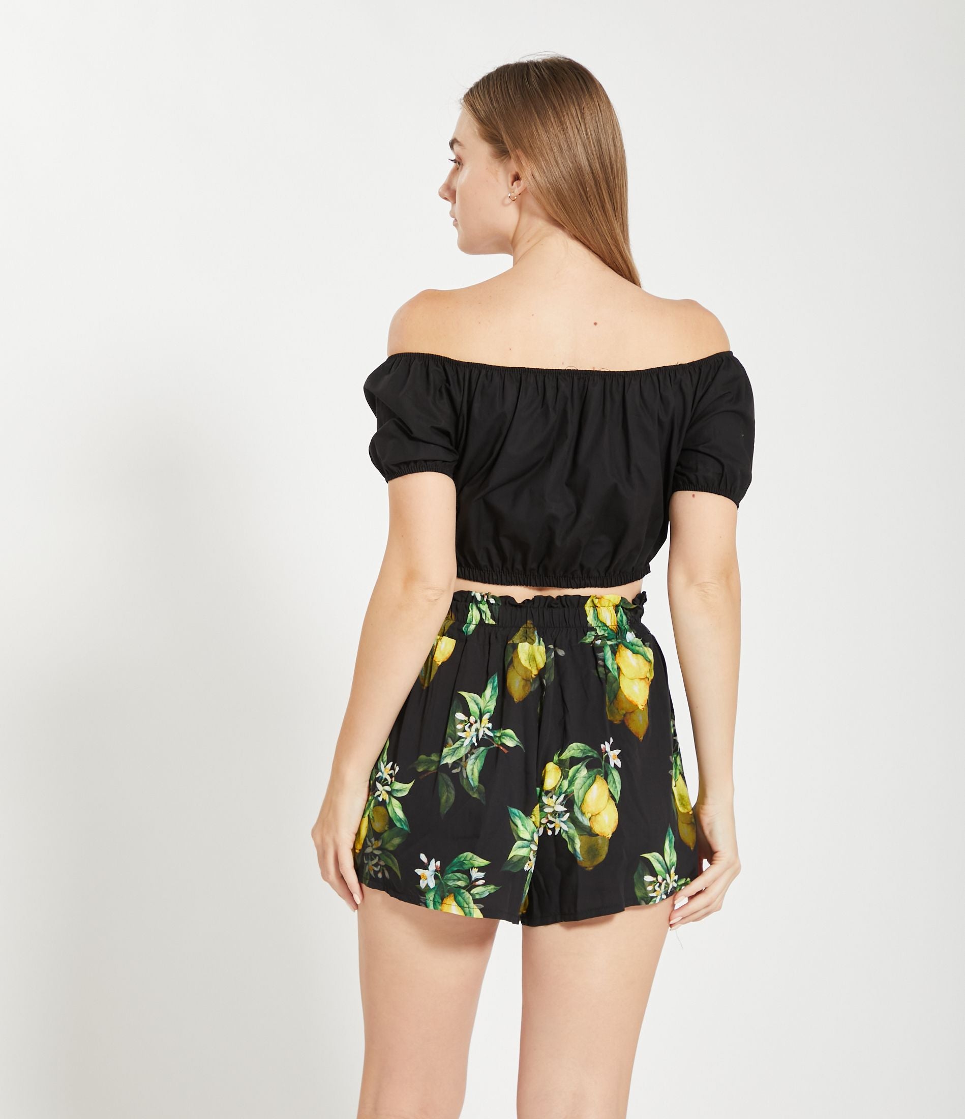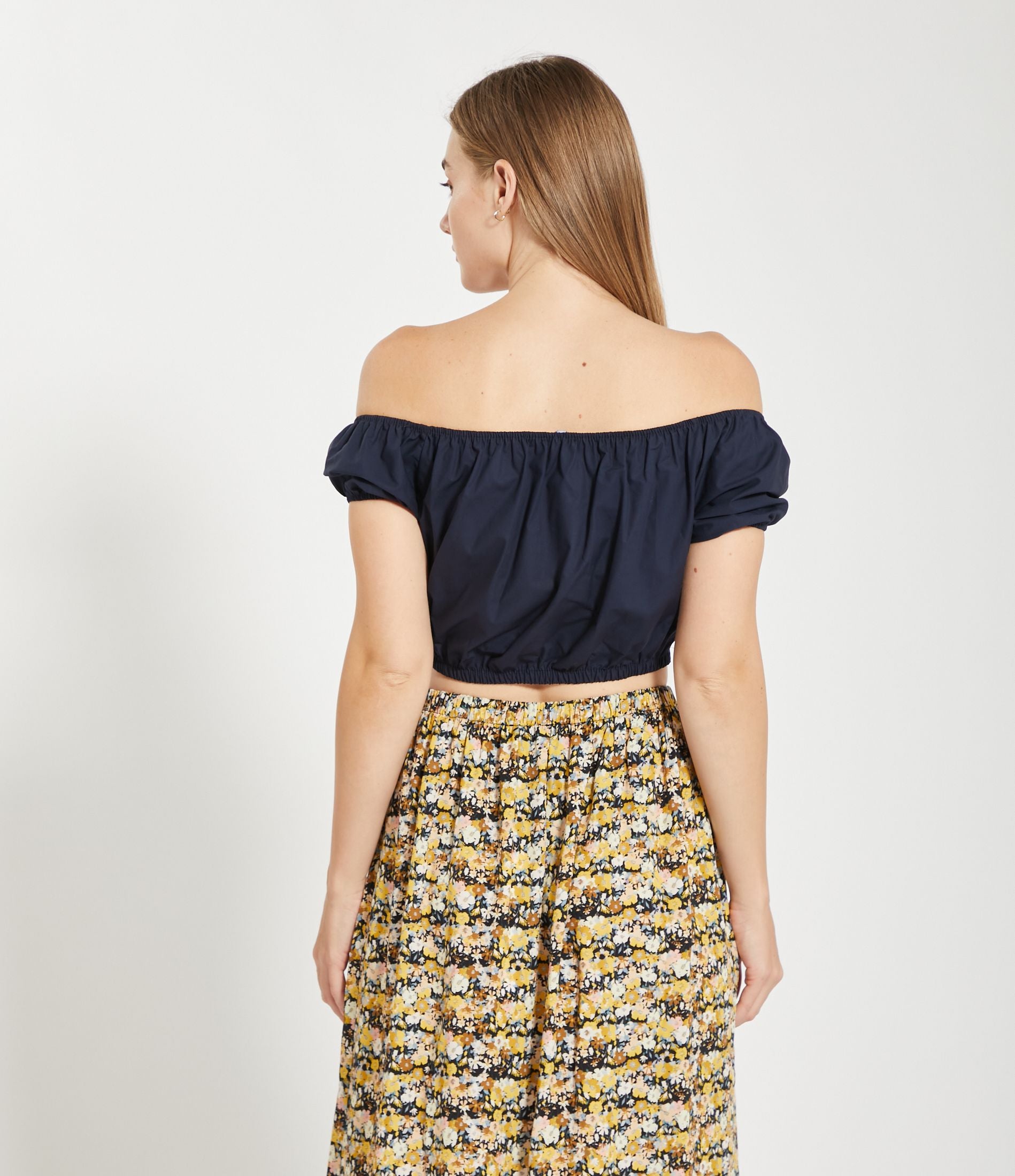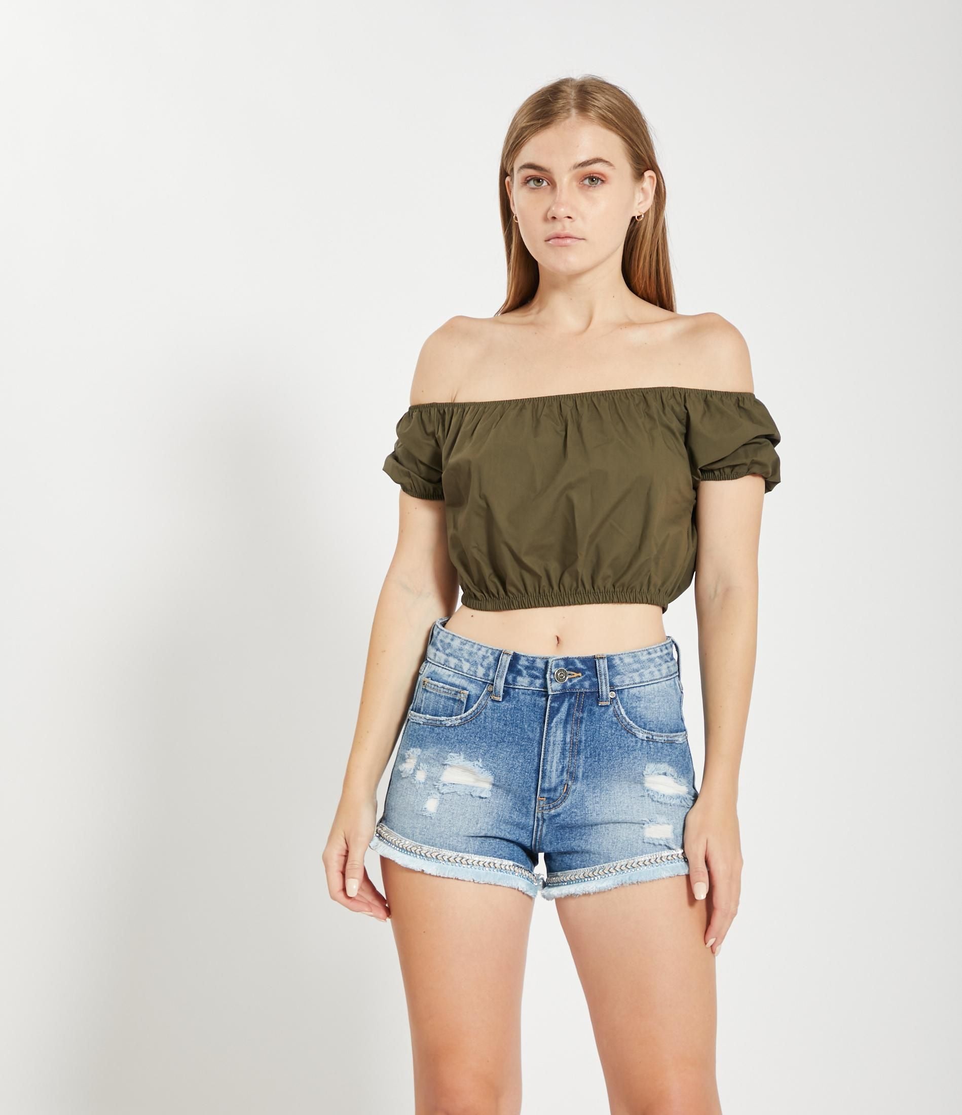 Top corto in vita con spalle scoperte e mezze maniche e bordi elastici.
