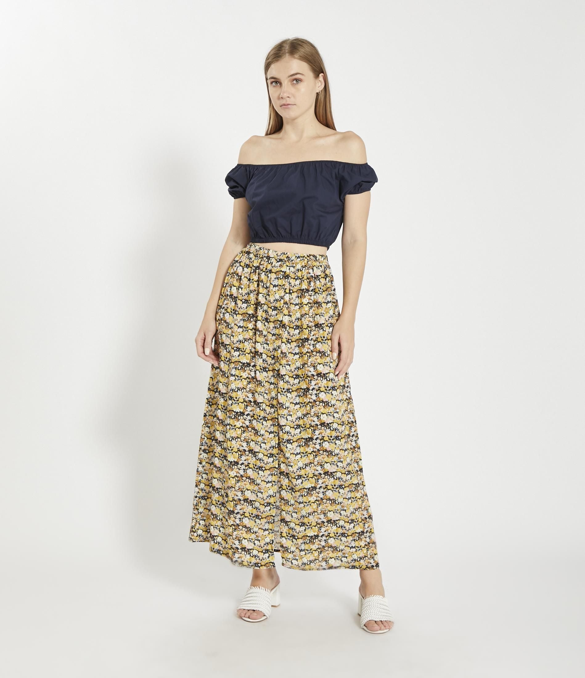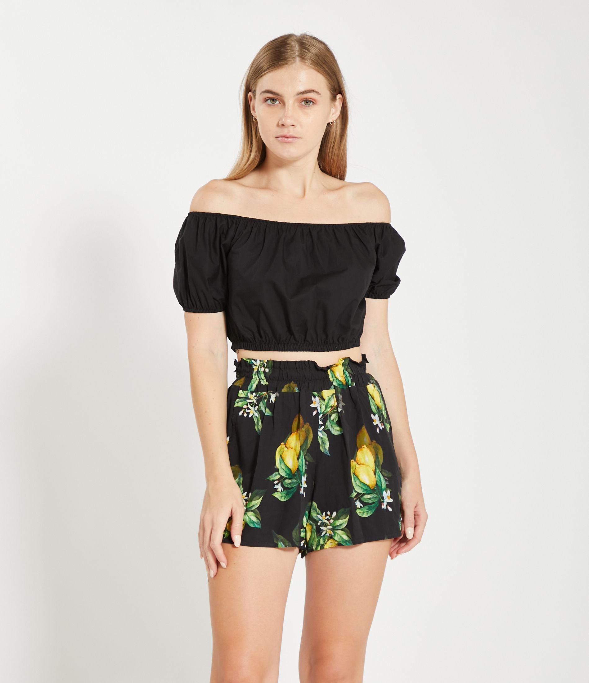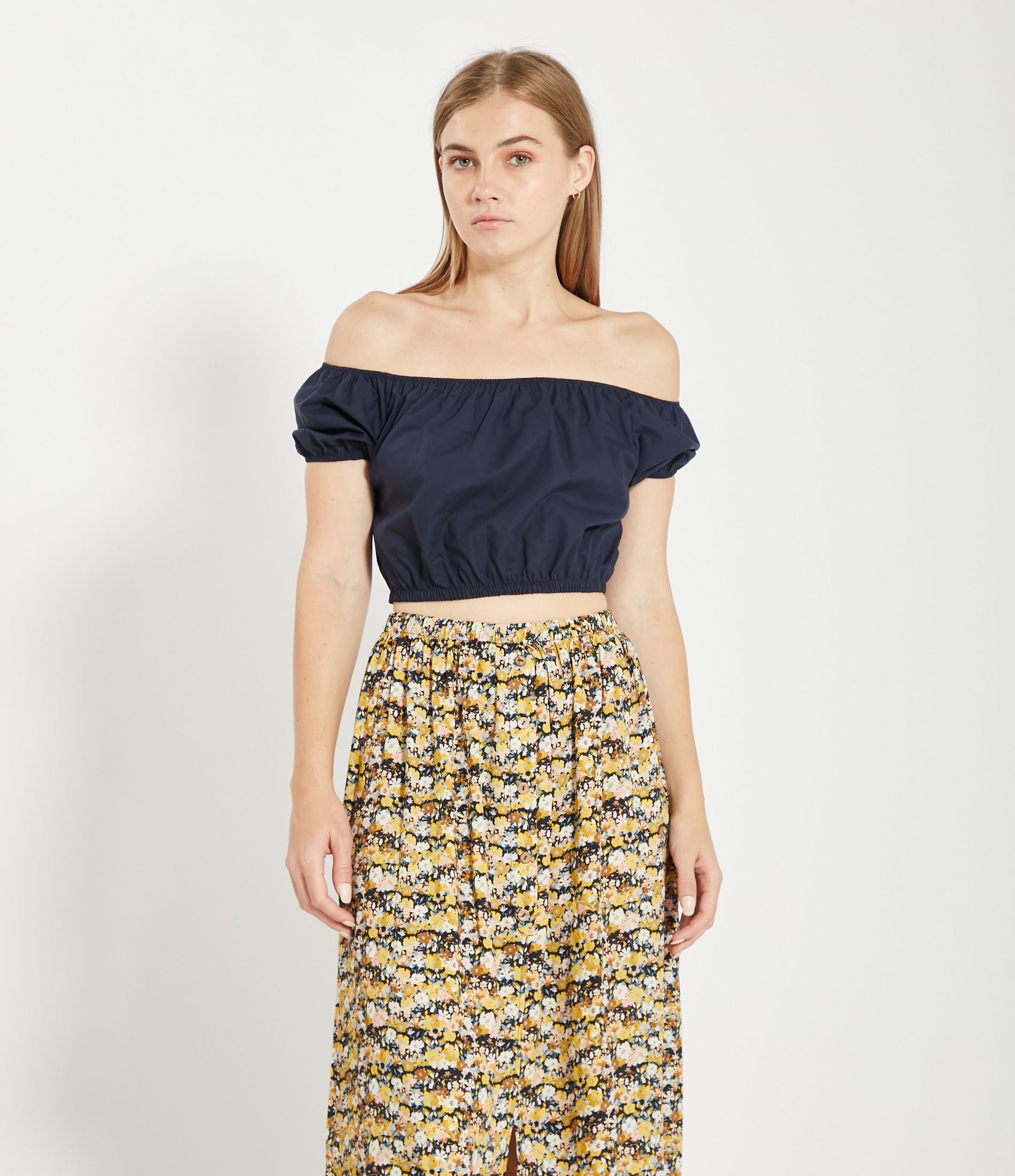Top corto in vita con spalle scoperte e mezze maniche e bordi elastici.