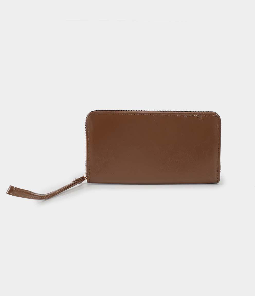 Portafogli rettangolare con manico laterale, chiusura con zip e scomparti interni.