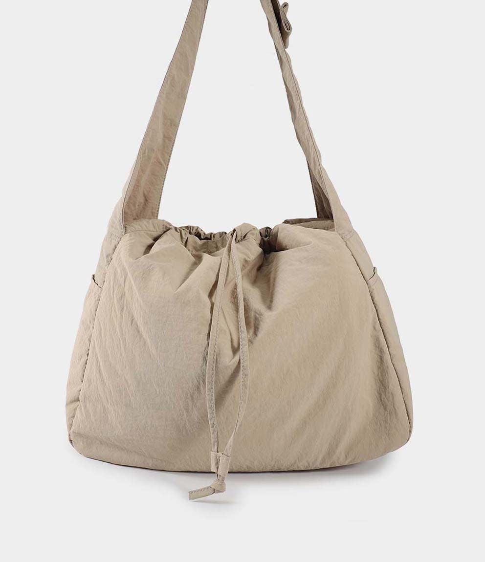Borsa a spalla con scomparto interno, chiusura con coulisse regolabile.