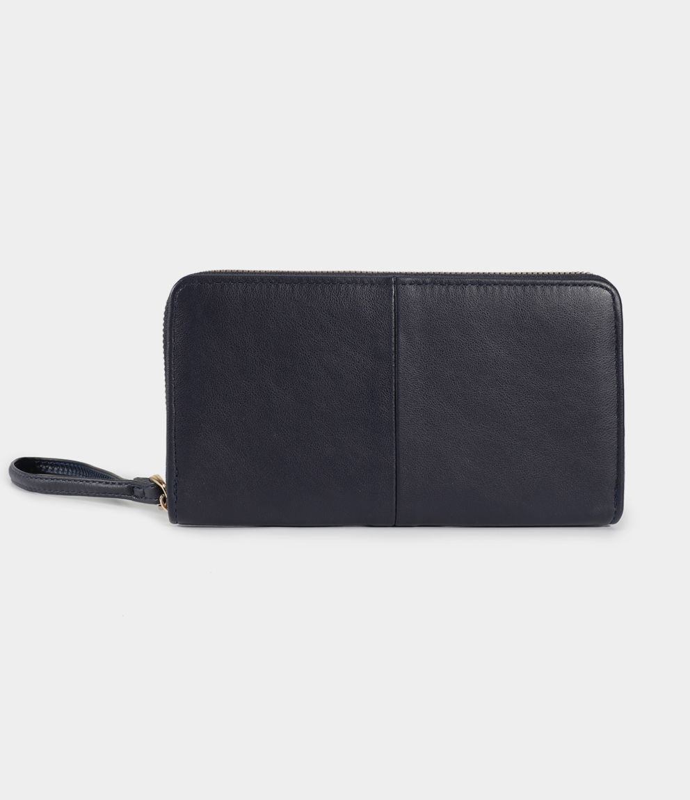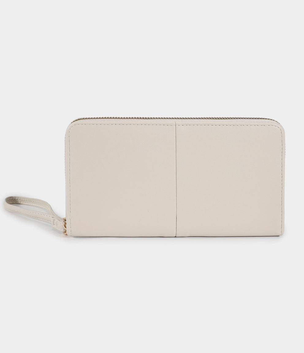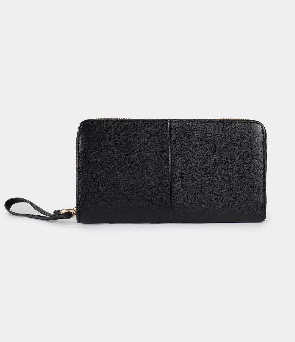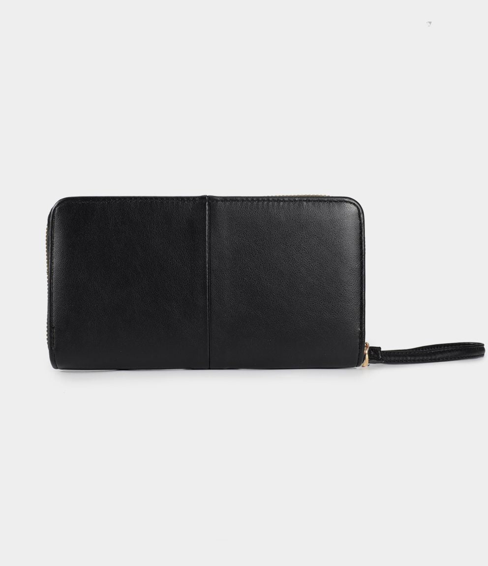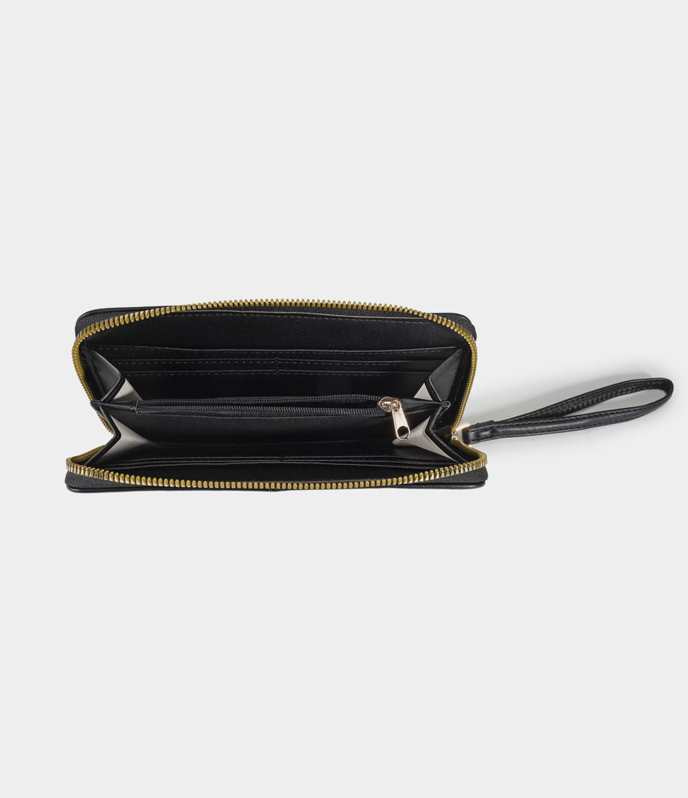 Portafogli effetto pelle con manico, portamonete interno e chiusura con zip.