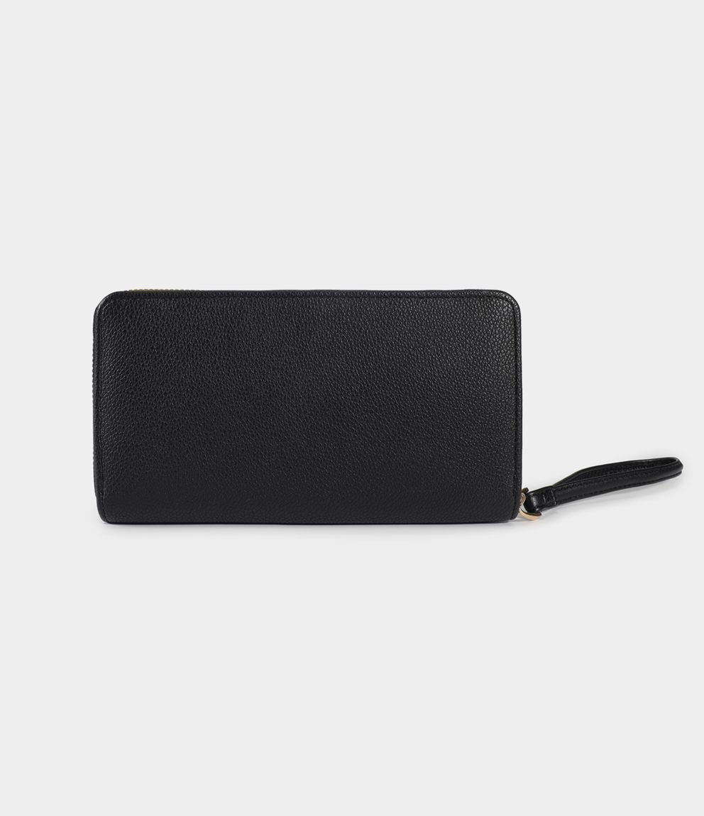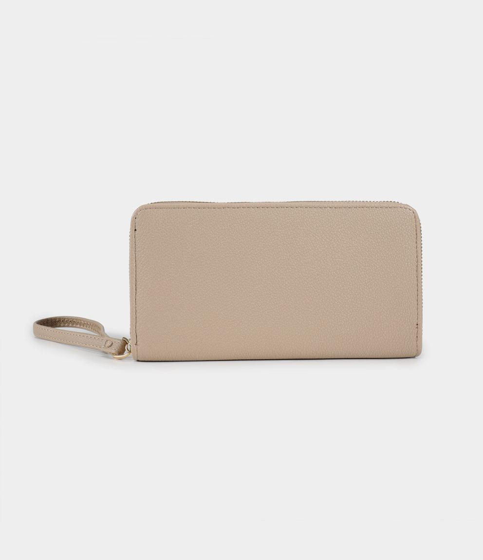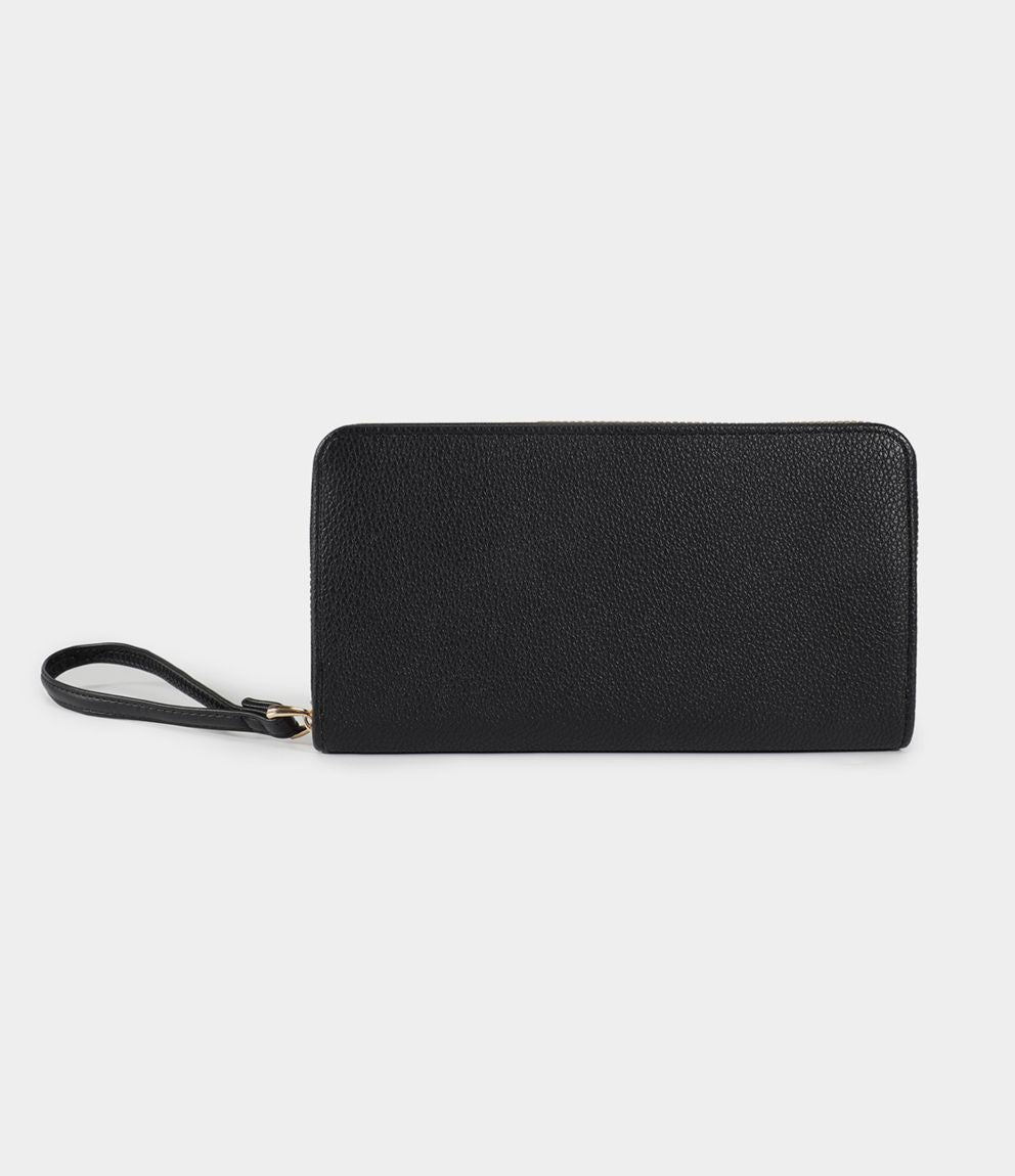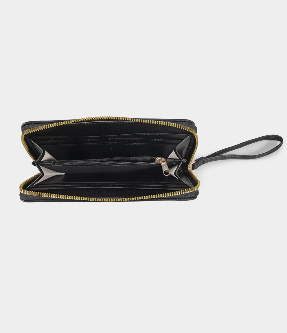 Portafogli rettangolare con manico, portamonete e scomparti interni. Chiusura con zip.