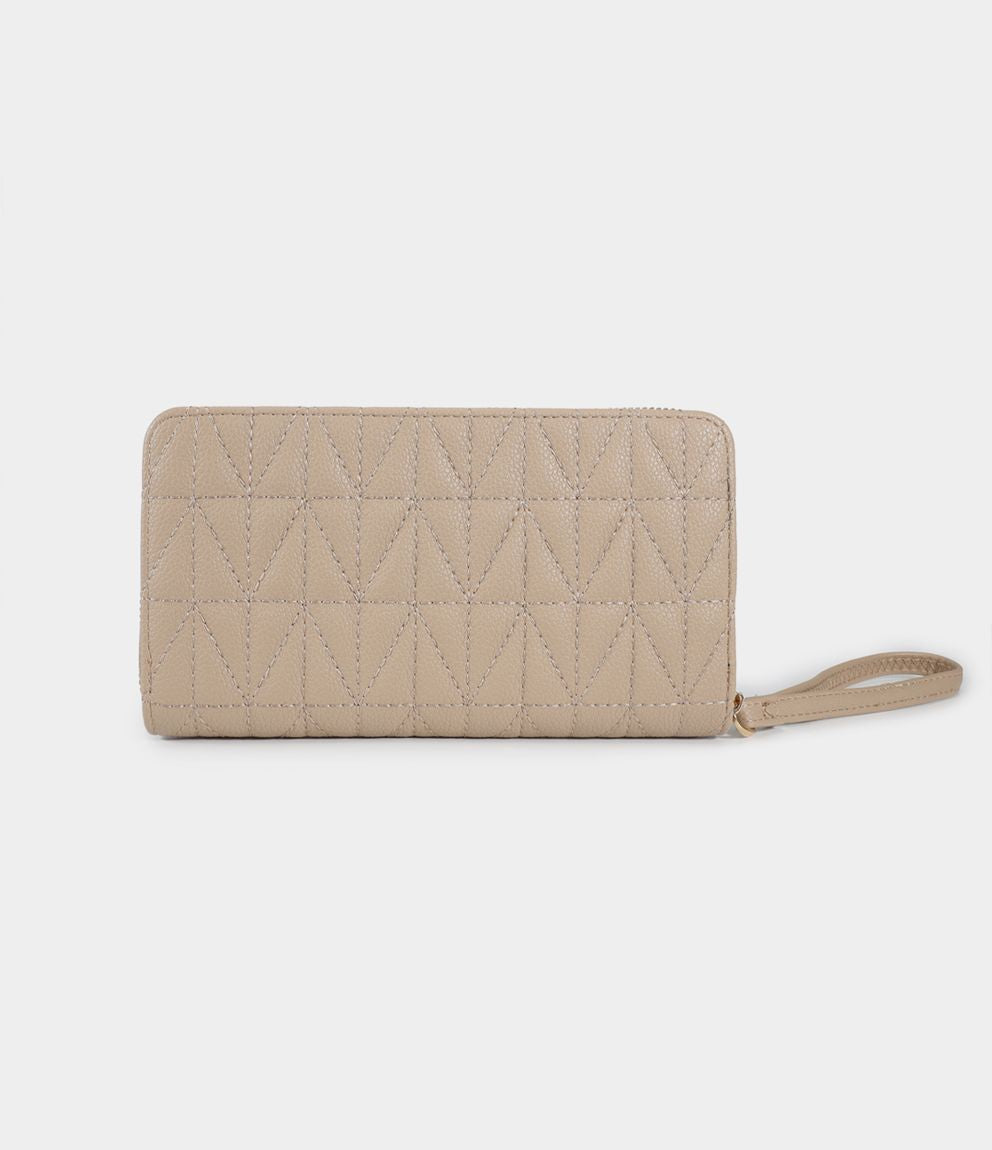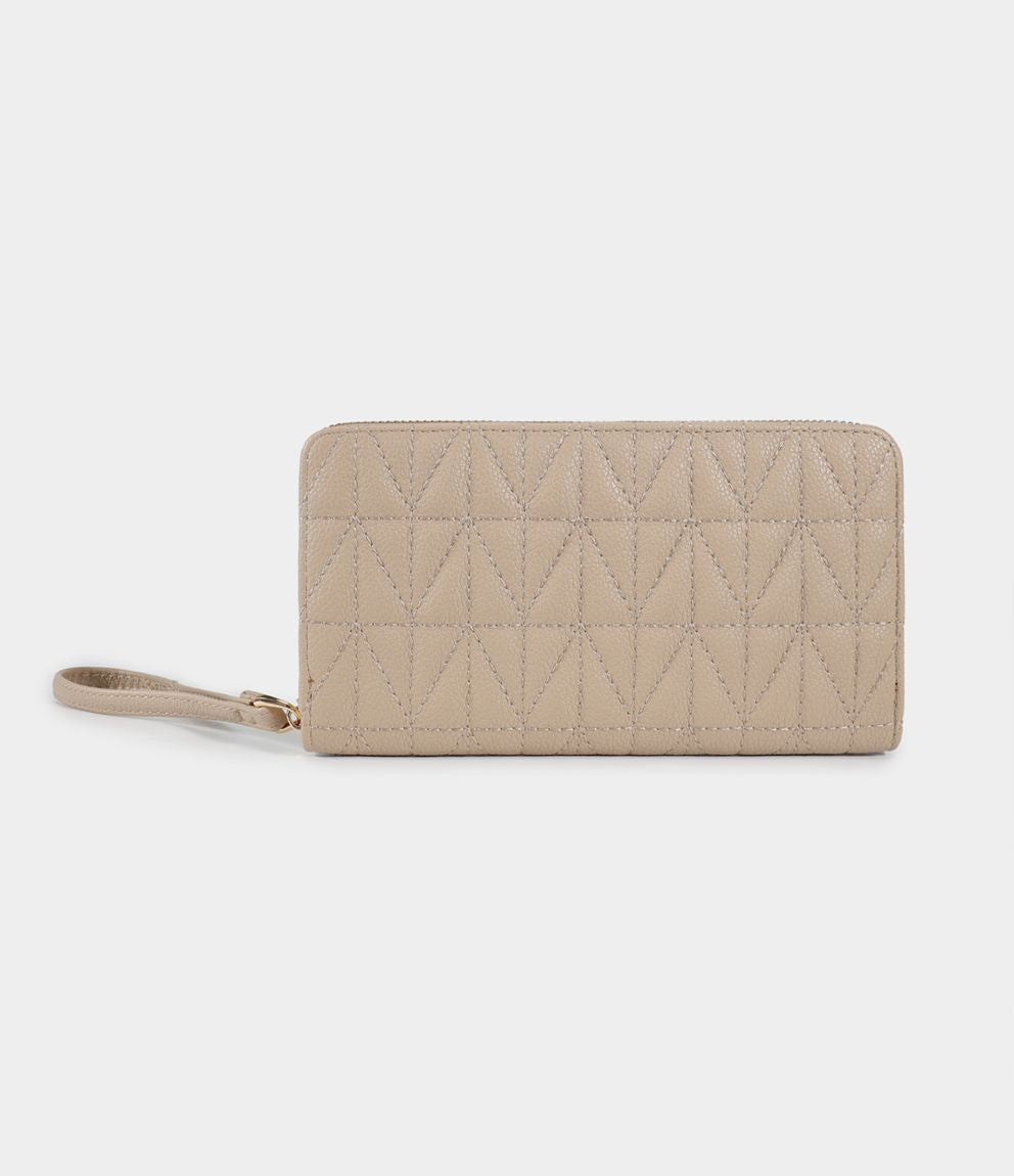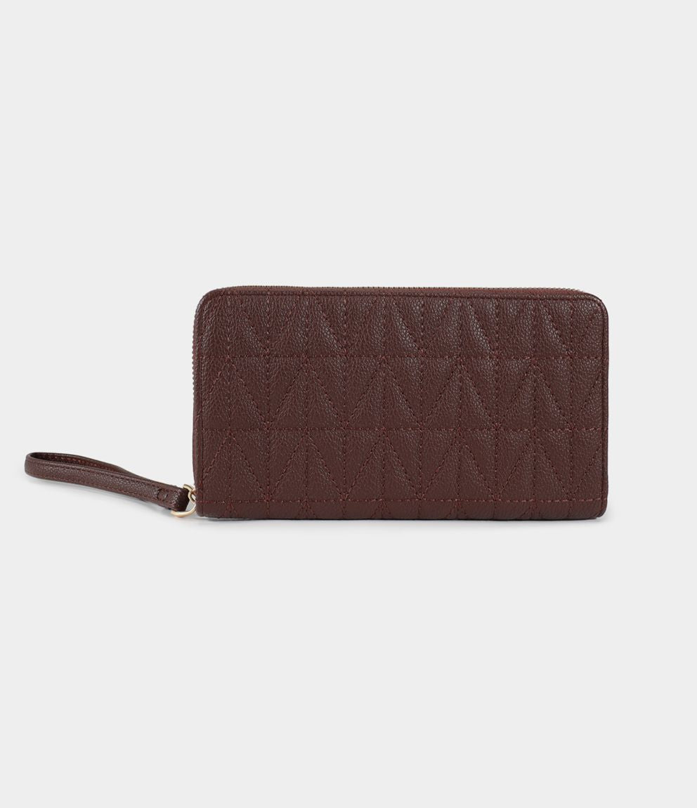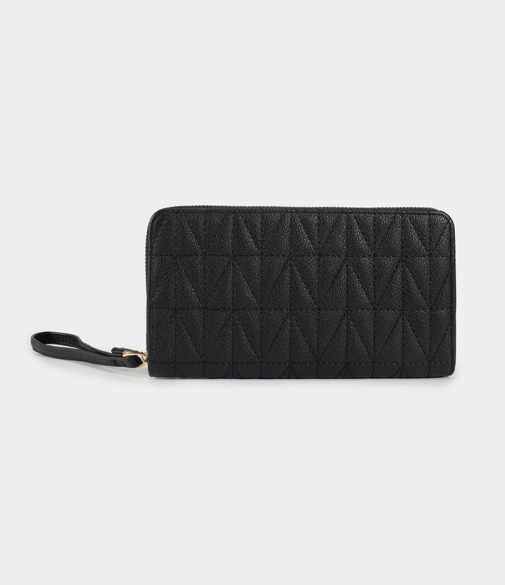 Portafogli rettangolare con manico, chiusura con zip e tasche interne.