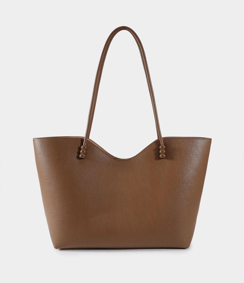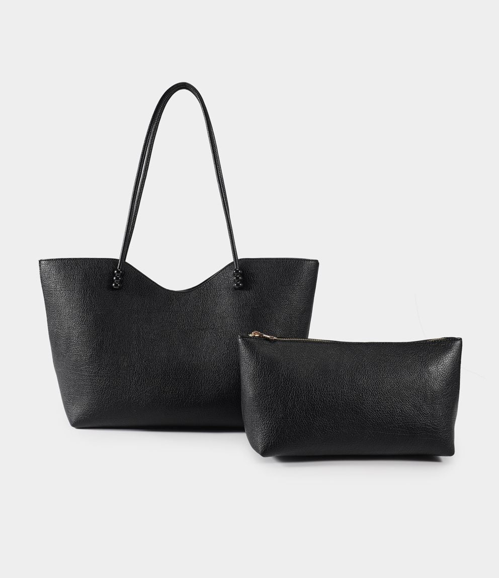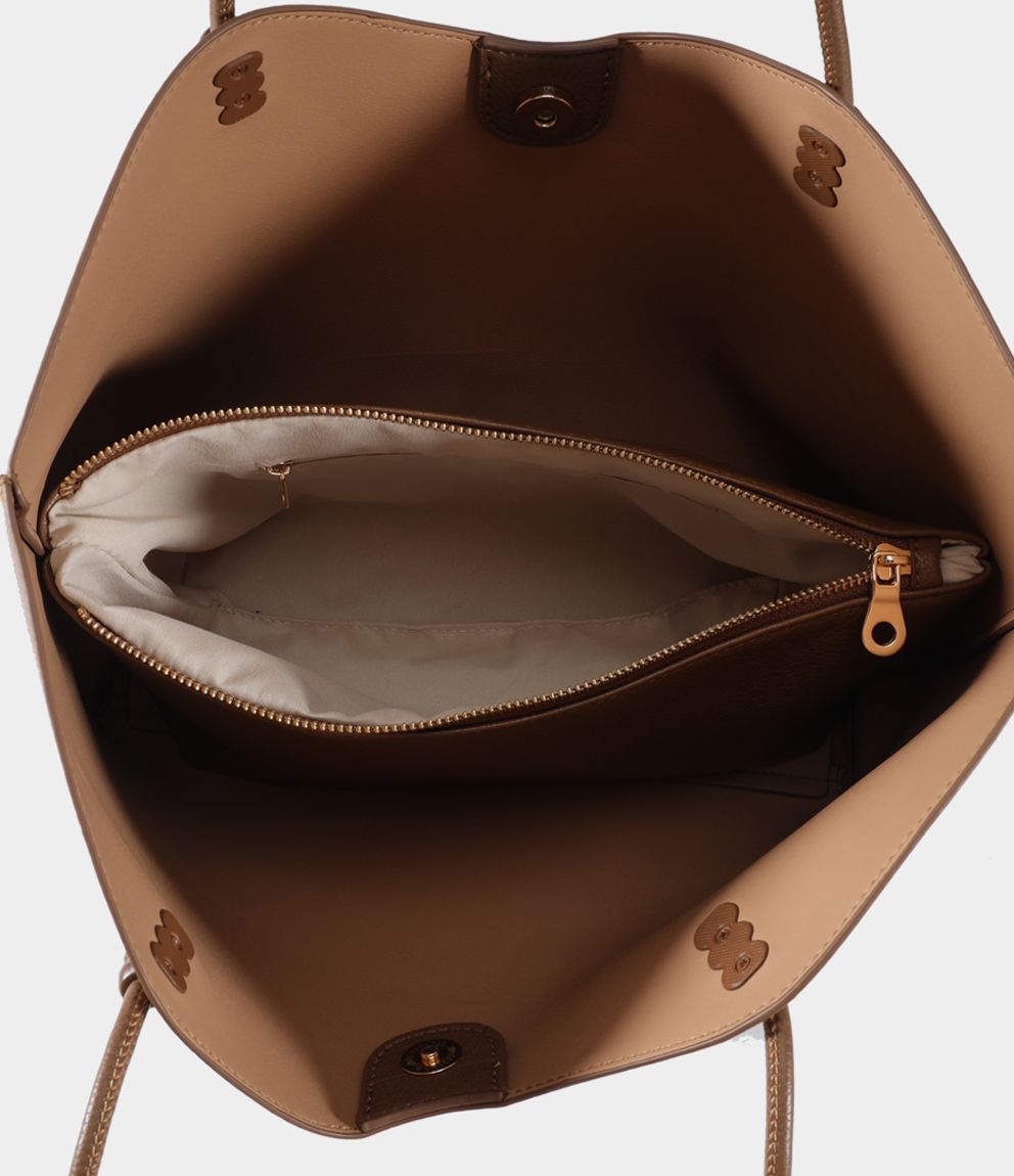Shopper con due manici, borsello interno estraibile. Chiusura del borsello con zip, chiusura della borsa con bottone a scatto.