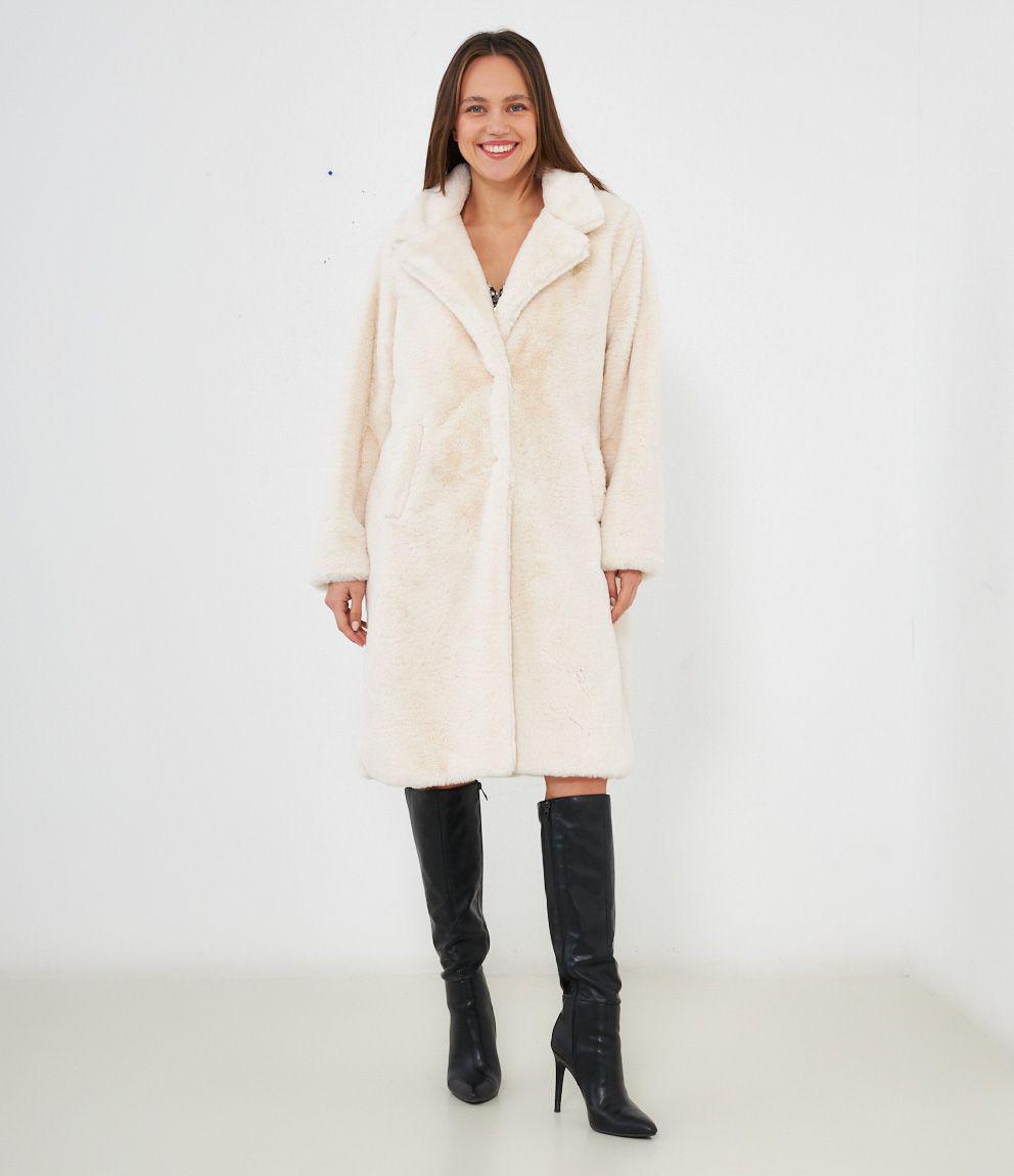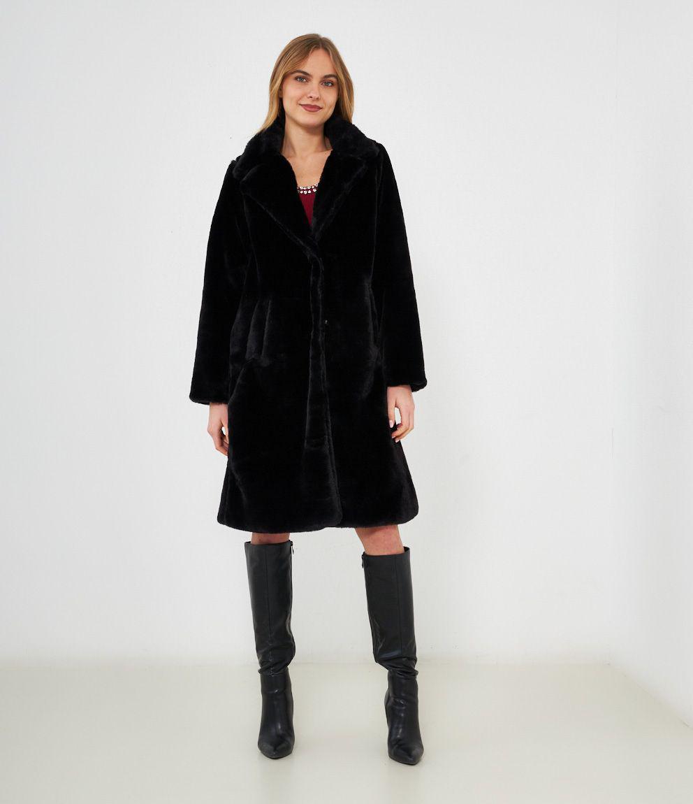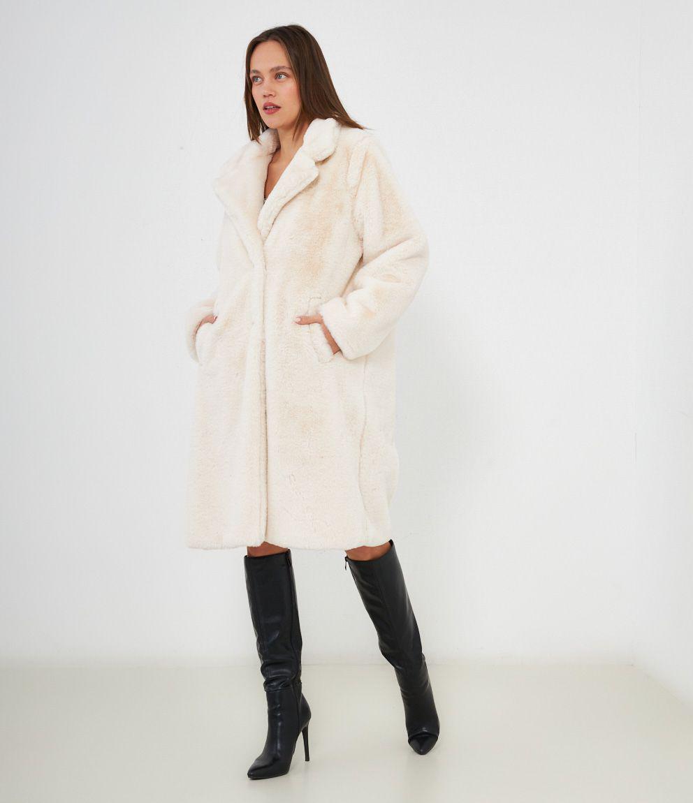 Pelliccia modello over con collo revers e chiusura con bottoni. Tasche laterali.