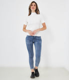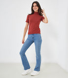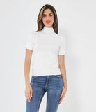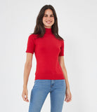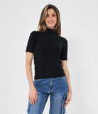 Maglia in viscosa con collo alto e mezze maniche con risvolti. Bordi elastici a costine.