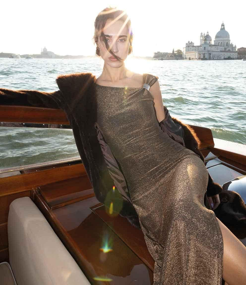 Abito lungo con spacco laterale, scollo con dettaglio metallico.