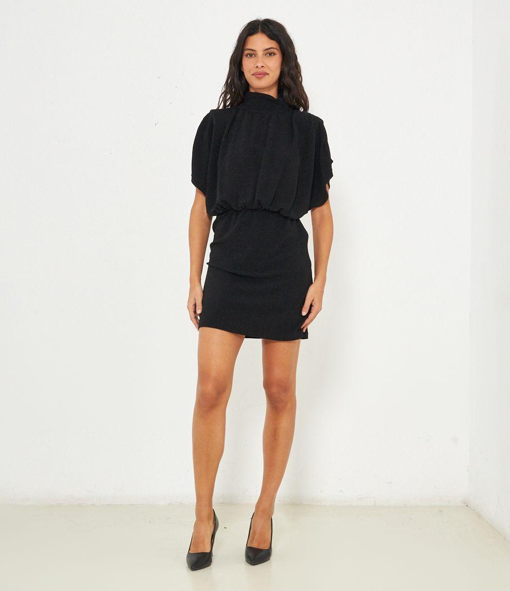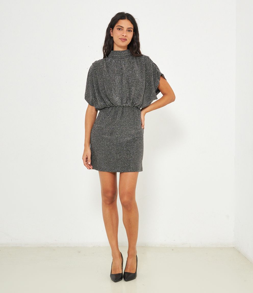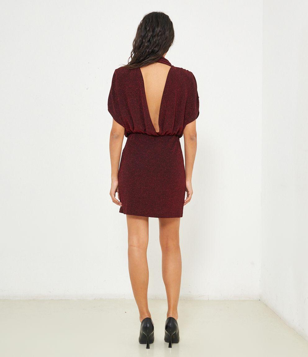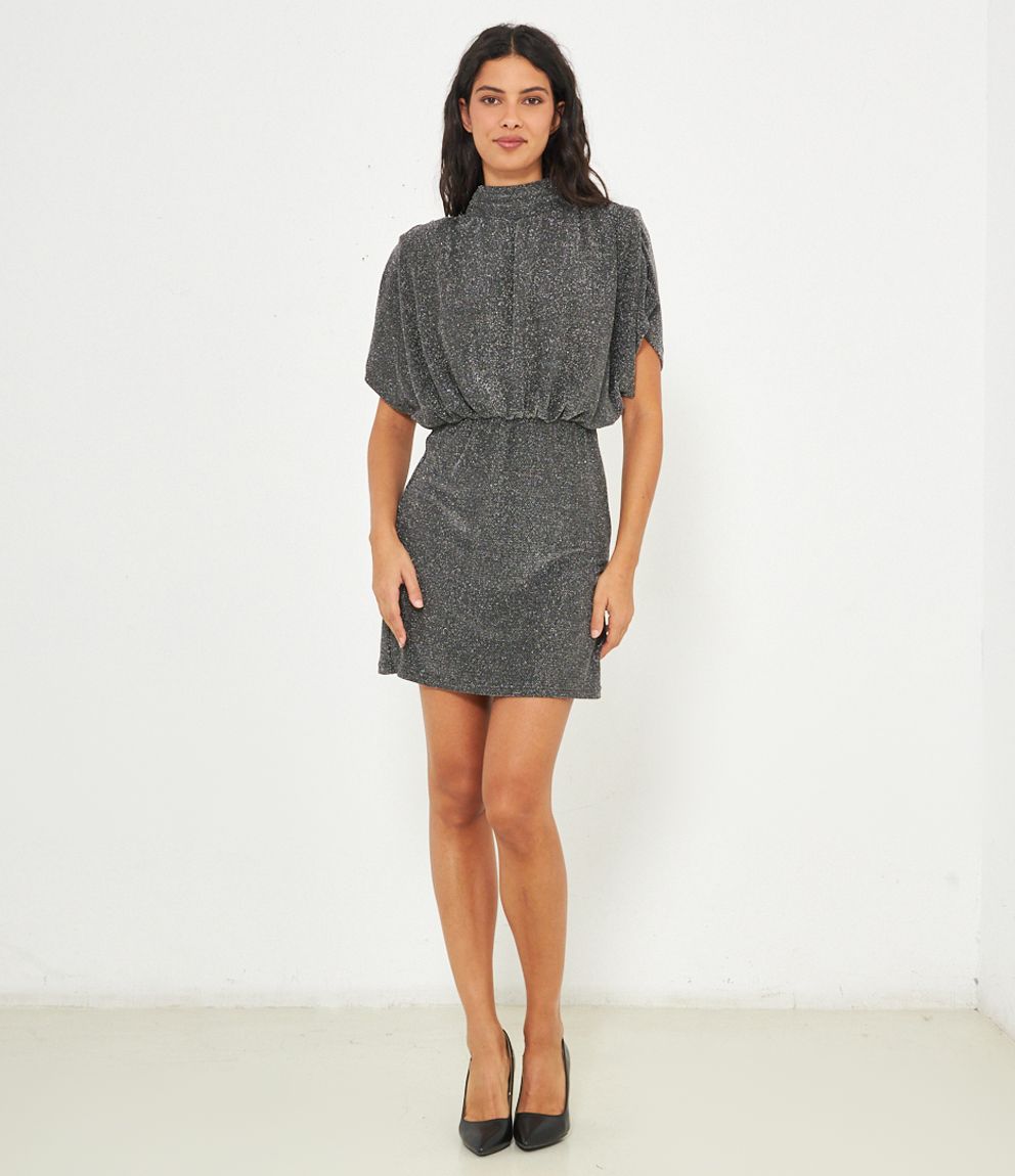 Abito modello mini in lurex con schiena scoperta. Maniche ampie e chiusura sul retro.