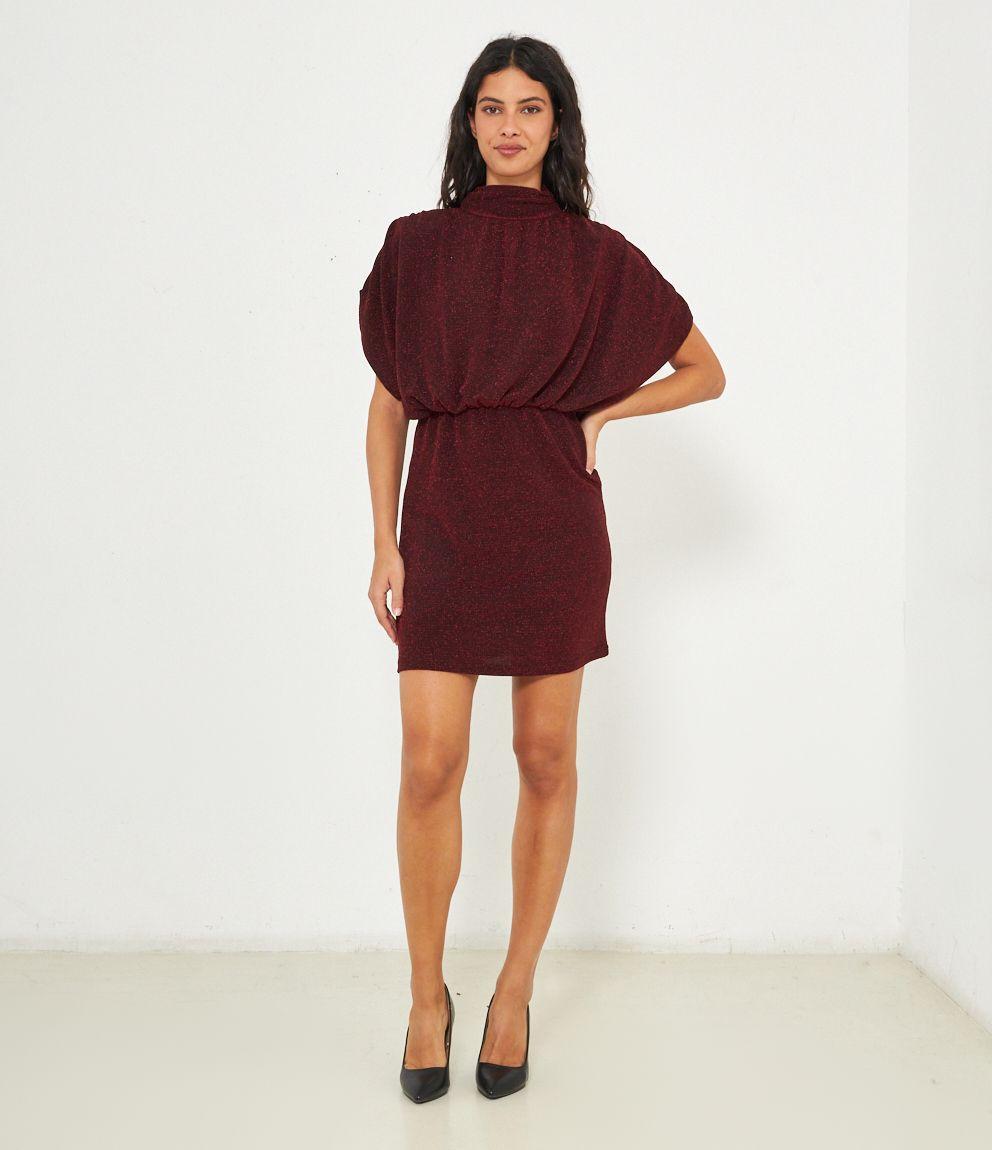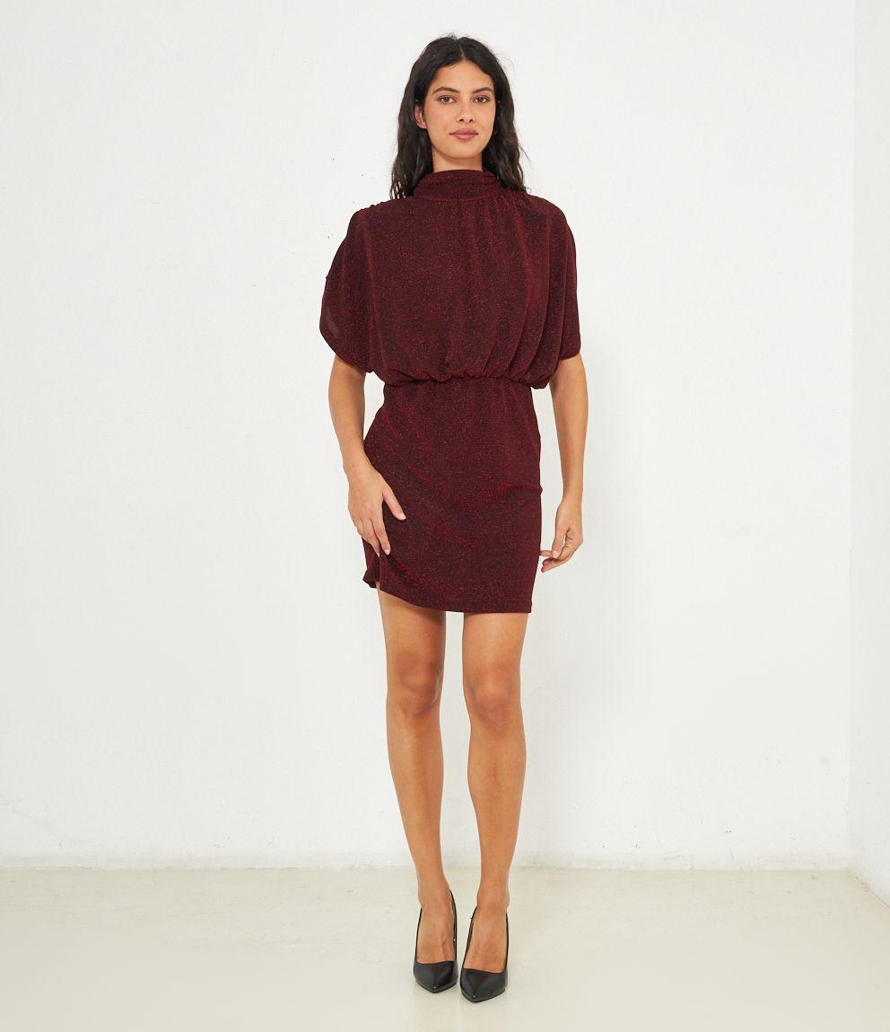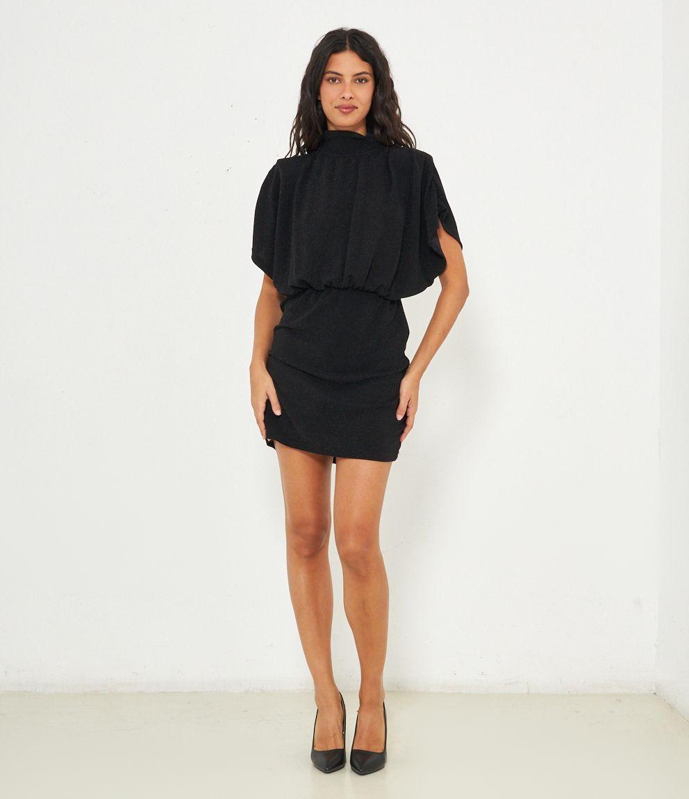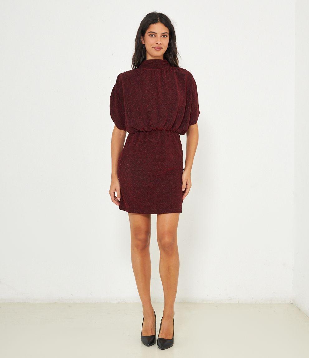 Abito modello mini in lurex con schiena scoperta. Maniche ampie e chiusura sul retro.